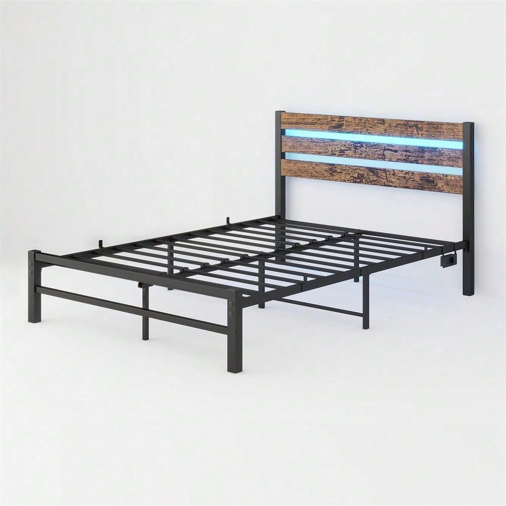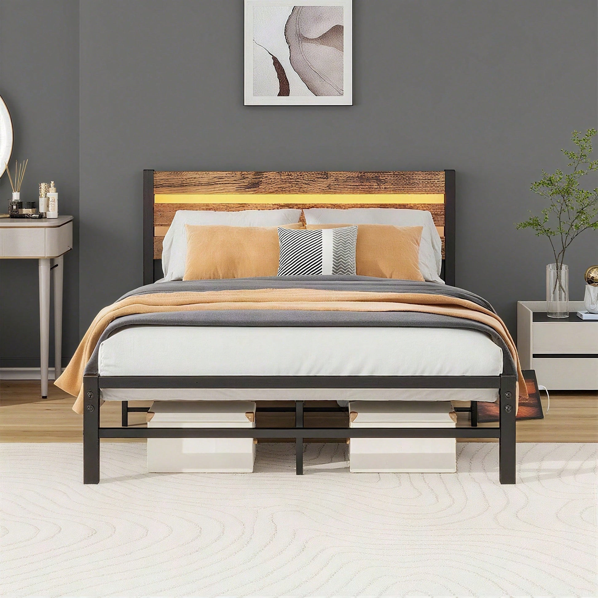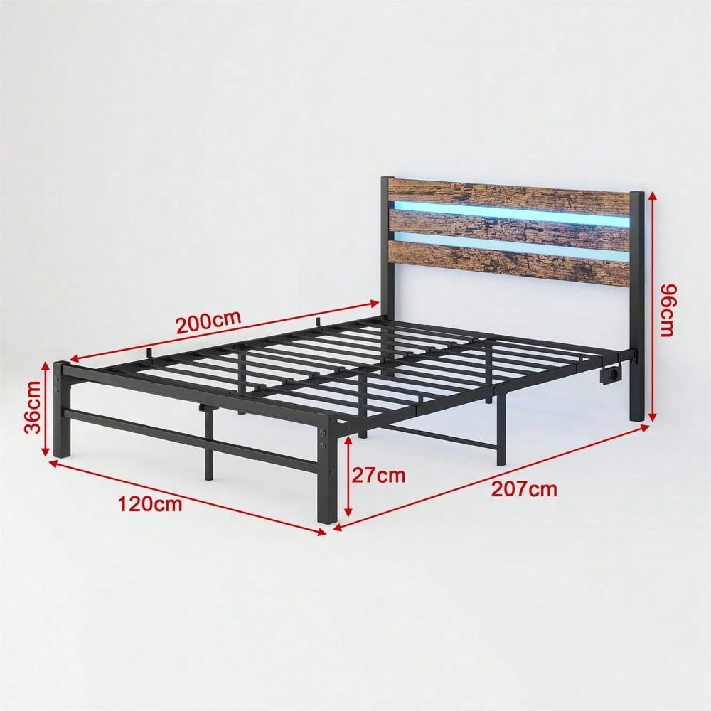 120x200cm Bettrahmen mit Kopfplatte, Metallbettrahmen mit USB-Ladestation, LED-Bettrahmen, Starke Stahlschicht-Unterstützung, Unter Bettlagerung, Keine Boxfeder erforderlich, Lärmfrei, Einfache Montag