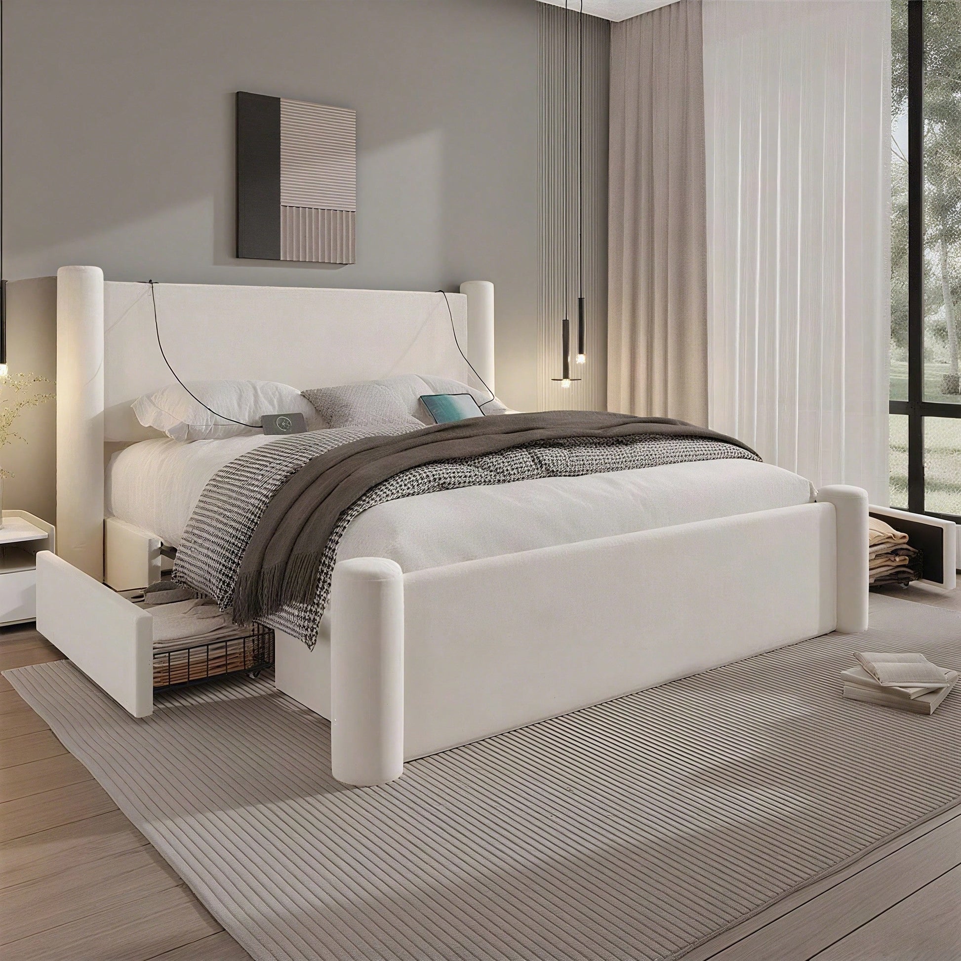 140x200 cm Bettgestell mit modernem Design, 3D-Säulen-Design, dick gepolsterte Kopfteil, 2 Stauraumschubladen und integrierte USB-Anschlüsse für praktischen Komfort und Stil im Schlafzimmer, Beige