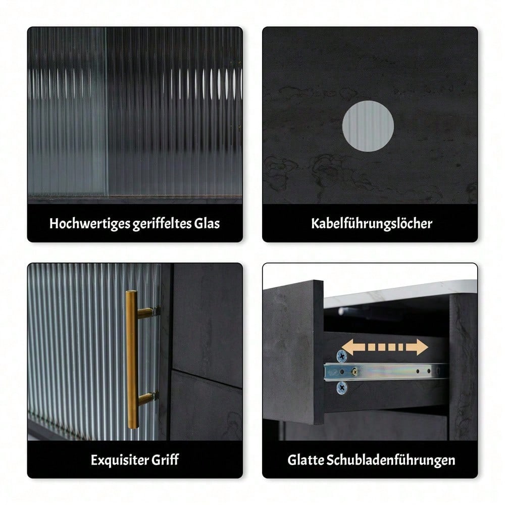 GERÄUMIG UND STILVOLL: Der 160 m lange TV-Ständer bietet Platz für einen 70-Zoll-Fernseher und eignet sich perfekt für ein beeindruckendes Unterhaltungszentrum. HOCHWERTIGE MATERIALIEN: Hergestellt aus strapazierfähigem MDF für eine lange Lebensdauer. Elegantes graues Muster: Die besondere Textur verleiht Ihrem Raum einen Hauch von Eleganz. Tischplatte in Marmoroptik: Die Tischplatte ist mit einem Dekor in Marmoroptik versehen, das ein luxuriöses Gefühl in Ihr Wohnzimmer bringt. Effizientes Kabelmanagement: 2 Löcher auf der Rückseite für einen sauberen Look und ohne störende Kabel. Organisierte Aufbewahrung: 4 Schubladen mit Push-to-open-Funktion bieten reichlich Stauraum. Stilvolle Glaspaneele: 2 vertikal gestreifte Glastüren und Stauraum auf der Rückseite sorgen für einen Hauch von Eleganz. Hinweis: Dieses Produkt besteht aus 2 Paketen und kommt möglicherweise nicht gleichzeitig an. Bitte vergewissern Sie sich, dass beide Pakete angekommen sind, bevor Sie mit dem Zusammenbau beginnen! Hinweis: Bei der Verwendung der 4 Schubladen wird empfohlen, auf die Mitte der Schublade zu drücken, nicht auf die Seiten.