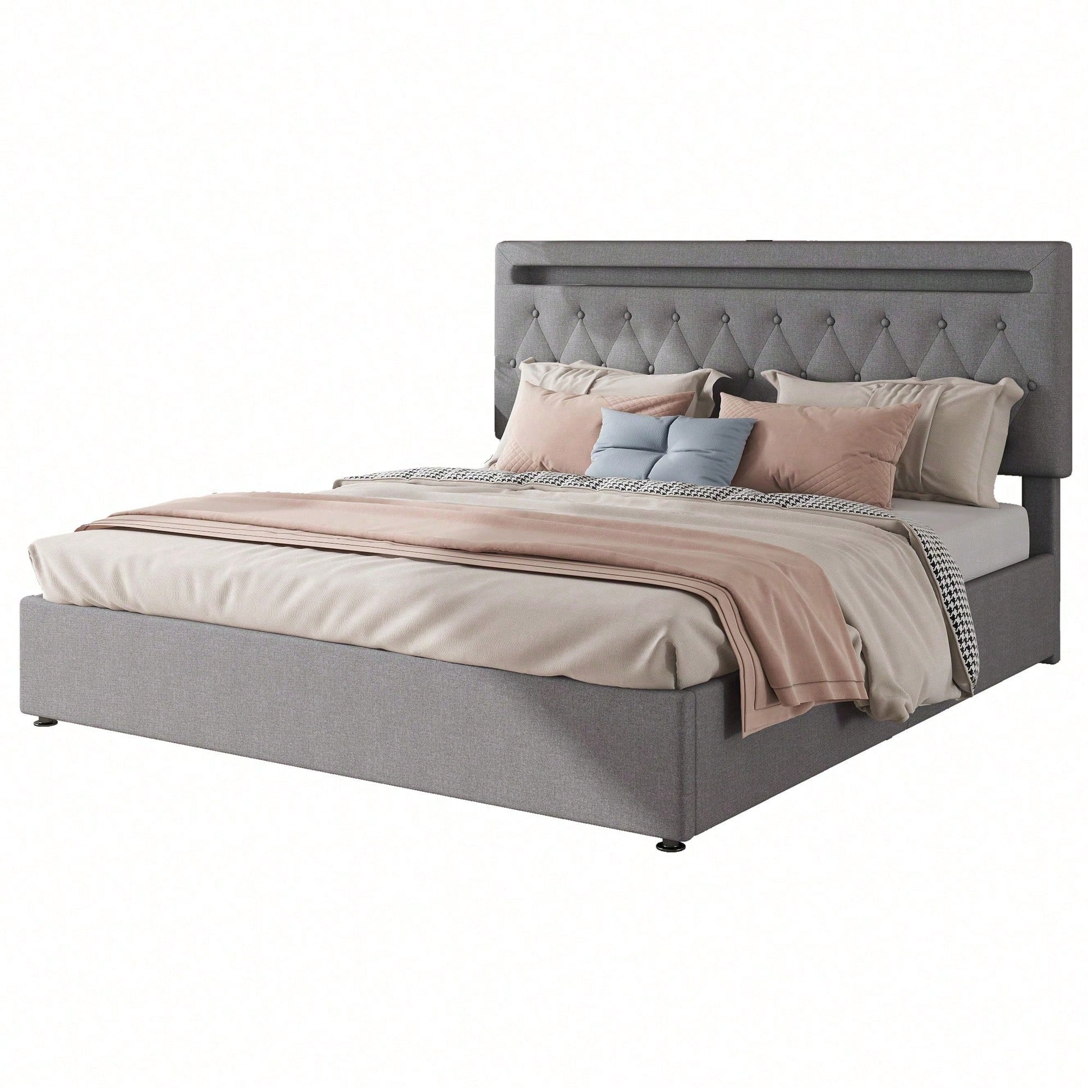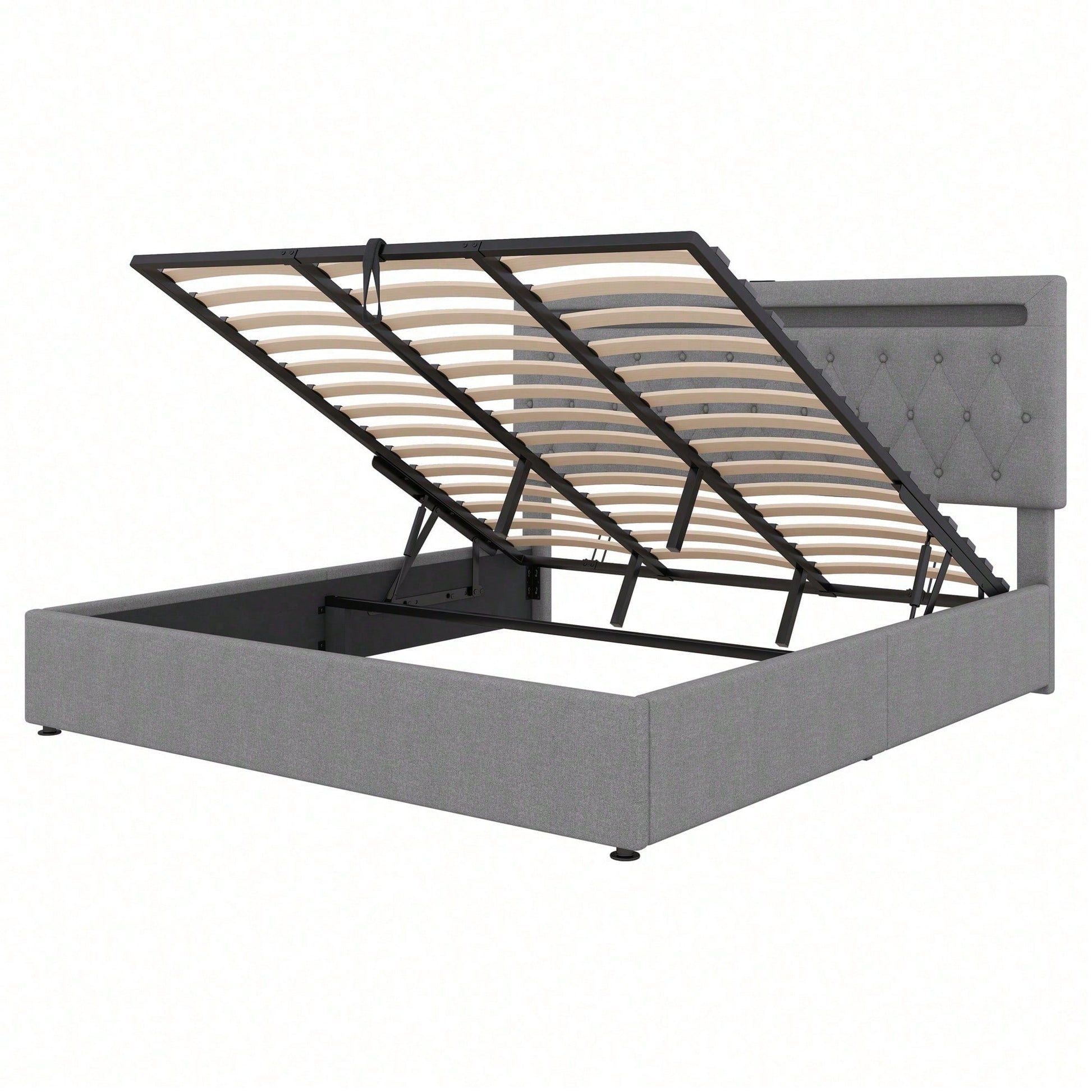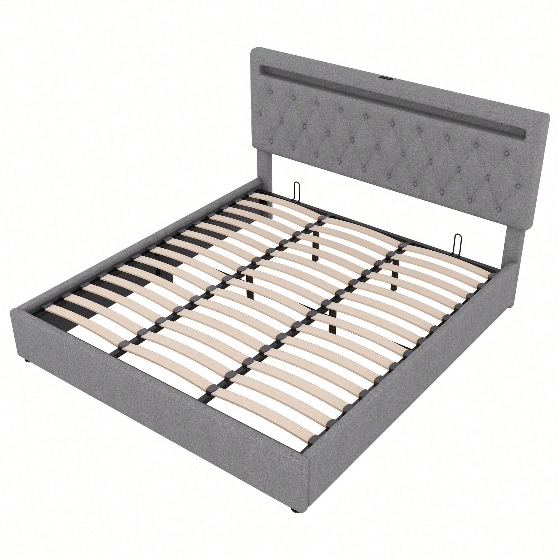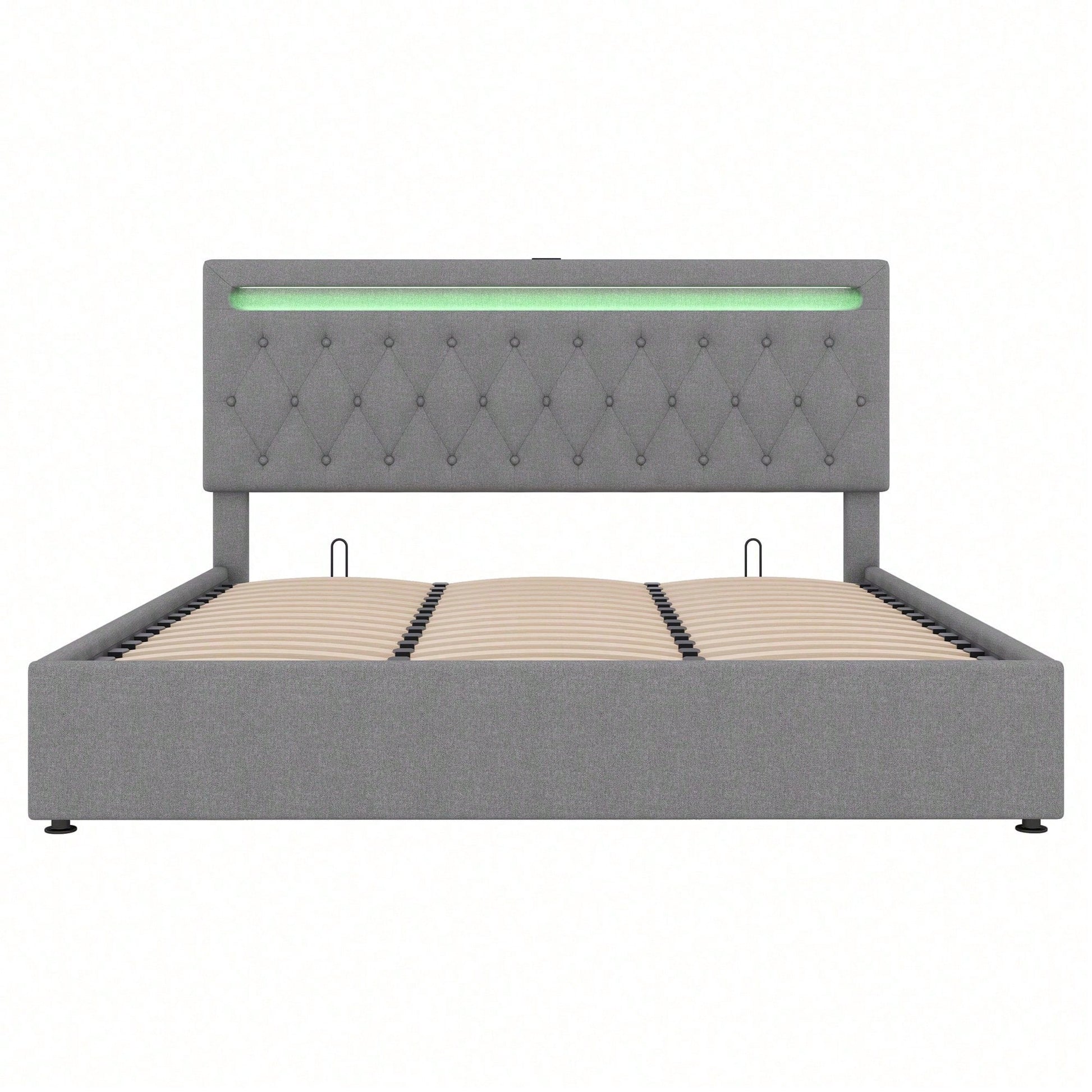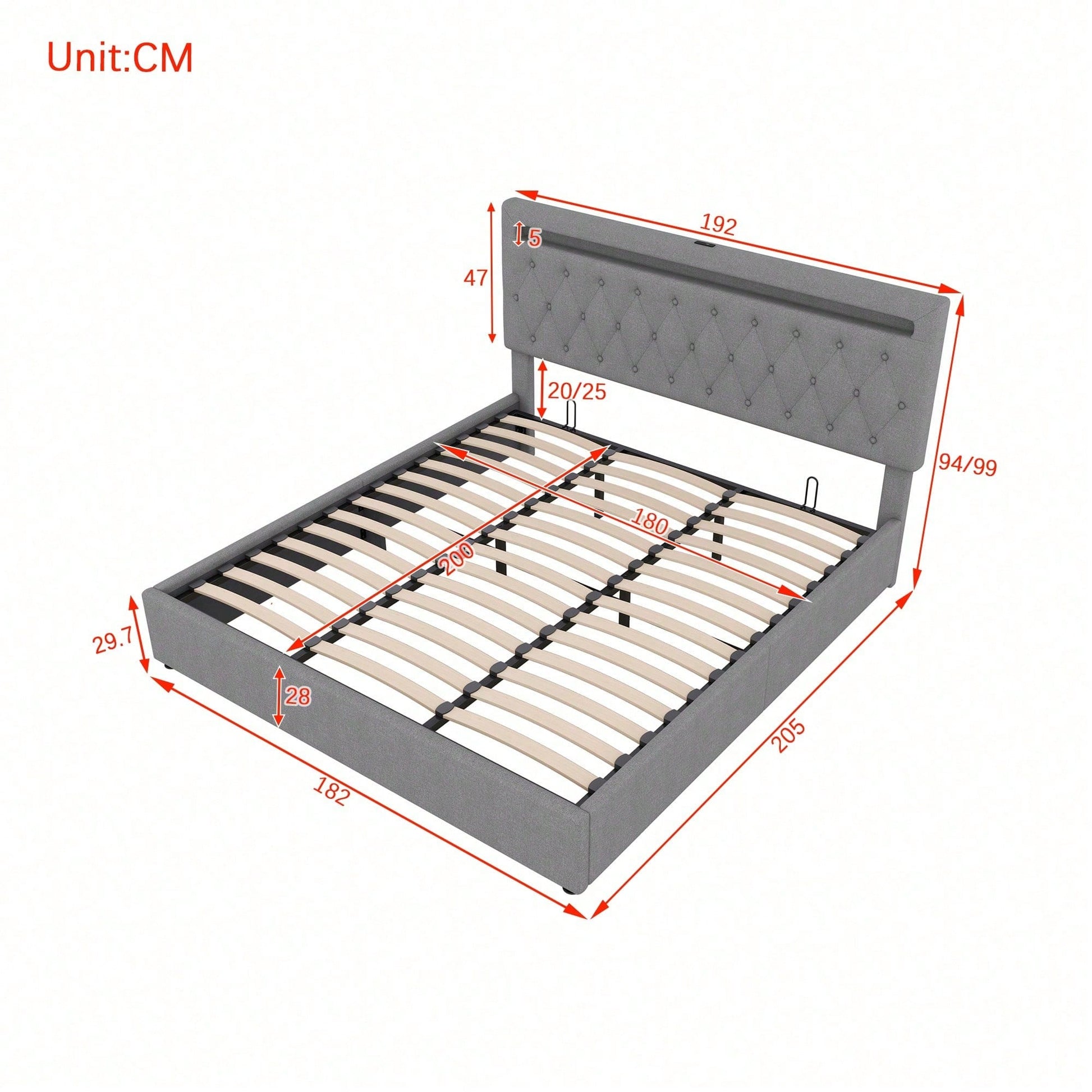 180*200cm Flachbett, gepolstert, hydraulisches Bett mit Hebemechanismus, farbwechselndes Umgebungslicht, Fernbedienung, USB-Anschluss, grau