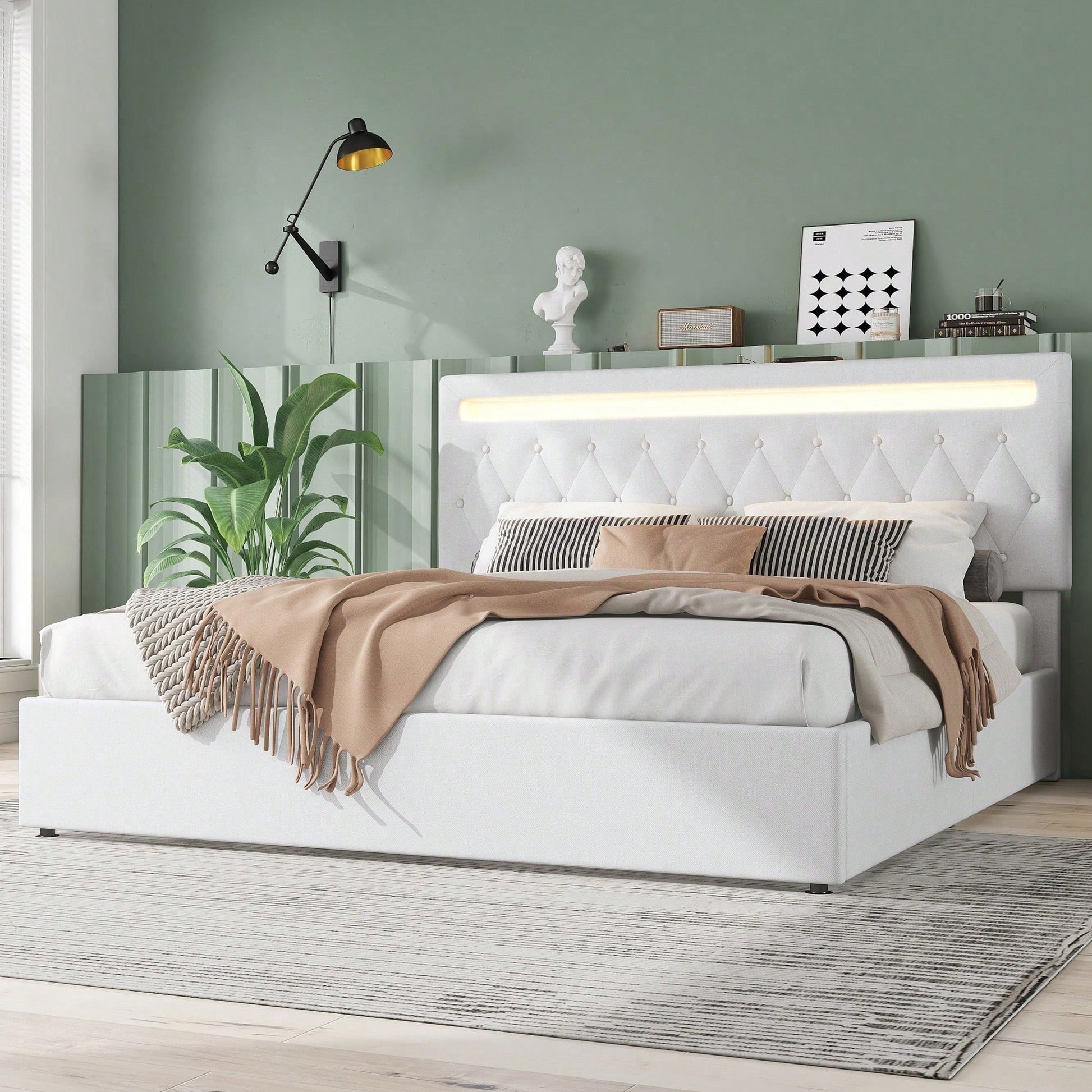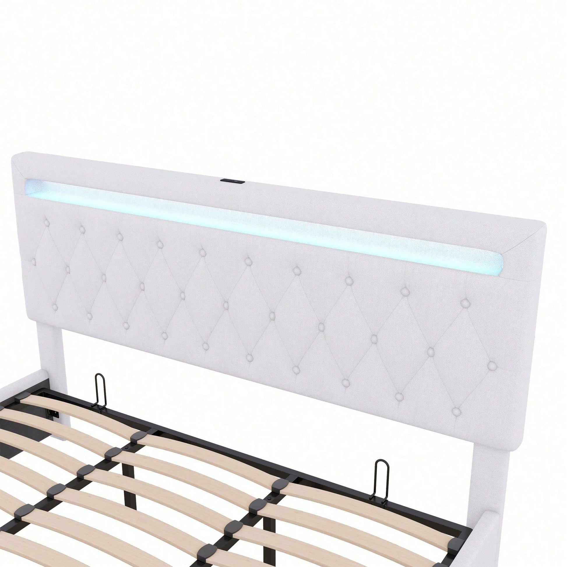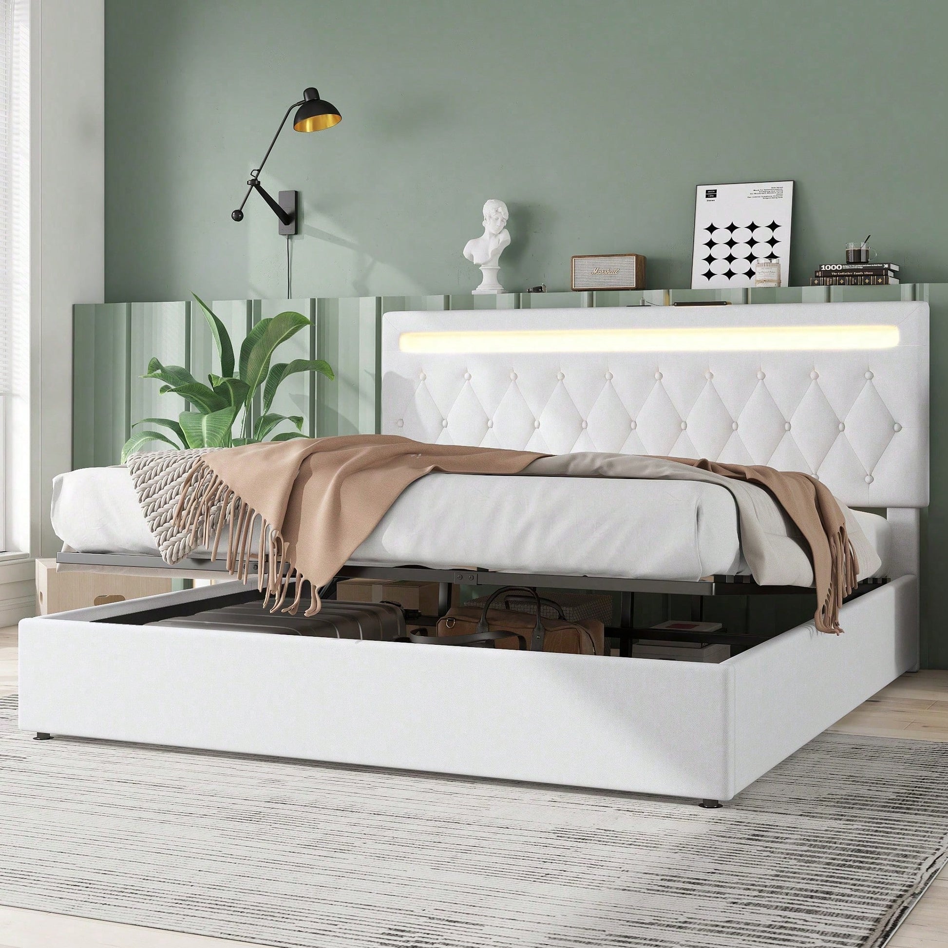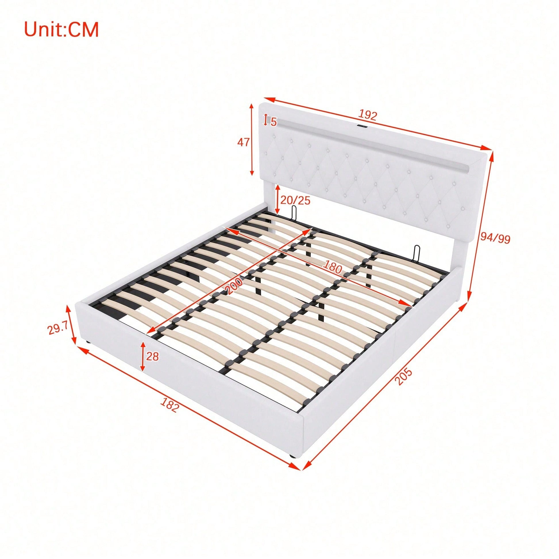 180*200cm Flachbett, gepolstert, hydraulisches Bett mit Hebemechanismus, farbwechselndes Umgebungslicht, Fernbedienung, USB-Anschluss, grau