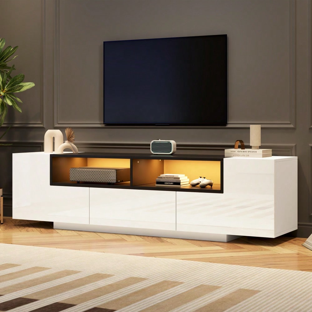 180*40*48cm Standfernsehschrank,Lowboard Mit LED-Licht,Fernsehschrank mit L-Form und Schubladen,Wohnzimmerschrank, TV-Ständer,TV-Schrank in Hochglanzweiß,Geeignet für 75-Zoll-Fernseher,Weiß+Schwarz