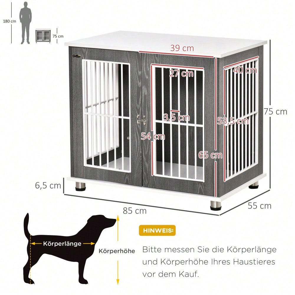 3-in-1 Hundetransportbox mit Tischplatte | Hundehütte aus Holz mit Kissen & Kleintierkäfig | Nutzbar als Beistelltisch | Grau-Weiß | 85x55x75 cm | von PawHut