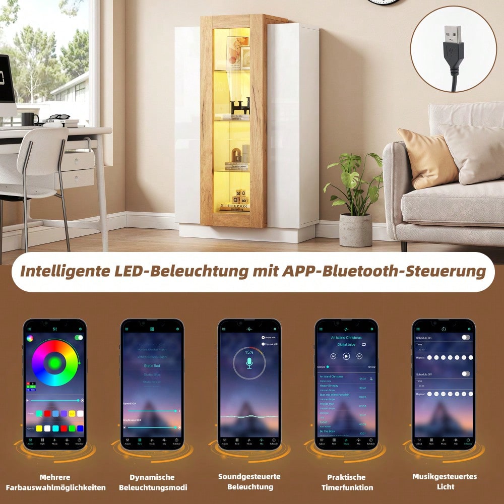 Gesamtgröße: Die Wohnzimmervitrine hat die Maße 74 x 40 x 120 cm. Es optimiert die Raumausnutzung durch eine vierschichtige dreidimensionale Struktur und ist mit drei Glastrennwänden ausgestattet (empfohlene Tragkraft 2 kg). Es ermöglicht die geordnete Präsentation von Büchern, Sammlungen usw. und trägt so zur Schaffung eines mehrschichtigen Ausstellungsraums bei. LED: Ausgestattet mit LED-Lichtstreifen, die über eine Handy-App gesteuert werden und die DIY-Anpassung von zig Millionen Farben unterstützen. Die transparente Schranktür aus Acryl (vorne) lässt Licht eindringen und sich streuen und schafft so eine abwechslungsreiche Atmosphäre im Wohnzimmer, was dem Wunsch ausländischer Familien nach einem stimmungsvollen Wohnerlebnis entspricht. Rückprallschalter: Die Schranktür verfügt über einen Rückprallschalter, der die Komplexität herkömmlicher Griffe aufgibt und eine einfache Interaktion ermöglicht. Das Spanplattenmaterial ist sowohl langlebig als auch stabil und behält sein Aussehen und seine strukturelle Integrität über lange Zeit. Stilanpassung und optische Highlights: Die Farbgebung aus Weiß und Holzmaserung vereint Schlichtheit und natürliche Textur; Die transparente Acryloberfläche durchbricht die Monotonie des Schranks und macht die Exponate sowie die Licht- und Schatteneffekte zum optischen Mittelpunkt des Raums. Sie passt sich modernen, nordischen und anderen Einrichtungsstilen an und trägt dazu bei, das ästhetische Niveau des Wohnzimmers zu steigern. Sicherheits- und Detailüberlegungen: Die Glastrennwand ist transparent und strukturiert, und das Acrylmaterial ersetzt gewöhnliches Glas, das sowohl kratzfest als auch verschleißfest und sicher ist. Der modulare Aufbau ermöglicht eine einfache Demontage und Montage Szenariobasierte Funktionserweiterung: Ob Bücherpräsentation, Sammlungspräsentation oder Grünpflanzenverzierung, der vierschichtige Aufbau und die variablen Lichteffekte lassen sich flexibel anpassen und machen die Vitrine zu einem kombinierten Träger von „Funktion + Ästhetik“ im Wohnzimmer, der den vielfältigen Lebensszenenbedürfnissen des Benutzers gerecht wird. Präzises Marktmatching: Retter für kleine Wohnungen! Die geringe Breite von 74 cm und die 120 cm hohe Decke erweitern den vertikalen Raum. Bücher, Trophäen und Grünpflanzen werden schichtweise angeordnet und das Wohnzimmer der Überseewohnung wird im Handumdrehen „erweitert + erneuert“. Differenzierte Wettbewerbsfähigkeit: Verwenden Sie „intelligenten Lichteffekt + transparentes Acryldesign“, um eine Wohnzimmeratmosphäre zu schaffen, die sich von der Einzelaufbewahrungseigenschaft herkömmlicher Vitrinen unterscheidet. Details wie die Rebounder-Interaktion und die Haltbarkeit der Spanplatte zeigen die Produktdifferenzierung auf das Äußerste. Stromversorgung über USB – Wird mit einem 5 V 2 A USB-Kabel geliefert (USB-Stecker nicht im Lieferumfang enthalten), das an Ihren Fernseher, Computer, Ihre Powerbank usw. angeschlossen werden kann. Sicher und einfach in Innenräumen zu verwenden HINWEIS: Dieses Produkt besteht aus zwei Paketen und kommt möglicherweise nicht gleichzeitig an. Bitte stellen Sie sicher, dass beide Pakete angekommen sind, bevor Sie mit der Montage beginnen! Description Diese 74 x 40 x 120 cm große Wohnzimmervitrine verfügt über eine vierschichtige dreidimensionale Struktur mit Glastrennwänden zur optimalen Raumanzeige. Der LED-Lichtstreifen wird über eine Handy-App gesteuert und mithilfe der transparenten Schranktüren aus Acryl wird eine abwechslungsreiche Atmosphäre geschaffen. Der Rebounder-Schalter + Spanplattenmaterial sorgen für einfache Interaktion und Haltbarkeit. Das Farbschema mit weißer Holzmaserung eignet sich für mehrere Stile, die Glastrennwand + Acryl sorgt für Sicherheit, das modulare Design lässt sich leicht zerlegen und zusammenbauen und eignet sich für Szenen wie Bücher und Sammlungen. Durch die schmale Fläche lässt sich die Kapazität kleiner Wohnungen erweitern. Das Produkt zeichnet sich durch intelligente Lichteffekte und transparentes Design aus. Es wird in zwei Paketen geliefert und muss nach der Fertigstellung zusammengebaut werden. Details Größe 74 x 40 x 120 cm Farbe Weiß + Originalholzfarbe Material Spanplatte + gehärtetes Glas (Trennwand) + Acryl (Vordertür) Hervorhebungsposition Es gibt ein Highlight, den vorderen weißen Teil LED Mit LED-Leuchten, Steuerung über mobile App Bruttogewicht/Nettogewicht 1.N625P292159Z: 17.1kg/15.3kg 2. N625P292158Z:25.7kg/23.45kg Wie viele Schichten hat das Gesamtdesign? 4 Anzahl der Türen 3 Verkaufsargumente 3 Türen/Hochglanz/LED/Großer Stauraum/Farbkombination/Schlichtes Design