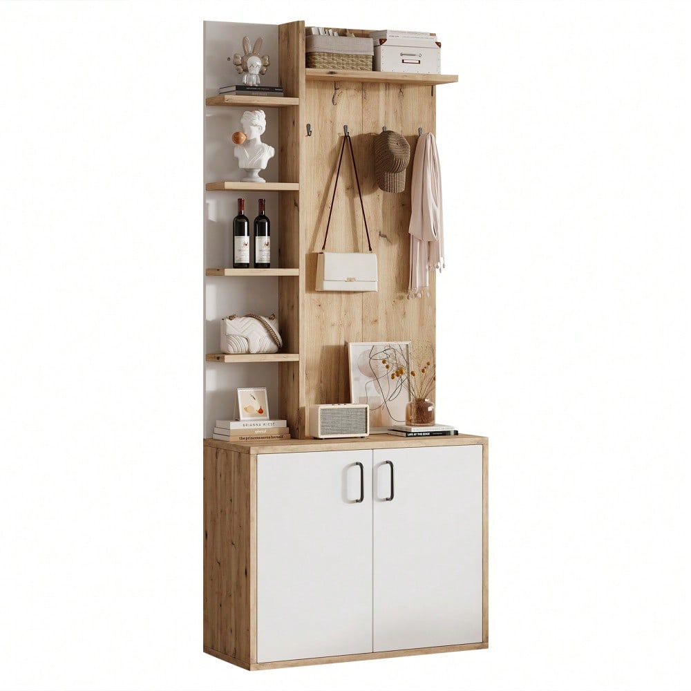 75*33*180cm Garderobenständer mit Garderobe, Schuhaufbewahrung, Flurausstattung mit Kleiderhaken, Flurschrank mit 5-lagiger Stauraumeinteilung und Stauraumschränken, Original Holzfarbe + weißes