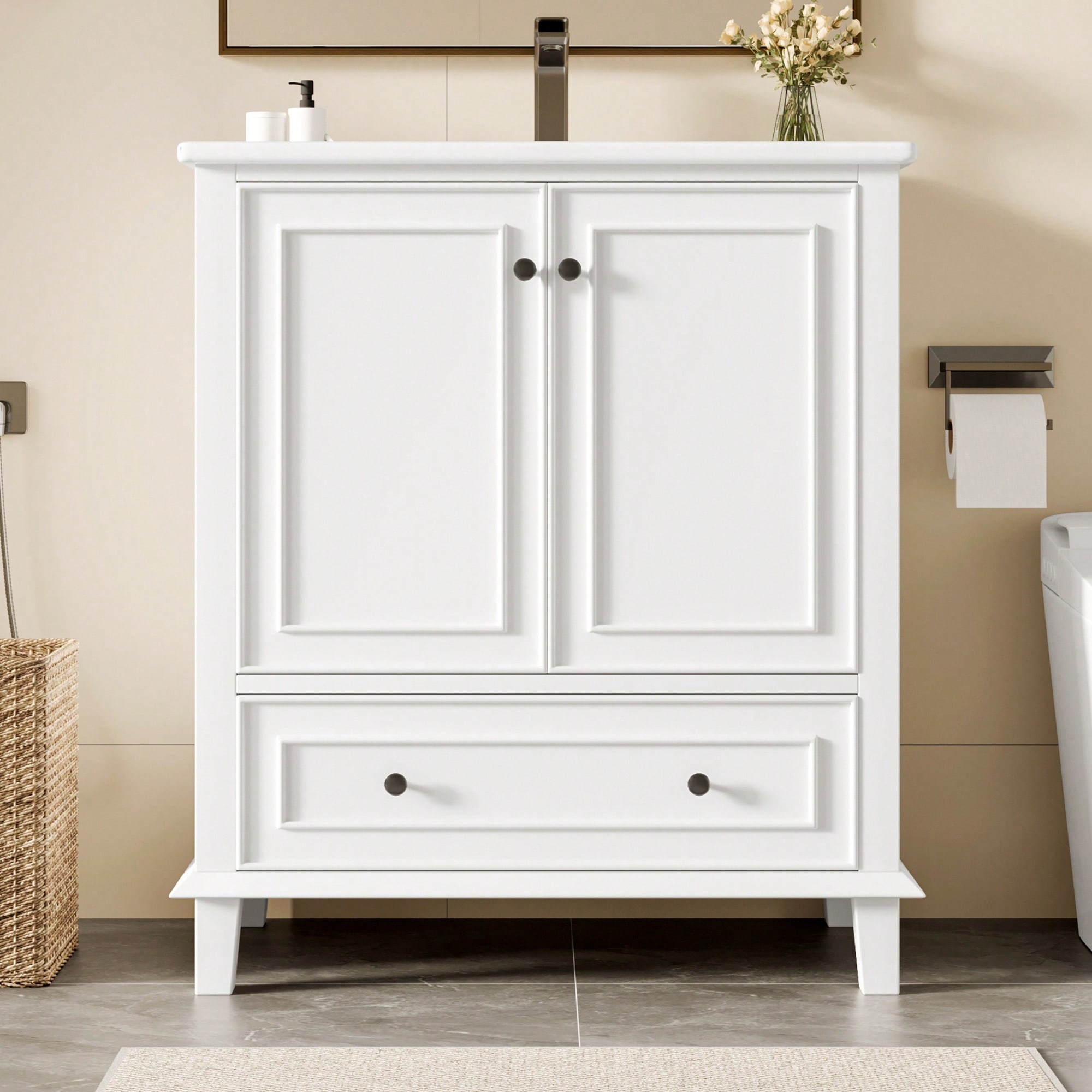 76x46x87cm Bodenstehender Badezimmerschrank mit Waschbeck, Waschtisch,Beine aus Massivholz, Volllackierung, feuchtigkeits- und wasserdicht, großer Stauraum, integriertes Keramikwaschbecken, weiß