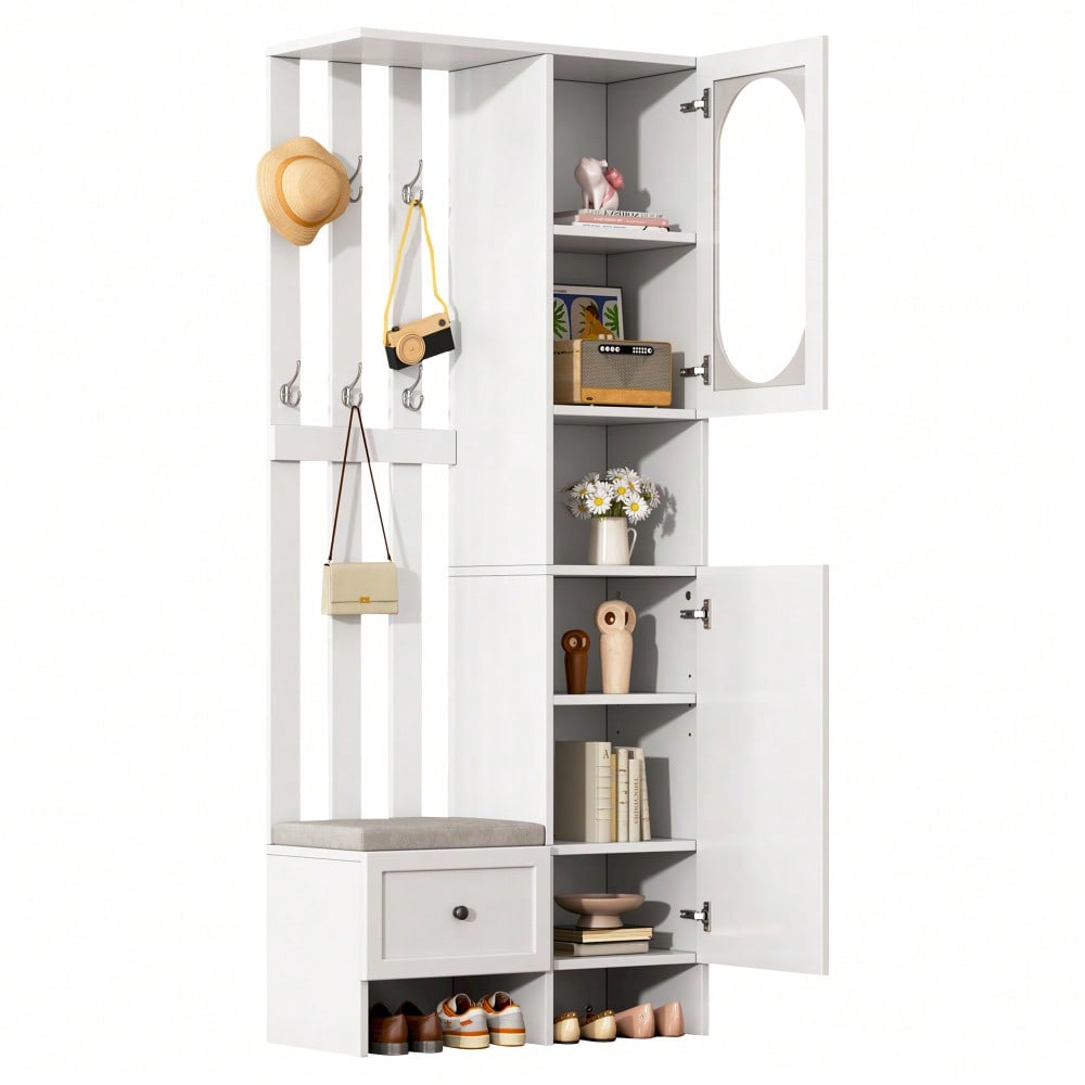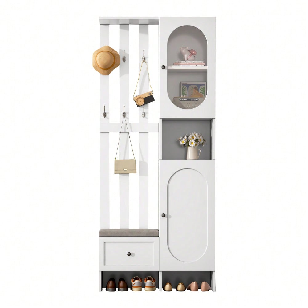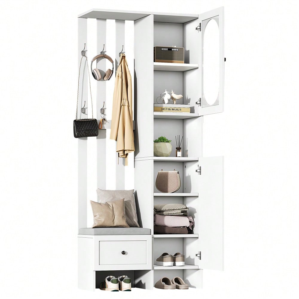 85*33.5*200cm Kompaktgarderoben,Startseite Möbel Mit 2 Schränken,Aufbewahrungsschrank aus gehärtetem Glas, Garderoben-Set Weißer Eingangsschrank, Garderobenständer mit Schuhbank und Polster