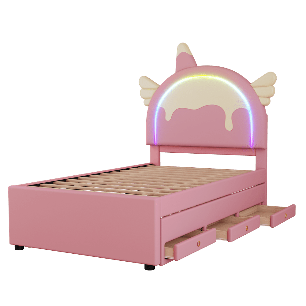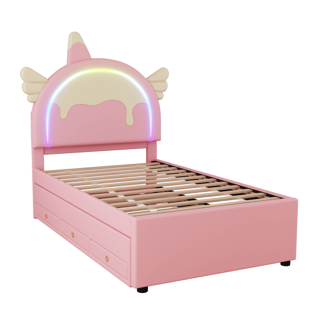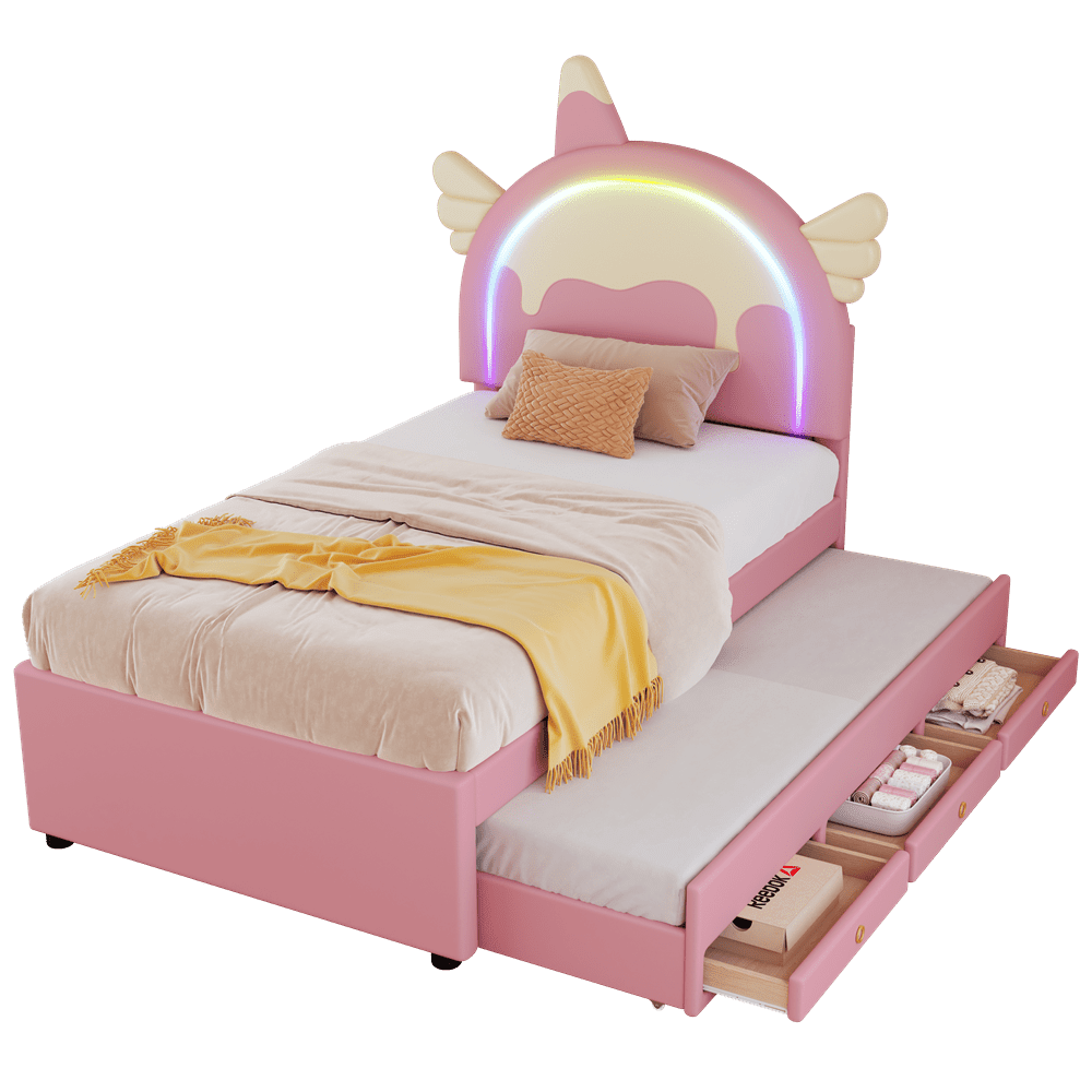 90*200cm Cartoon Kinderbett, Einhornform, ausgestattet mit ausziehbares rollbett, PU-Material, rosa