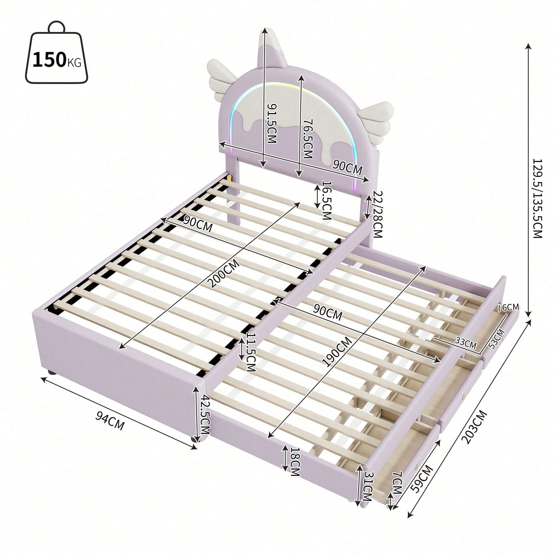 Product Information Item Code: WX000533AAI Product Type: Combo Item Product Name: 90*200cm Cartoon Kinderbett, Einhornform, ausgestattet mit ausziehbares rollbett, PU-Material,Violett Main Color: Purple Main Material: PU Product Dimensions Assembled Length (cm): 203.00 Assembled Width (cm): 94.00 Assembled Height (cm): 135.50 Product Weight (kg): 49.00 Package Size Sub-item 1: WF321153AAI Package Quantity: 1 199 * 34.5 * 12 cm 26.8 kg Sub-item 2: WF321150AAI Package Quantity: 1 93.5 * 70.5 * 14.5 cm 28.2 kg Product Features Hochwertige Materialien: dieses Bett ist aus PU und MDF, beide Materialien haben eine ausgezeichnete Haltbarkeit und Stabilität, nicht leicht zu verformen und zu knacken, um die Sicherheit und Lebensdauer des Bettes zu gewährleisten. Einzigartiges Cartoon-Design: Dieses Bett hat eine einzigartige Cartoon-Einhorn-Form, die das eintönige Design des traditionellen Bettkopfes durchbricht und die Gesamterscheinung des Bettes lebendiger und schöner macht, im Einklang mit dem modernen Kinderzimmer-Dekorationsstil, kann schnell die Aufmerksamkeit der Kinder auf sich ziehen, ihre Phantasie und Kreativität anregen. Multifunktionales ausziehbares Rollbett design: Dieses Bett ist speziell mit einem ausziehbares rollbett mit Schubladen darunter ausgestattet, das nicht nur einen bequemen Schlafplatz für Kinder bietet, sondern auch die allgemeine Praktikabilität des Bettes erhöht. Leicht zu reinigen und zu pflegen: Das Oberflächenmaterial des Bettes ist leicht zu reinigen, selbst wenn die Kinder beim Spielen auf dem Bett versehentlich schmutzig werden, können sie es leicht abwischen. Das Bett wird in Zwei Paketen aus Deutschland verschickt, manchmal kommen die Pakete zu unterschiedlichen Terminen an, aber auch um sicherzustellen, dass Ihre Erwartungen erfüllt werden, haben Sie bitte Geduld oder kontaktieren Sie unseren freundlichen Kundenservice.