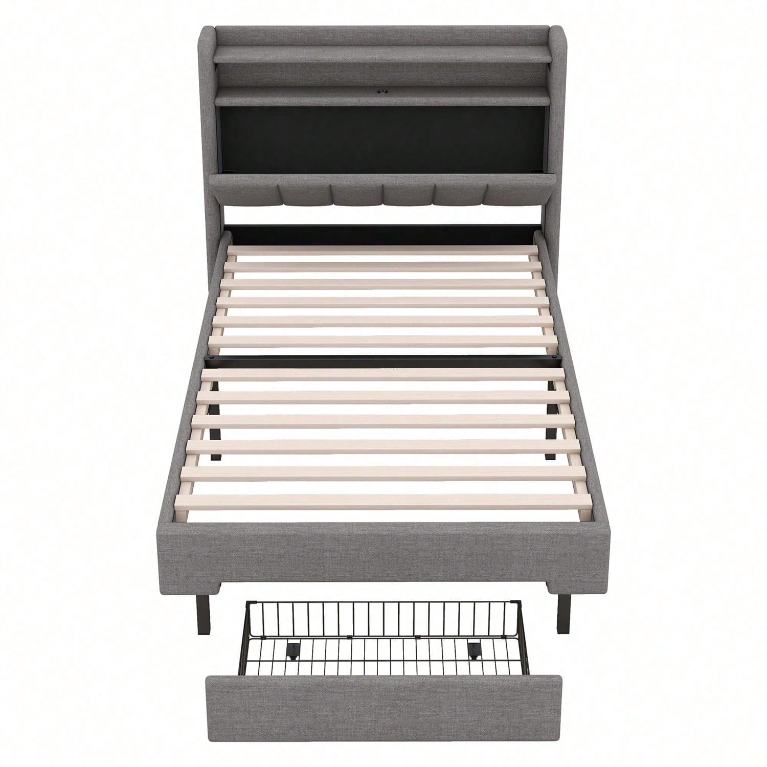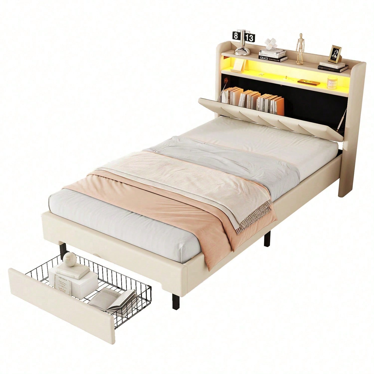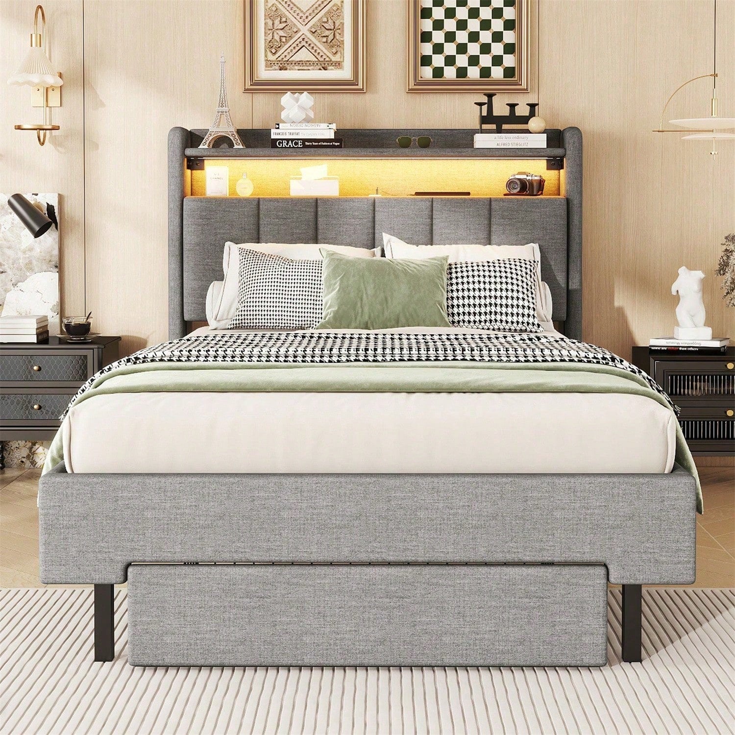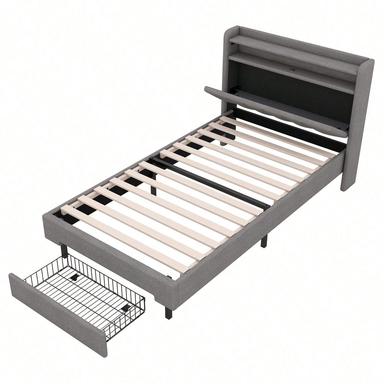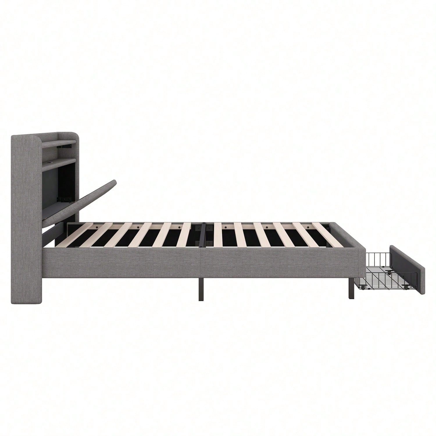 90*200cm Flachbett, Polsterbett, LED-Wärmelampe, USB-Steckdose, aufklappbares Kopfteil, eingebautes Staufach, Bettkästen, Grau