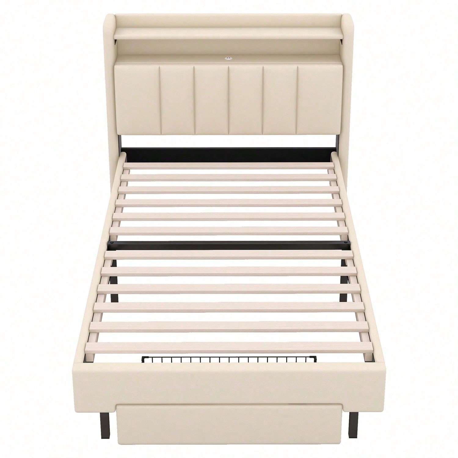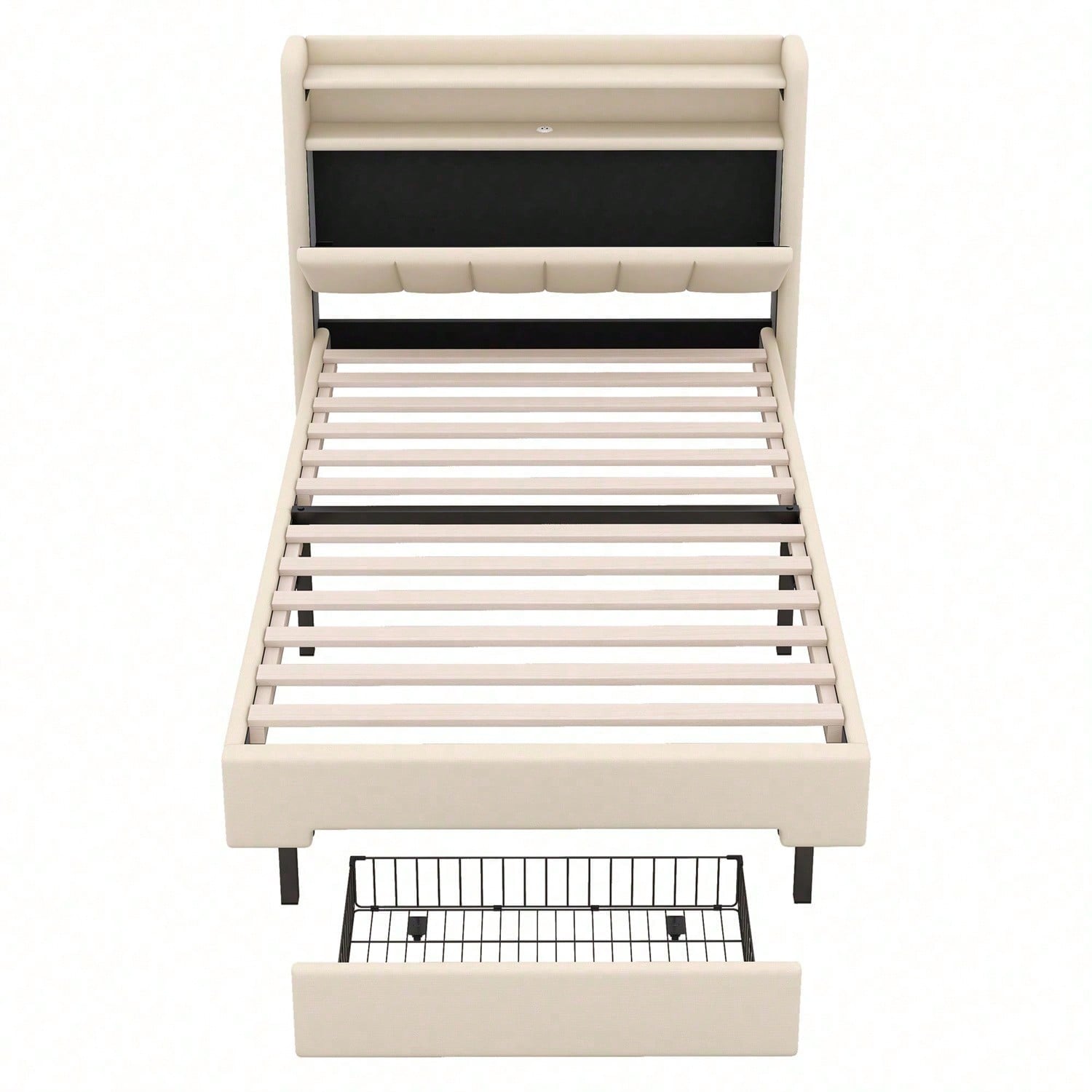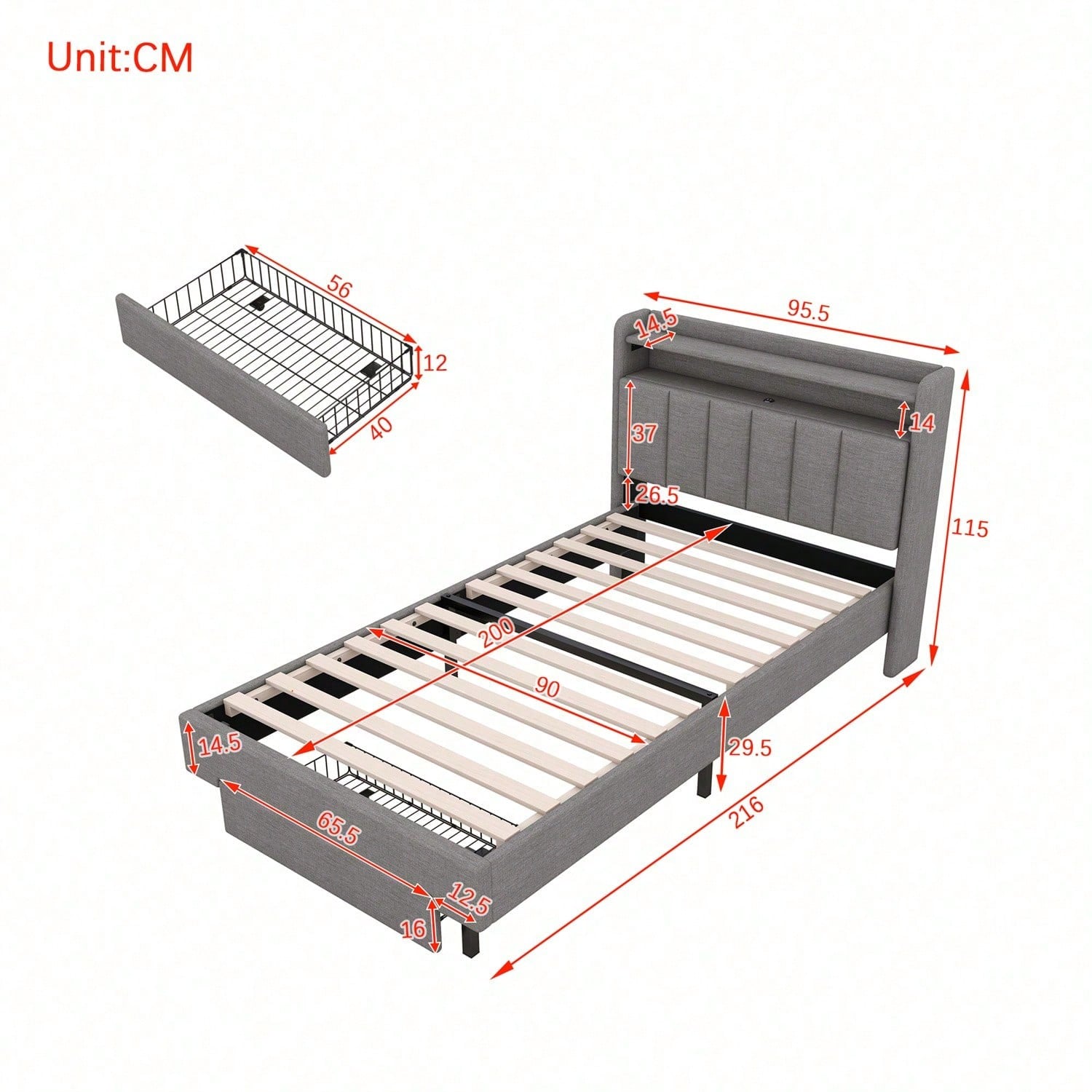 Specification Product Information Item Code: WF531041AAE Product Type: Single Box Product Product Name: 90*200cm Flachbett, Polsterbett, LED-Wärmelampe, USB-Steckdose, aufklappbares Kopfteil, eingebautes Staufach, Bettkästen, Grau Main Color: Gray Main Material: Cotton Linen Bed Size: 90cm*200cm Product Dimensions Assembled Length (cm): 216.00 Assembled Width (cm): 95.50 Assembled Height (cm): 115.00 Product Weight (kg): 27.00 Package Size Length (cm): 119.00 Width (cm): 63.50 Height (cm): 15.00 Weight (kg): 29.70 Product Features Qualitativ hochwertiges Material: Dieses Bett ist aus Baumwollleinen und MDF gefertigt, was ein robustes und langlebiges Bett mit einem angenehmen Griff gewährleistet. Das Baumwollleinen sorgt für ein weiches und hautfreundliches Schlaferlebnis, während die MDF-Platte für eine stabile Unterstützung und gleichmäßige Gewichtsverteilung sorgt, wodurch das Bett stabiler und zuverlässiger wird. LEDs für warmes Licht: Das Kopfteil verfügt über eine integrierte LED-Warmlichtleiste, die eine warme und gemütliche Atmosphäre im Schlafzimmer schafft. Dieses Licht ist weich und nicht grell, geeignet zum Lesen oder Ausruhen. Es kann auch als Nachtlicht verwendet werden, um ein weiches Licht für die Nacht zu bieten und die Sicherheit zu erhöhen. Ausgestattet mit einer USB-Ladebuchse: Dieses Bett ist mit einem USB-Stecker im Kopfteil des Bettes ausgestattet, mit dem Sie jederzeit Mobiltelefone, Tablets und andere elektronische Geräte aufladen können. So entfällt die lästige Suche nach einer Steckdose und die Freizeit wird angenehmer. Viel Stauraum: Neben dem Stauraum im Kopfteil ist das Kopfende des Bettes mit Schubladen ausgestattet, in denen Kleidung, Bettzeug und andere Dinge bequem verstaut werden können. Dieses Design macht Ihr Schlafzimmer ordentlicher und organisierter und spart auch den Gebrauch von anderem Stauraum. Das Paket wird von Deutschland aus verschickt, der Versand nimmt einige Zeit in Anspruch, stellt aber auch sicher, dass Ihre Erwartungen erfüllt werden. Bitte haben Sie Geduld oder kontaktieren Sie unseren freundlichen Kundenservice.