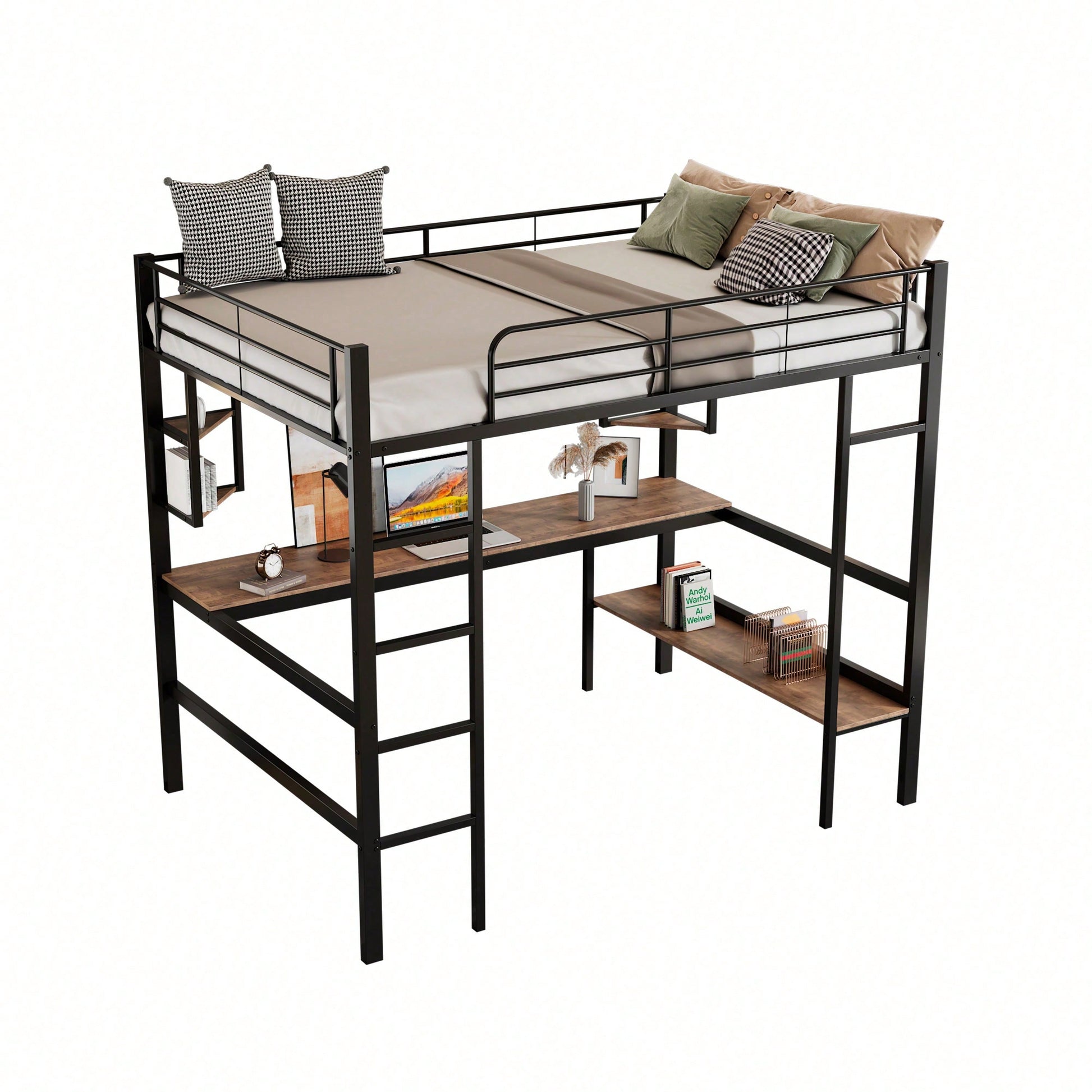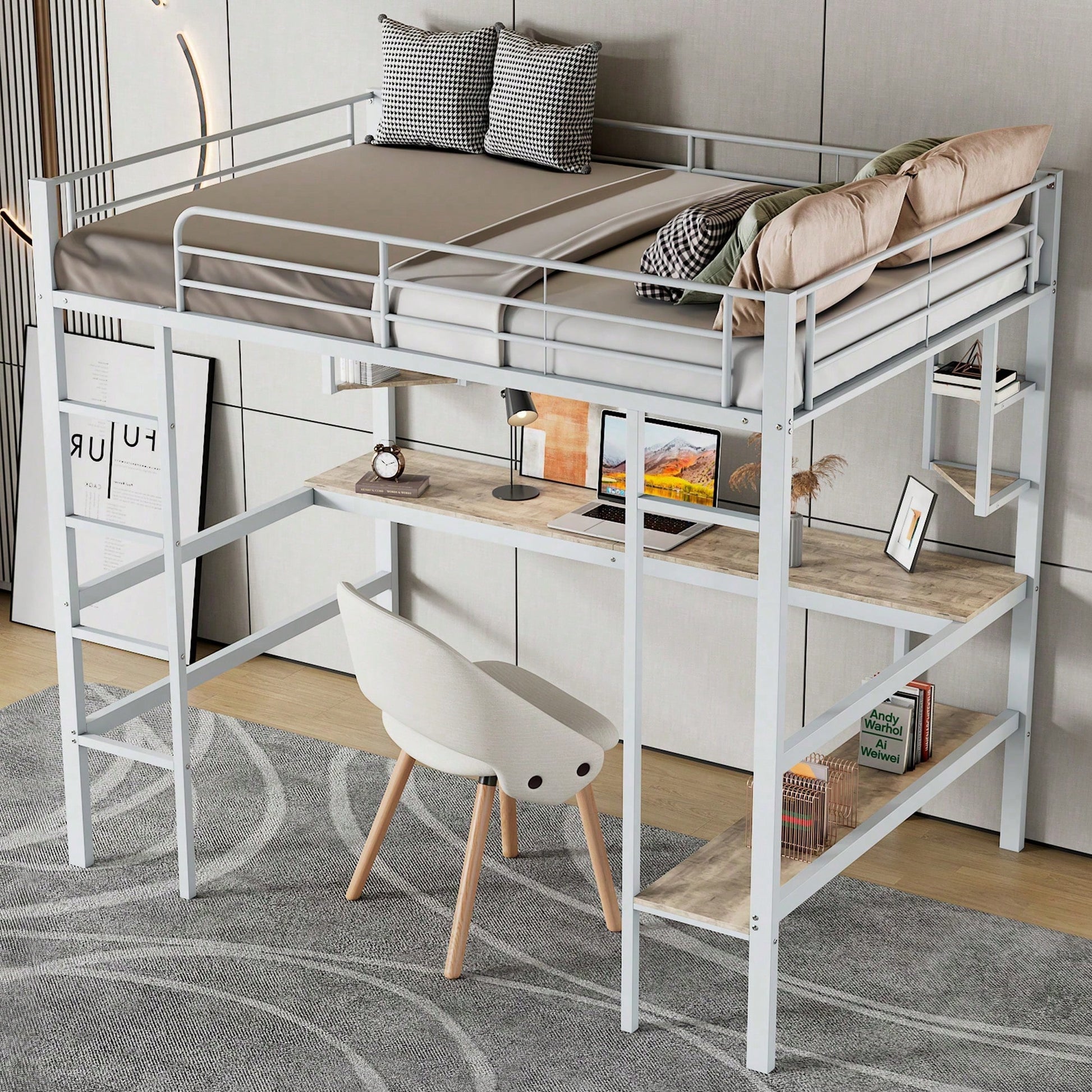 90x200cm Bettgestell Metallbett, Eisenbett mit Schreibtisch, Hochbett mit vier kleinen Regalen und einem großen Bücherregal für Kinder, Jugendliche und Erwachsene, Weiß