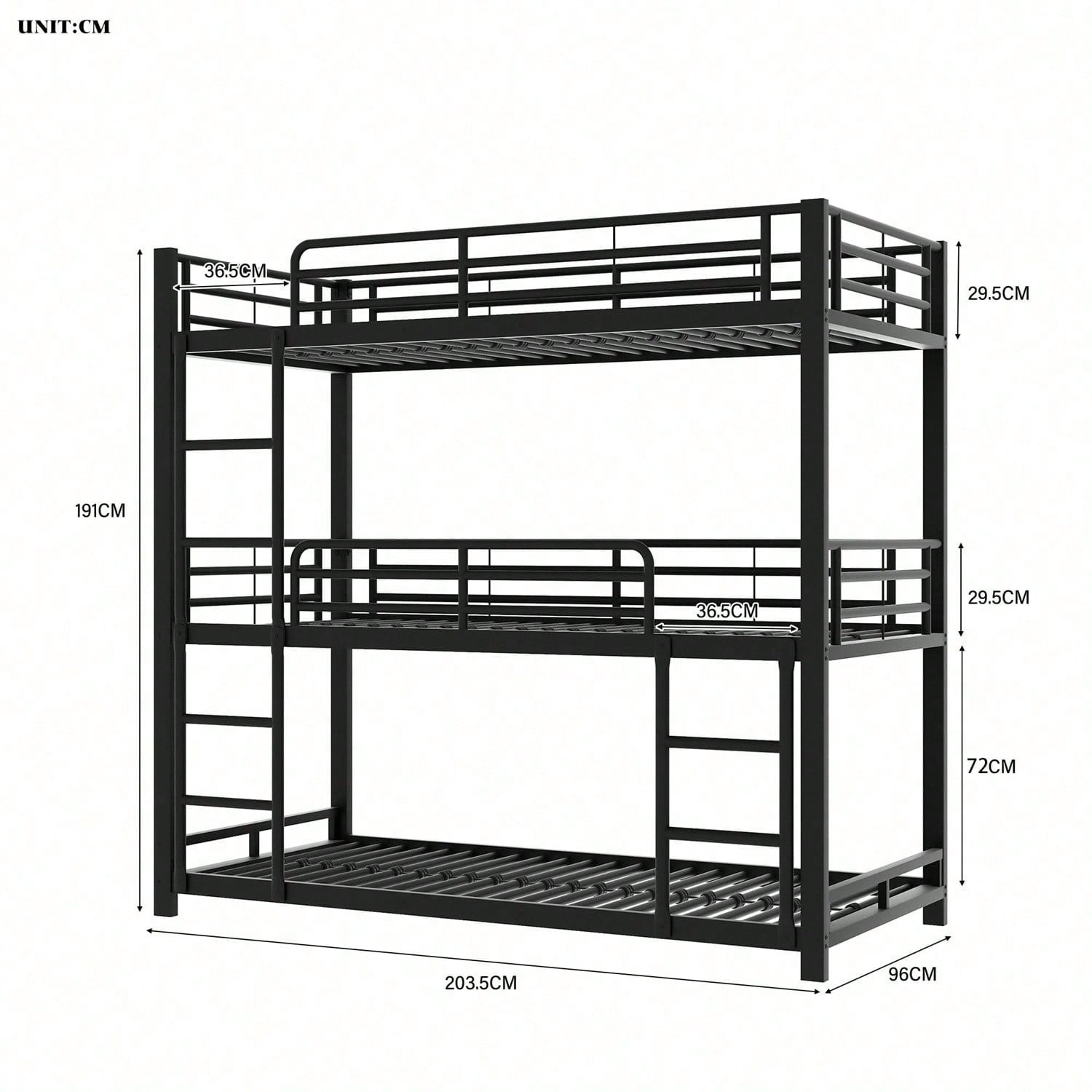 Product Information Item Code: WX000520AAB Product Type: Combo Item Product Name: 90x200cm Bettgestell Metallbett,Etagenbett,Eisenbett, Dreifach-Etagenbett für Kinder, Jugendliche und Erwachsene, Schwarz Main Color: Black Main Material: Metal Bed Size: 90cm*200cm Product Dimensions Assembled Length (cm): 203.50 Assembled Width (cm): 96.00 Assembled Height (cm): 191.00 Product Weight (kg): 52.80 Package Size Sub-item 1: WF314687AAB Package Quantity: 1 102 * 42 * 24 cm 27.1 kg Sub-item 2: WF314686AAB Package Quantity: 1 198 * 38 * 8 cm 14.8 kg Sub-item 3: WF314685AAB Package Quantity: 1 198 * 39 * 8 cm 20.7 kg Product Features Qualitätsmaterial:Das Dreifach-Etagenbett besteht aus einem Stahlrahmen mit starker Tragfähigkeit, so dass Sie sich keine Sorgen machen müssen, dass das Bett zusammenbricht. Die dicken Stahlrohre machen das Bett stabiler für den langfristigen Gebrauch. Maximieren Sie den Platz:Dieses Dreifach-Etagenbett nutzt den vertikalen Raum, um viel Platz zu sparen. Dieses Dreifach-Etagenbett ist perfekt für eine mehrköpfige Familie oder spontane Übernachtungsgäste. Minimalistischer Stil:Dank ihres minimalistischen Stils fügen sich unsere Dreifach-Etagenbetten harmonisch in eine Vielzahl von Einrichtungsstilen ein. Dieses Hochbett kann in Studenten- oder Mitarbeiterwohnheimen, Wohnungen und Kinderzimmern für eine Vielzahl von Personen verwendet werden. Sicherheit: Dieses Dreifach-Etagenbett ist EN747-zertifiziert und für Kinder ab sechs Jahren geeignet. Die beiden oberen Etagenbetten sind von stabilen Geländern umgeben, die Stürze verhindern und dafür sorgen, dass die Kinder ruhig schlafen können. Das Bett wird in drei Paketen aus Deutschland verschickt. Es kann sein, dass die drei Pakete nicht am selben Tag ankommen, aber sie werden Ihren Anforderungen entsprechen. Bitte warten Sie noch 2-3 Tage oder kontaktieren Sie unseren freundlichen Kundenservice.