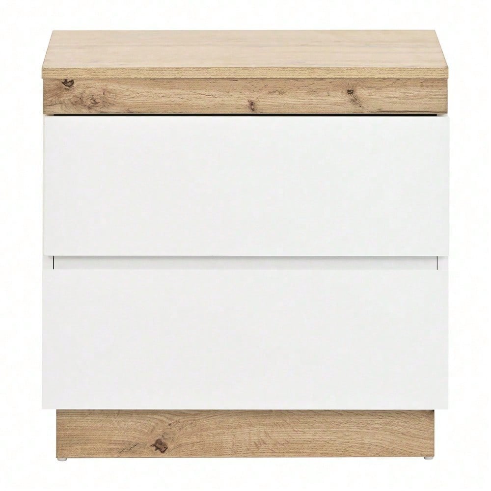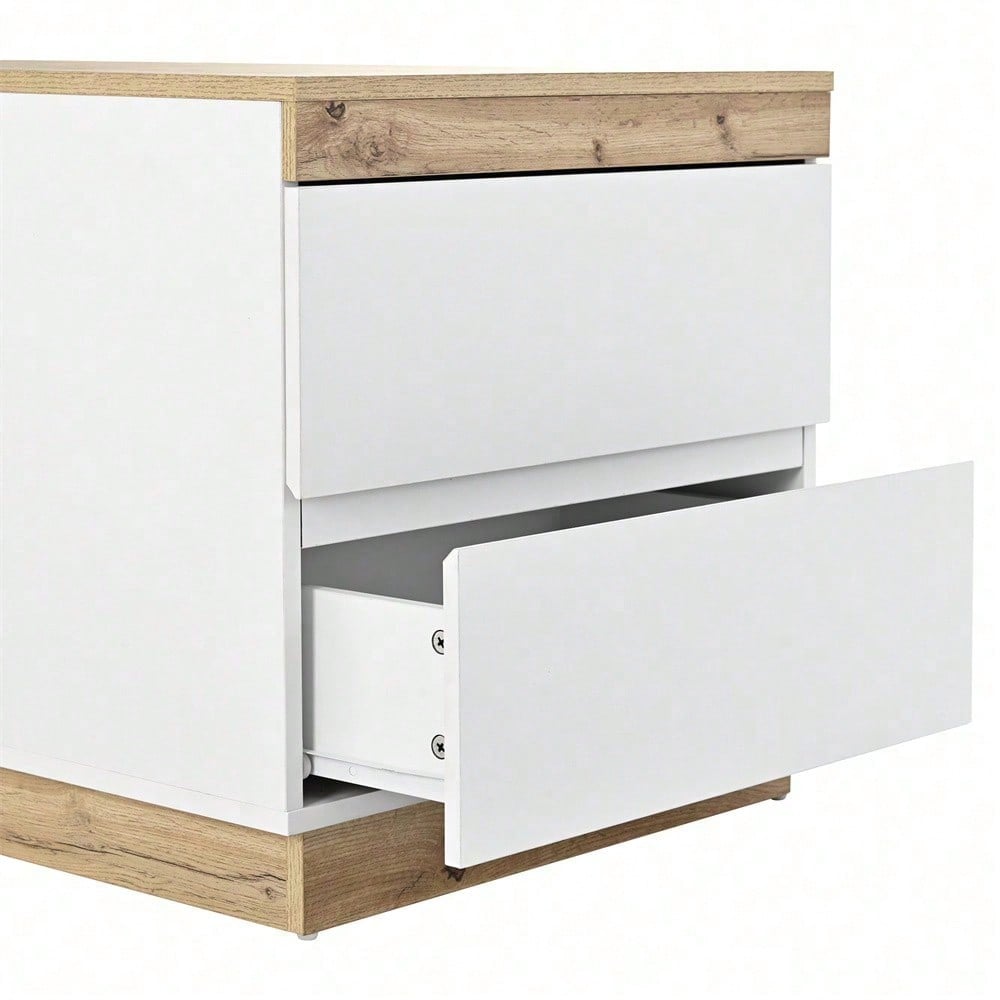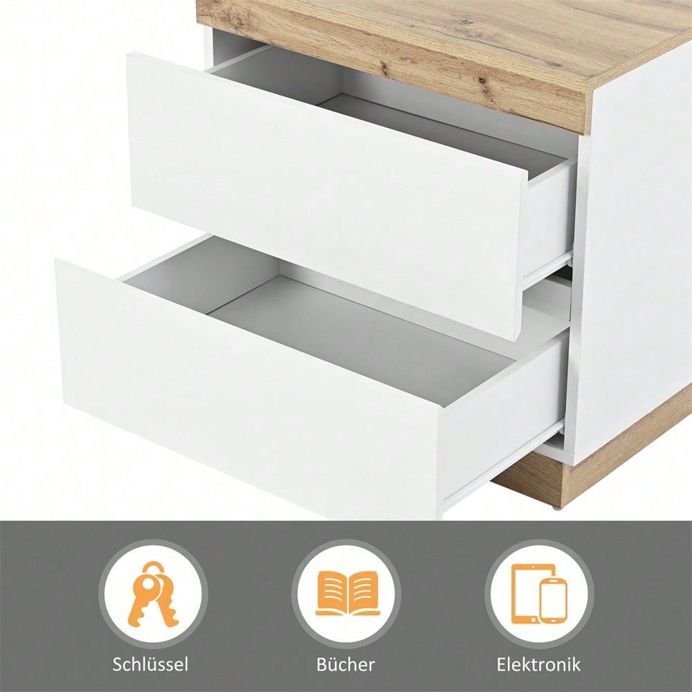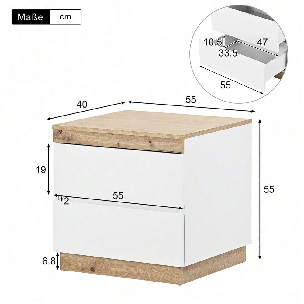 Look classico: il nostro stile classico dona un tocco classico alla tua camera da letto. Una varietà di colori e finiture conferisce alla stanza un'atmosfera confortevole. Stabilità: il comodino, con il suo design compatto e il suo aspetto, garantisce un'ottima stabilità. Alta qualità: il comodino è realizzato in truciolare E1 con finitura rovere, che offre un'ottima stabilità e durata. Ampio spazio contenitivo: il mobile, abbinato al tuo comodo letto, offre ulteriore spazio contenitivo. I due ampi cassetti offrono ampio spazio per libri e altri soprammobili. Facile da montare con istruzioni chiare: puoi installarlo seguendo le istruzioni chiare. In caso di problemi, contatta il nostro servizio clienti e ti forniremo la soluzione migliore il prima possibile. Descrizione Dettagli del prodotto Dimensioni del prodotto: vedi l'immagine sopra. Nota: Dimensioni: tutte le misure sono approssimative. Materiale principale: truciolare E1 Capacità di carico massima: piano di lavoro: 40 kg; cassetto: 10 kg