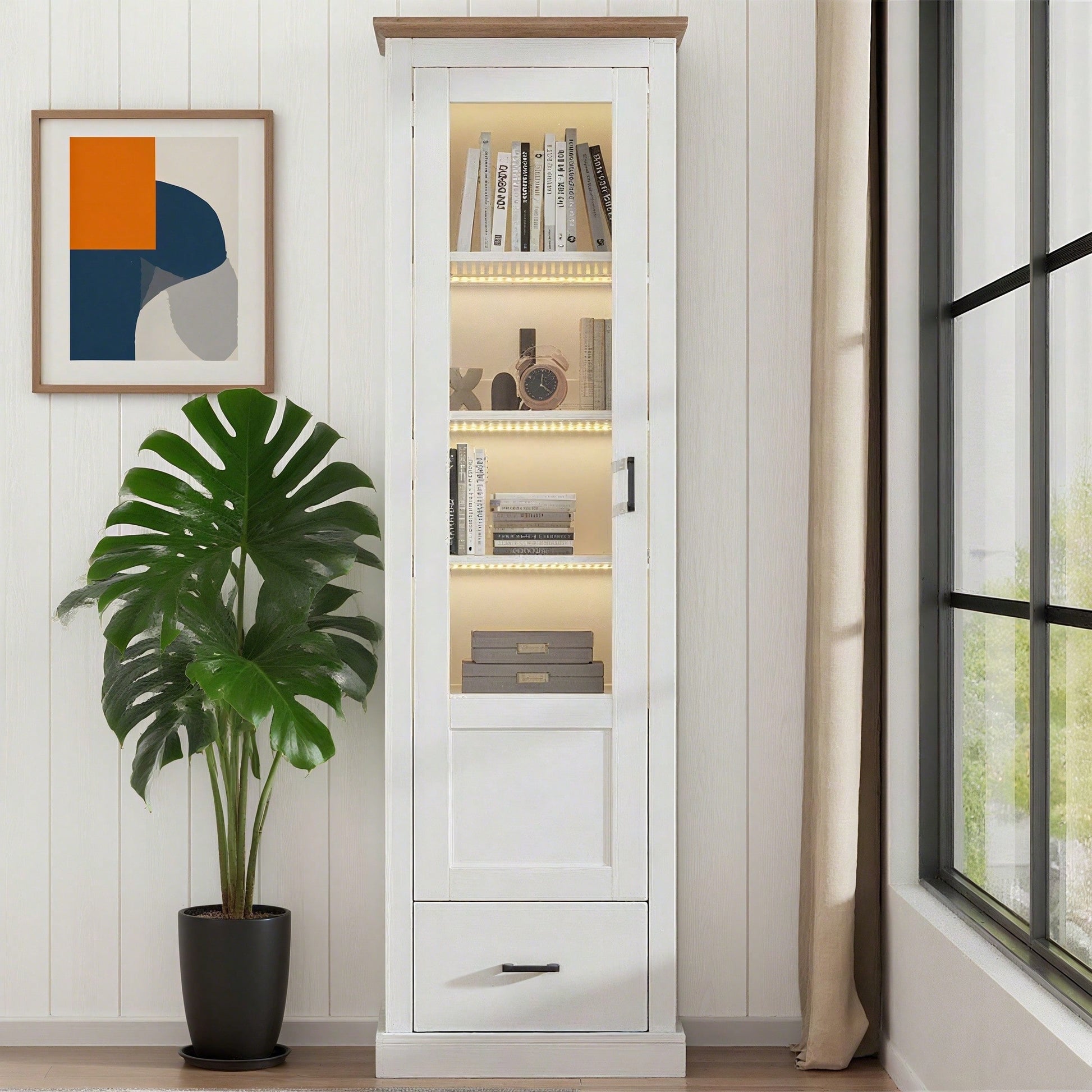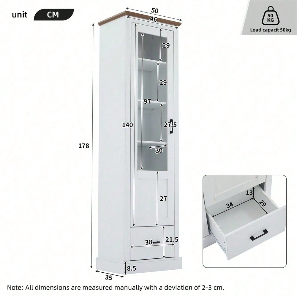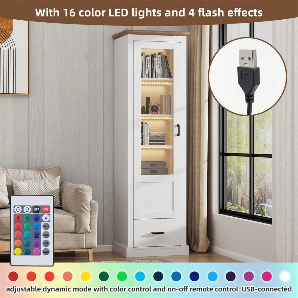 Descrizione Questa elegante vetrina autoportante unisce design moderno e funzionalità pratica. Con un'altezza di 178 cm, offre un ampio spazio espositivo su cinque livelli, con una portata massima di 20 kg per ripiano. La superficie bianca opaca in MDF e truciolato è elegantemente completata dalla decorazione color legno naturale nella parte superiore. L'illuminazione a LED integrata con porta USB e 16 opzioni di colore mette in risalto i vostri oggetti da collezione. Il pratico cassetto inferiore offre ulteriore spazio di archiviazione con una capacità di carico di 30 kg. Le dimensioni compatte di 50 x 35 cm rendono la vetrina un mobile salvaspazio ma di grande effetto. La consegna in due scatole consente un facile trasporto e una facile movimentazione durante il montaggio. Specifiche Dimensioni del prodotto: 50 x 35 x 178 cm Materiale del prodotto: truciolato + MDF + vetro temperato Capacità di carico del prodotto: 20 kg per livello, 30 kg nella parte inferiore Colore del prodotto: bianco Numero di vani portaoggetti: 5 LED: luce LED a 16 colori, telecomando, porta USB
