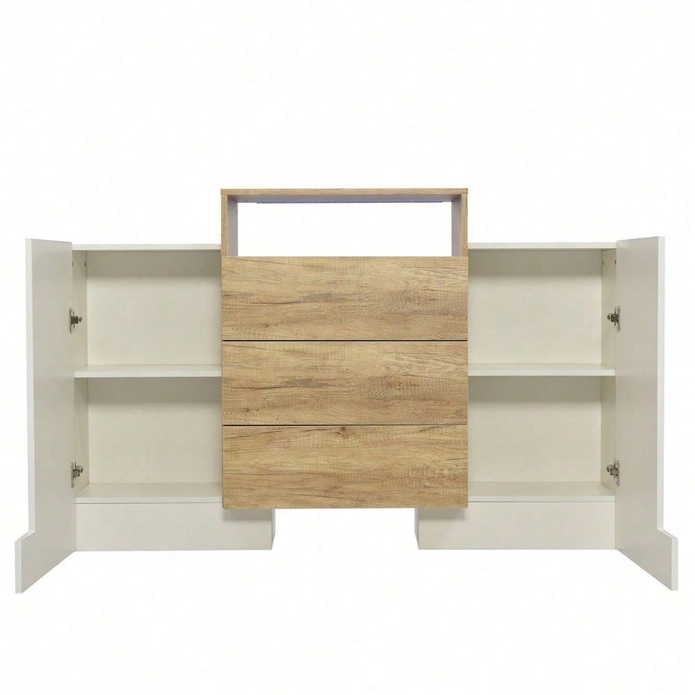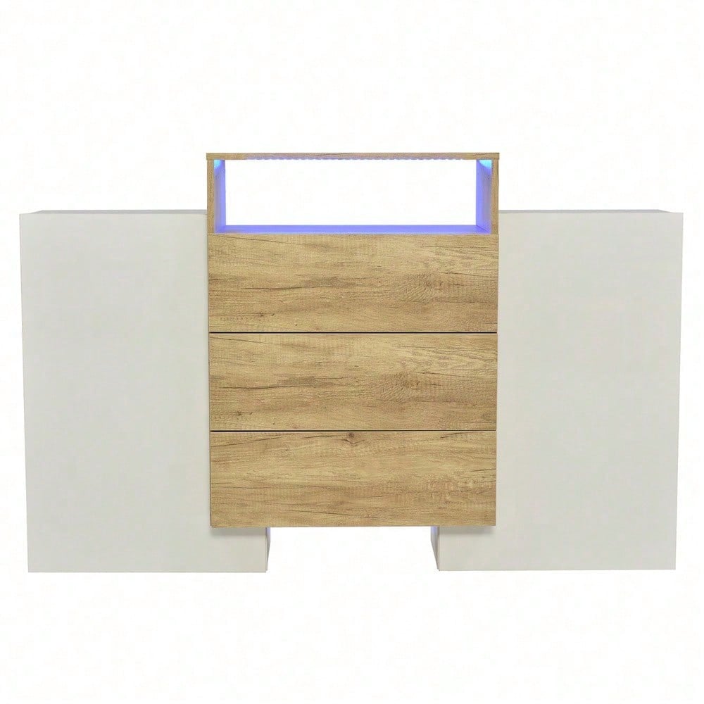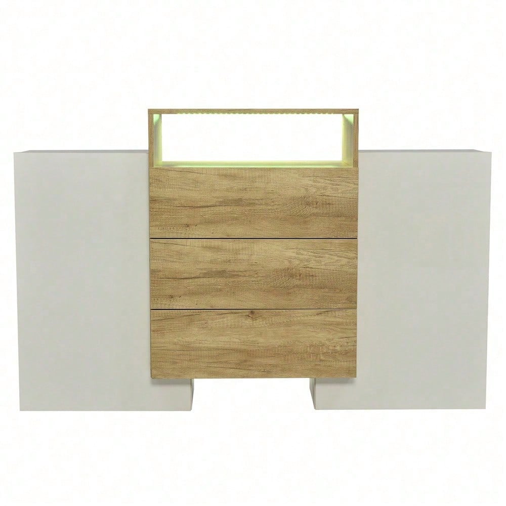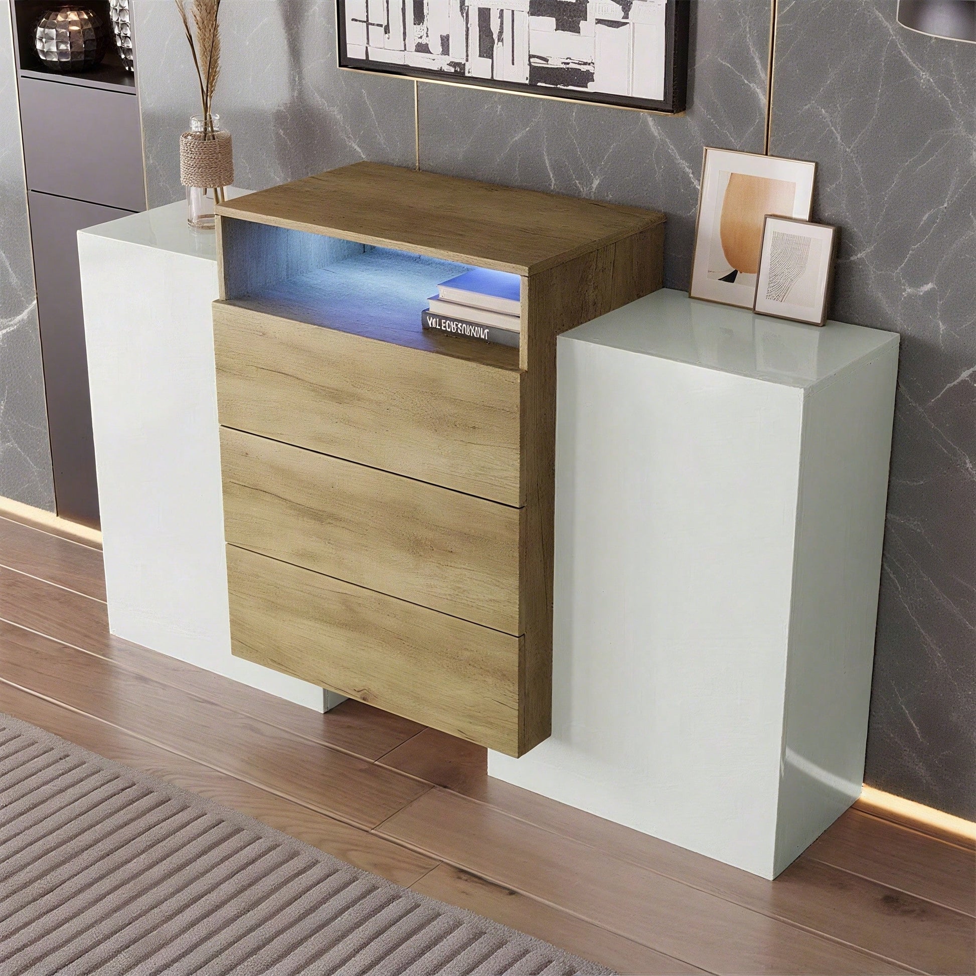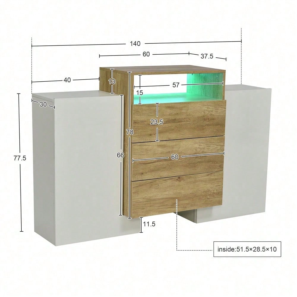 1. Design coordinato nei colori legno e bianco lucido 2. Forma unica, elegante e moderna 3. Dotato di strisce LED multicolore regolabili a piacere 4. Facile da montare e istruzioni di montaggio chiare 5. I laminati consentono una migliore organizzazione dello spazio Specifiche tecniche Dimensioni complessive: 140 L x 30 P x 77,5 A (cm) Capacità di carico del prodotto: 80 kg Dimensioni della confezione: 90 x 63 x 20 + 70 x 49 x 25 (cm) Peso netto: 52 kg Peso della confezione: 29 + 26,3 kg Specifiche Materiale: MDF Colore: Bianco e color legno Tempo di montaggio: 30-60 minuti (consigliato per 2 persone) Altri strumenti necessari: tutti gli strumenti inclusi Origine: Cina