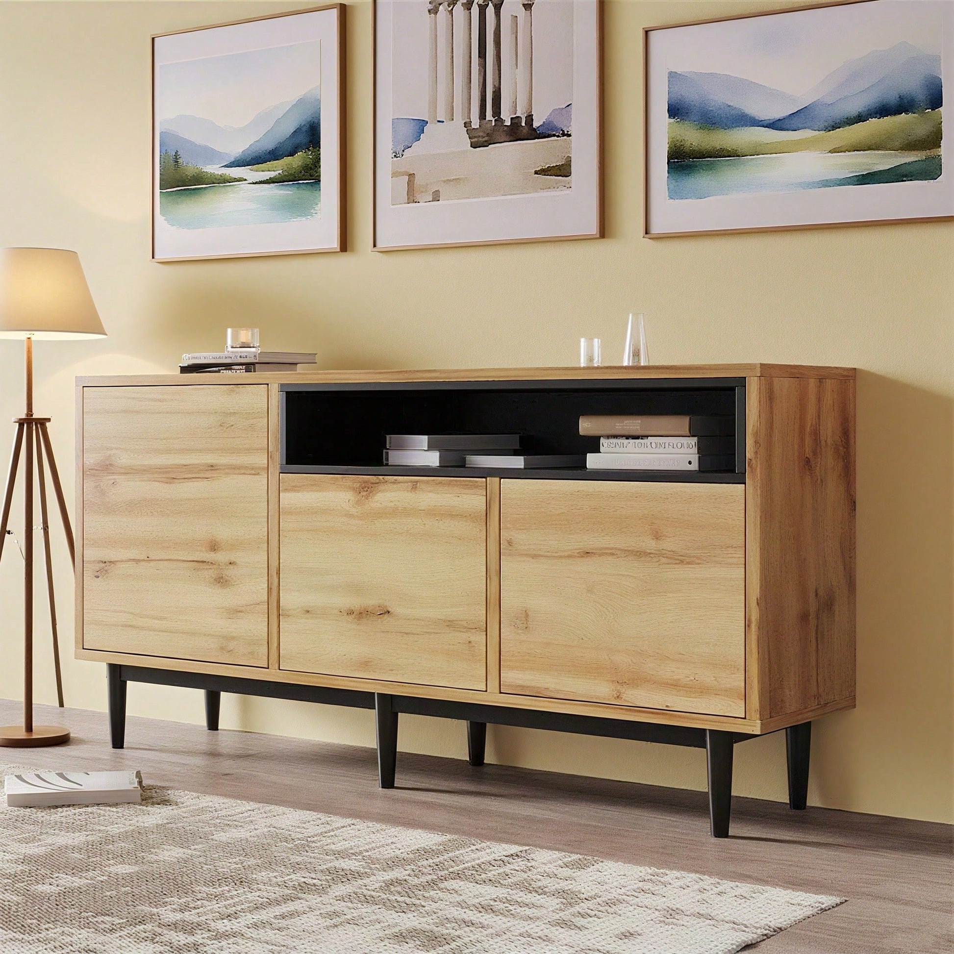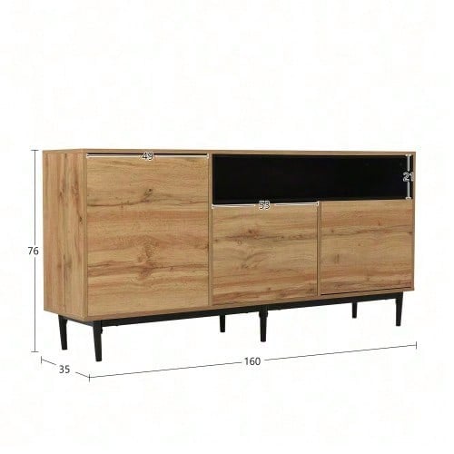 Migliora il tuo spazio di archiviazione: questa credenza moderna ed elegante unisce funzionalità e bellezza, aggiungendo stile e ordine alla tua casa. Facile organizzazione: di' addio al disordine e alla confusione. Questa credenza offre lo spazio perfetto per riporre i tuoi articoli per la casa e le posate, mantenendo tutto organizzato e facilmente accessibile. Metti in mostra il tuo stile: la combinazione di colori nero e legno aggiunge un tocco di eleganza alla tua stanza, rendendola un punto focale che completa il tuo arredamento d'interni. Ripiani regolabili per la massima flessibilità: i ripiani regolabili consentono di riporre oggetti di diverse dimensioni in modo flessibile, garantendo una soluzione perfetta per le tue esigenze di archiviazione. Facile montaggio e manutenzione: questa credenza viene fornita con istruzioni facili da seguire per un montaggio senza sforzo. È anche facile da pulire e mantiene il suo aspetto impeccabile con una semplice passata. Specifiche Dimensioni del prodotto: 160 x 35 x 76 cm Materiale: Truciolato + MDF Colore: Nero Tempo di montaggio: 30-60 minuti (si consigliano 2 persone) Numero di colli: 2