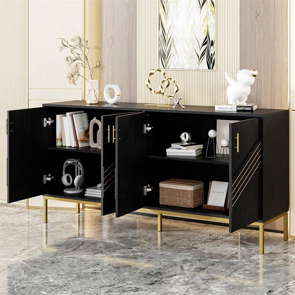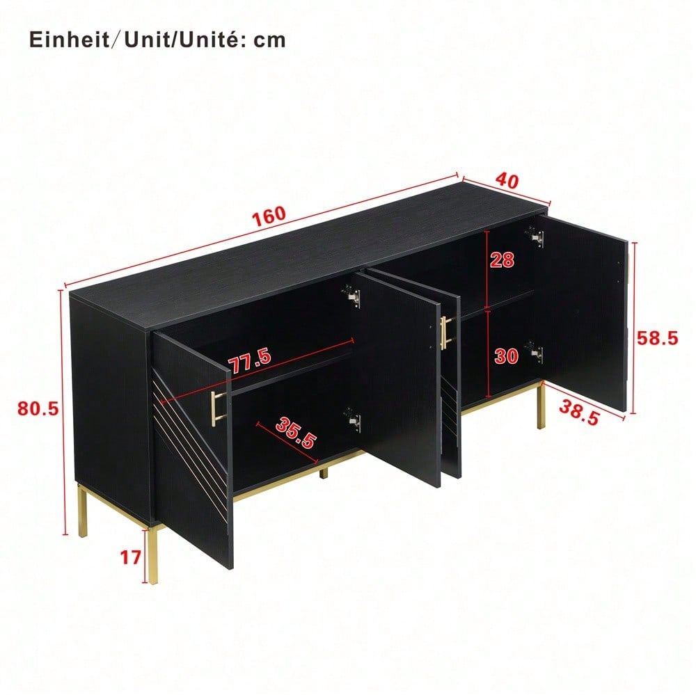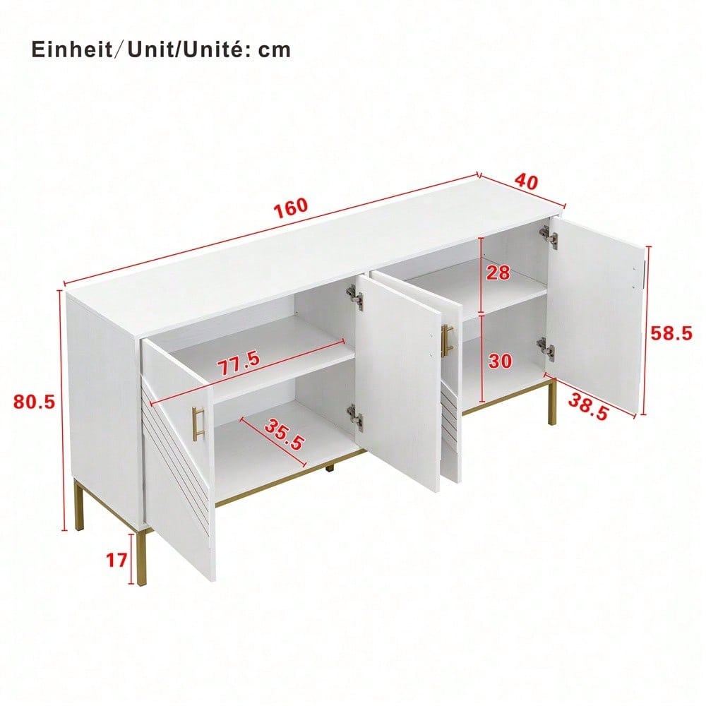 ¡Atención! 1. Debido a la iluminación o la pantalla, el color del producto real puede variar ligeramente del de la imagen. 2. Debido a la medición manual, pueden producirse errores razonables. 3. Debido a razones logísticas, el tiempo de entrega de varios paquetes puede variar; por favor, comprenda. 4. Debido a la naturaleza aleatoria de la veta de la madera, la veta de cada mueble no es exactamente la misma. Ventajas 1. Aparador con almacenamiento 2. Tiradores dorados 3. Cómoda de cuatro puertas 4. Aparador con estantes 5. Amplio espacio de almacenamiento 6. Instrucciones detalladas de montaje 7. Uso multifuncional Especificaciones Dimensiones totales (cm): 160 (largo) x 40 (ancho) x 80,5 (alto) Carga del producto: 75 kg Peso neto: 41 kg Material: MDF Color: Blanco + veta de madera Alto brillo: No Se requieren otras herramientas: Sí Número de paquetes: 2 Origen: República Popular China