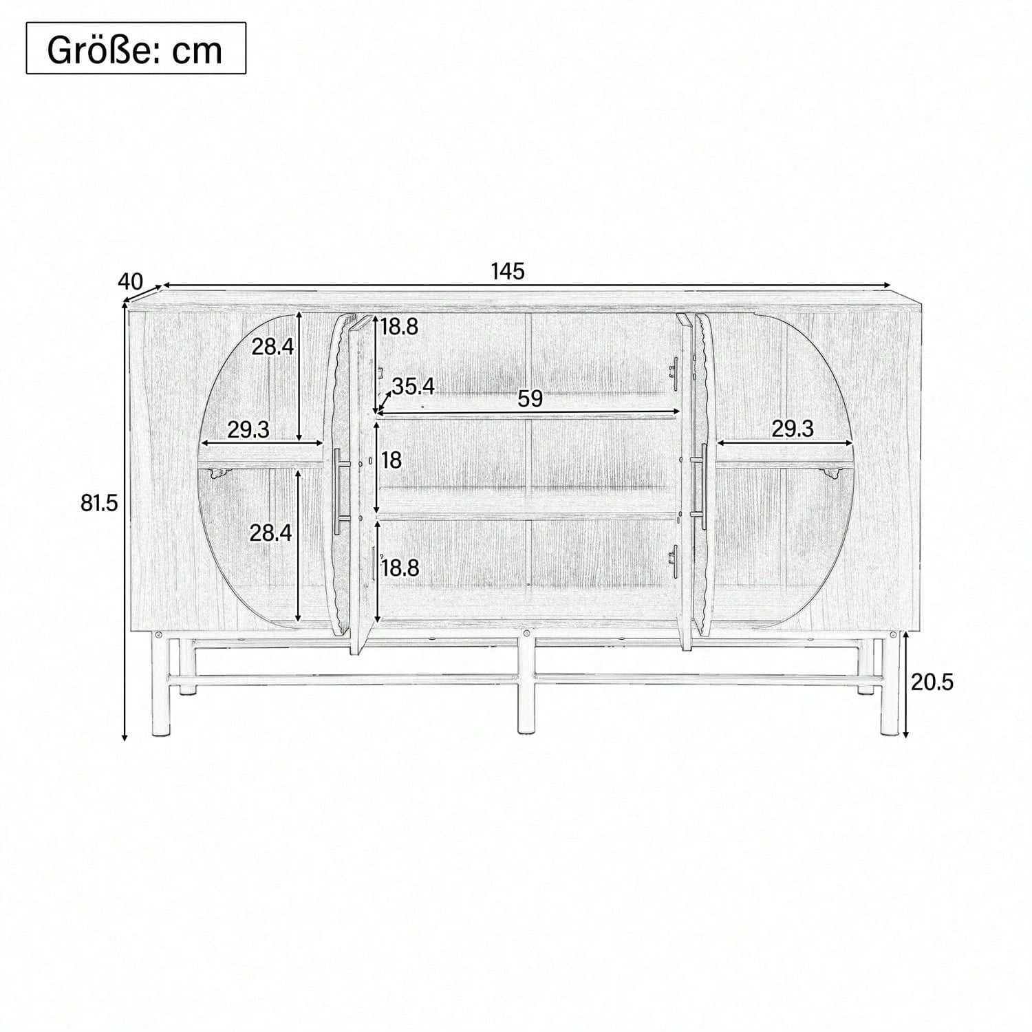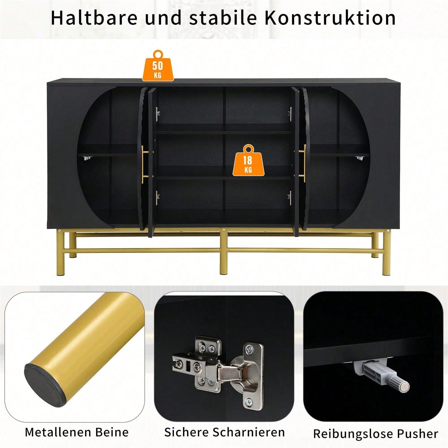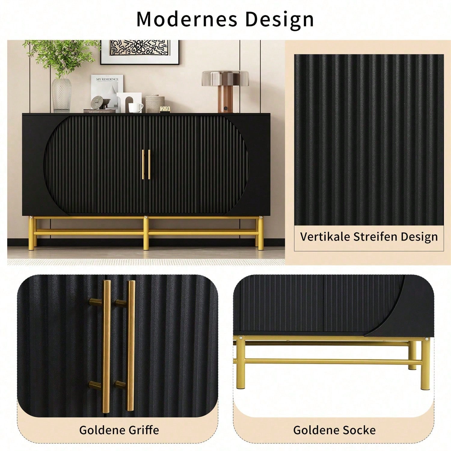 Especificaciones Información del producto Código del artículo: DE000024AAB Tipo de producto: Artículo combinado Nombre del producto: Aparador moderno de cuatro puertas con rayas verticales y estantes ajustables, único y con muchas características, ideal para sala y comedor (negro) Lugar de origen: China Color principal: Negro Material principal: Hierro, MDF Dimensiones del producto Largo ensamblado (cm): 145.00 Ancho ensamblado (cm): 40.00 Alto ensamblado (cm): 81.50 Peso del producto (kg): 39.40 Tamaño del paquete Subartículo 1: N651P271314B Cantidad del paquete: 1 73.03 * 48.01 * 22.86 cm 20.9 kg Subartículo 2: N651P271313B Cantidad del paquete: 1 158,12 x 49,02 x 13,34 cm 23,9 kg