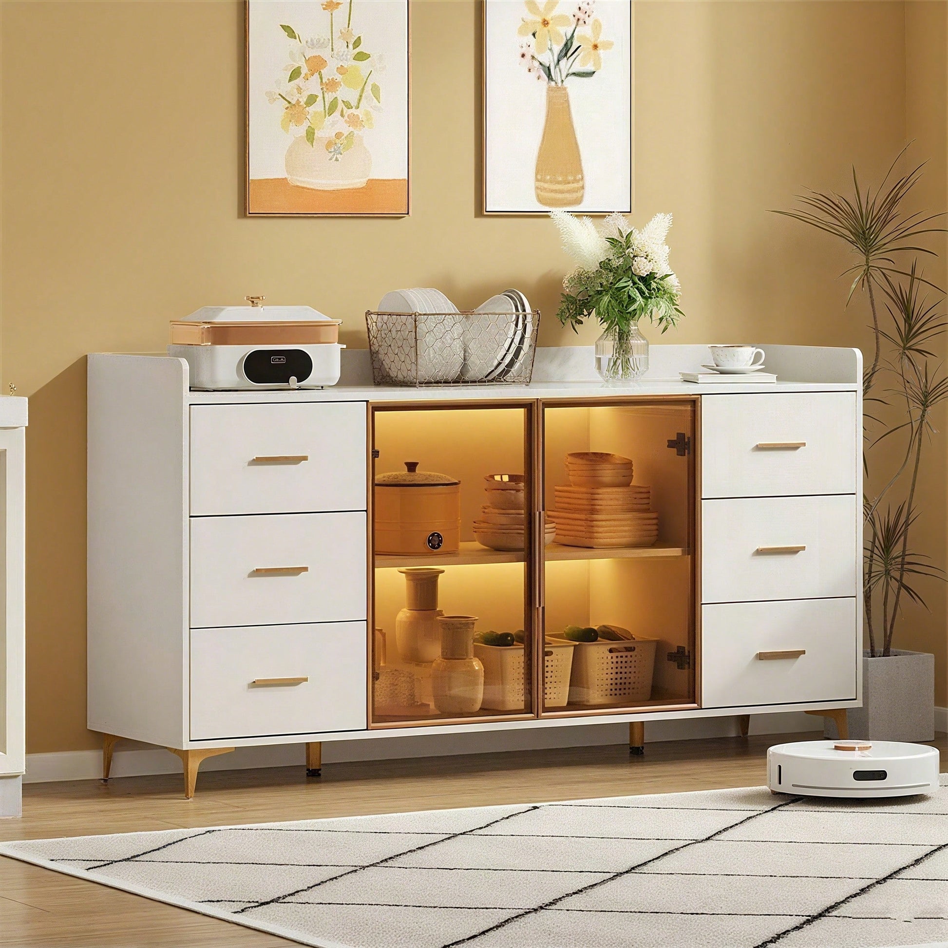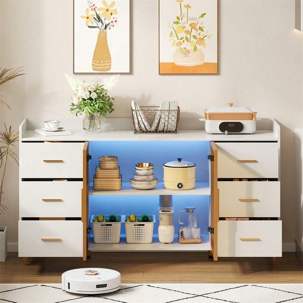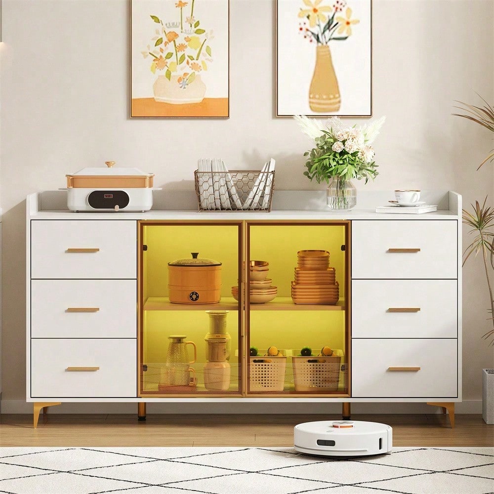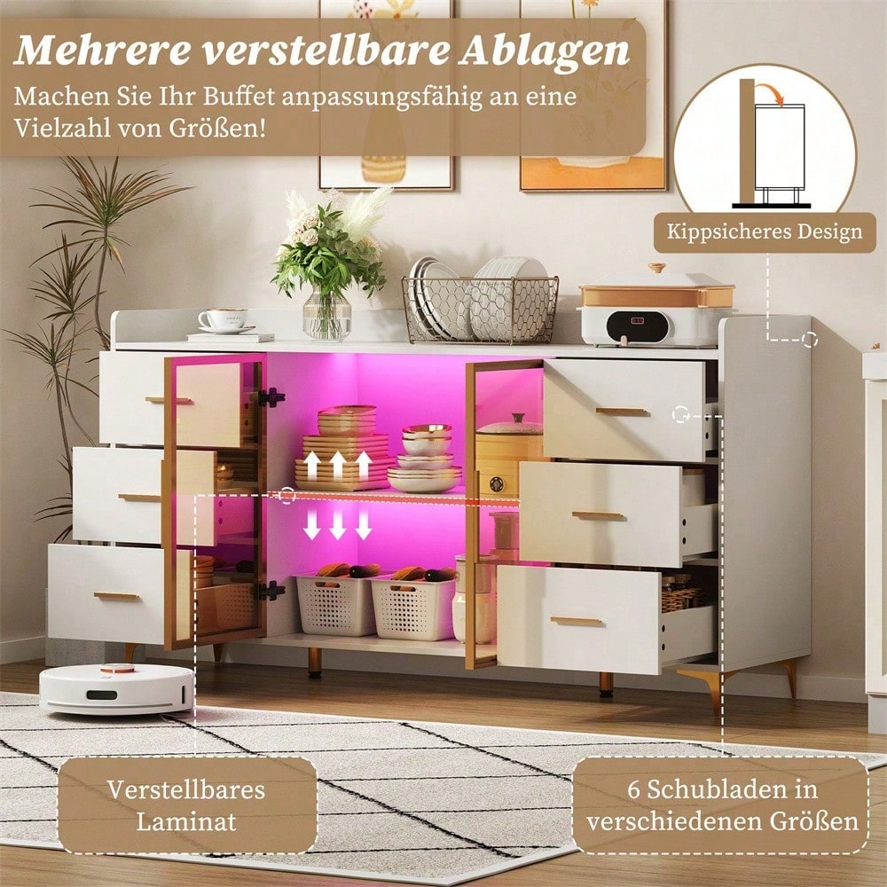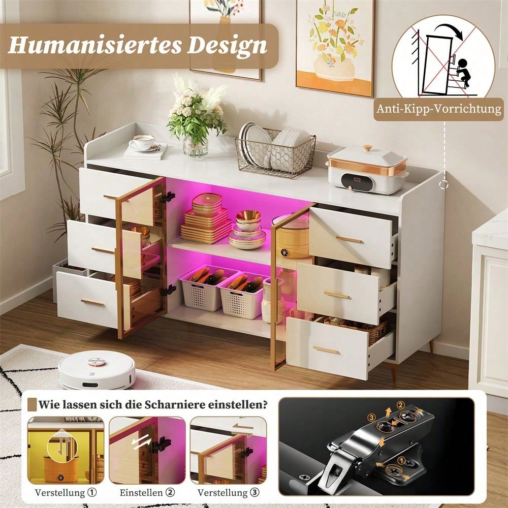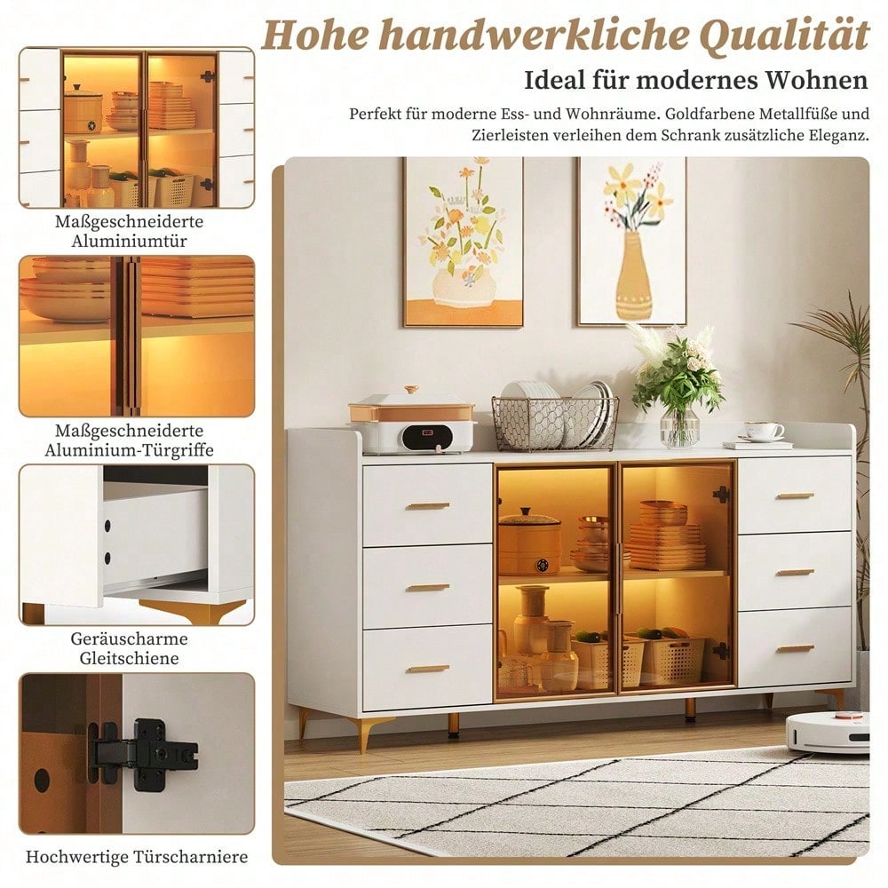 Especificaciones técnicas Dimensiones: 160 x 44 x 87 cm (Largo x Ancho x Alto) Material: MDF con revestimiento de melamina, aleación de aluminio (tiradores y marco de la puerta), vidrio templado Color: Cuerpo: Blanco / Tiradores, base, marco de la puerta: Dorado / Vidrio: Ahumado Características especiales: Cajón silencioso, iluminación LED con control remoto, dispositivo antivuelco Capacidad de carga: máx. 60 kg