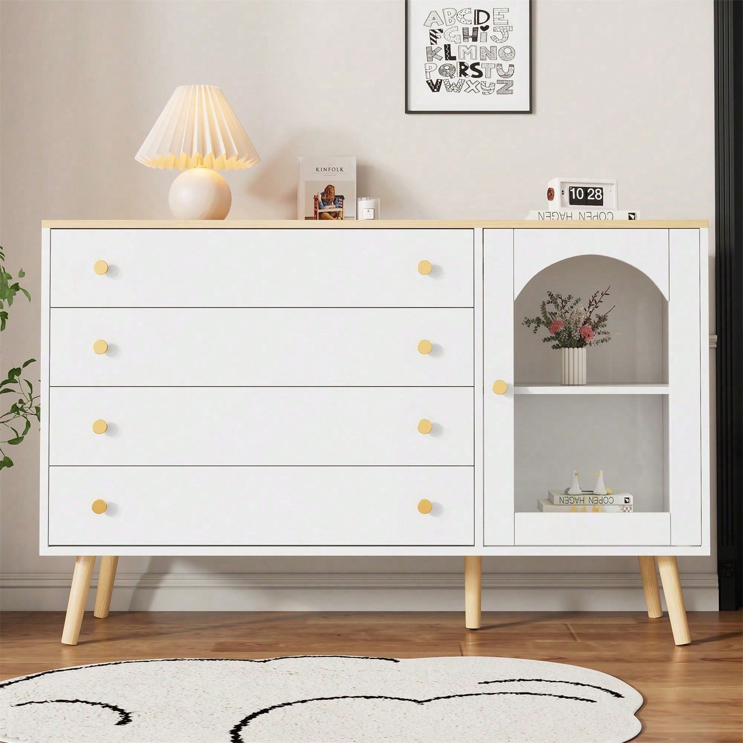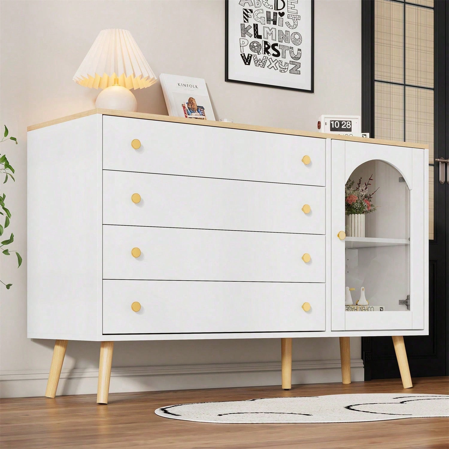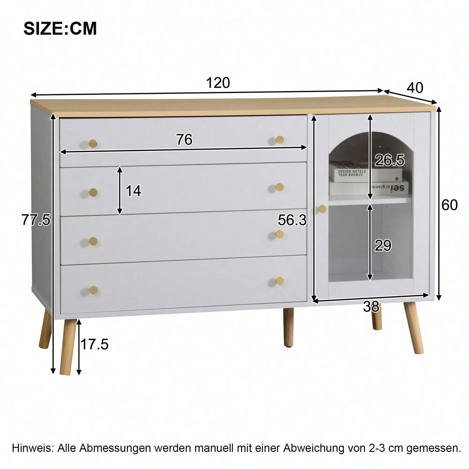 Le grand plateau en bois peut accueillir divers objets du quotidien tels que réveils, lampes de table, cadres photo, vases, etc. Les quatre grands tiroirs permettent de ranger divers articles tels que sous-vêtements, chaussettes, manteaux, etc. Les quatre tiroirs blancs sont fabriqués en panneaux de particules de haute qualité, durables et offrent une grande capacité de charge. Leur design blanc épuré convient à toutes les occasions. Ce buffet d'entrée est doté d'une poignée ronde dorée, élégante et facile à ouvrir, et d'un dispositif anti-basculement à l'arrière pour éviter tout risque de basculement et de blessure. Cela rend la commode blanche plus sûre, plus durable et protège vos enfants et les membres de votre famille. Pour vous aider à résoudre ce problème, nous vous fournissons des pièces numérotées et une notice illustrée. Ce produit est livré en deux colis. Veuillez vous assurer de les recevoir avant le montage. Spécifications Dimensions : 40 x 120 x 77,5 cm Couleur : Bois + Blanc Matériau : Panneau de particules Poids : 50 kg Poids brut/net : 39,8 kg/36 kg Nombre de tiroirs : 3 Utilisations : Salon, salle à manger, entrée, chambre, bureau, dressing