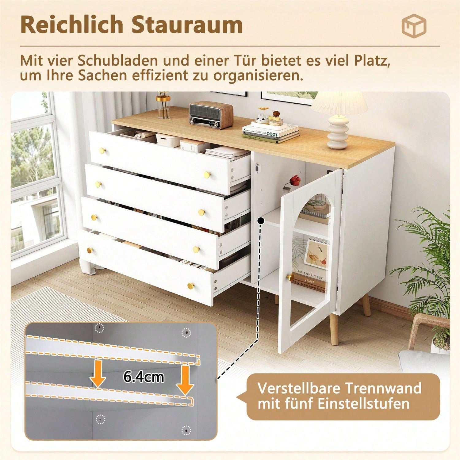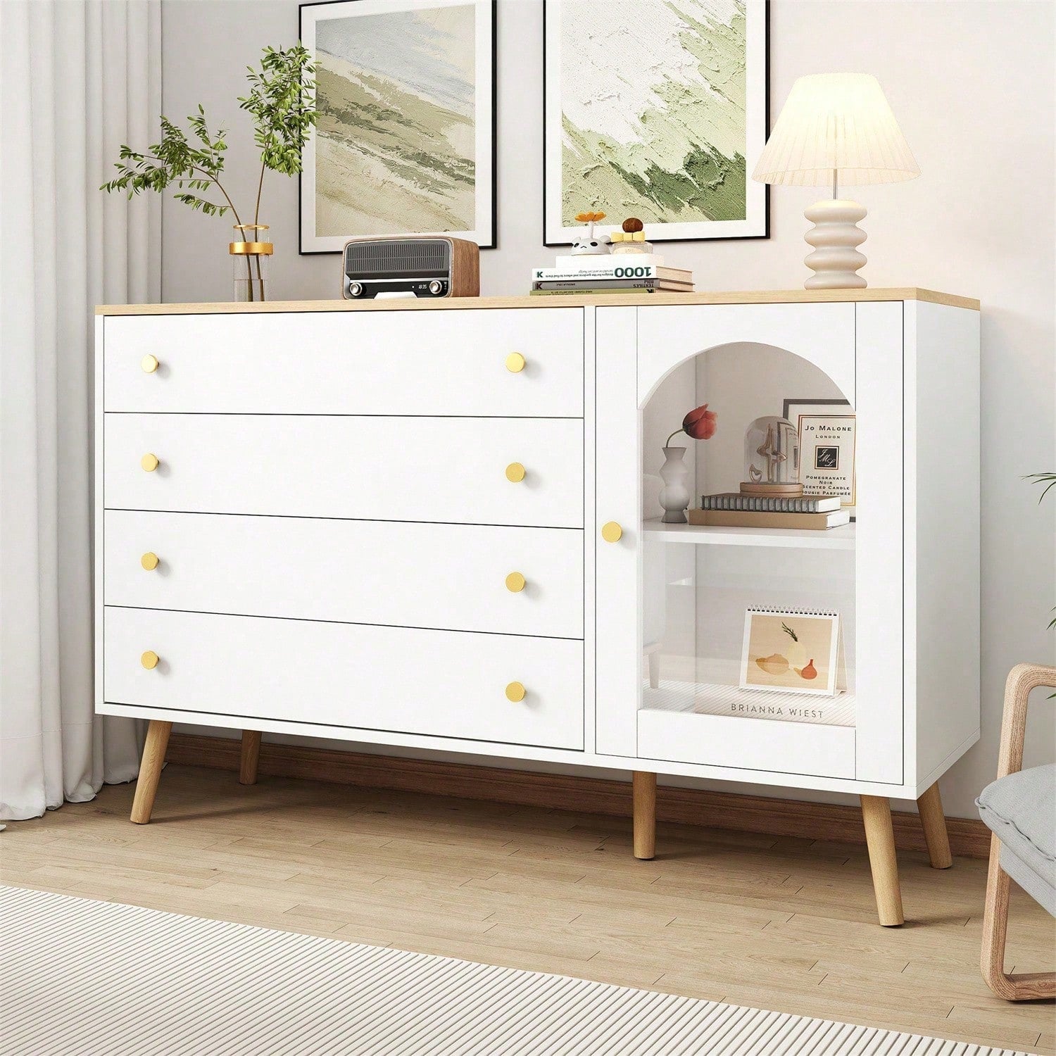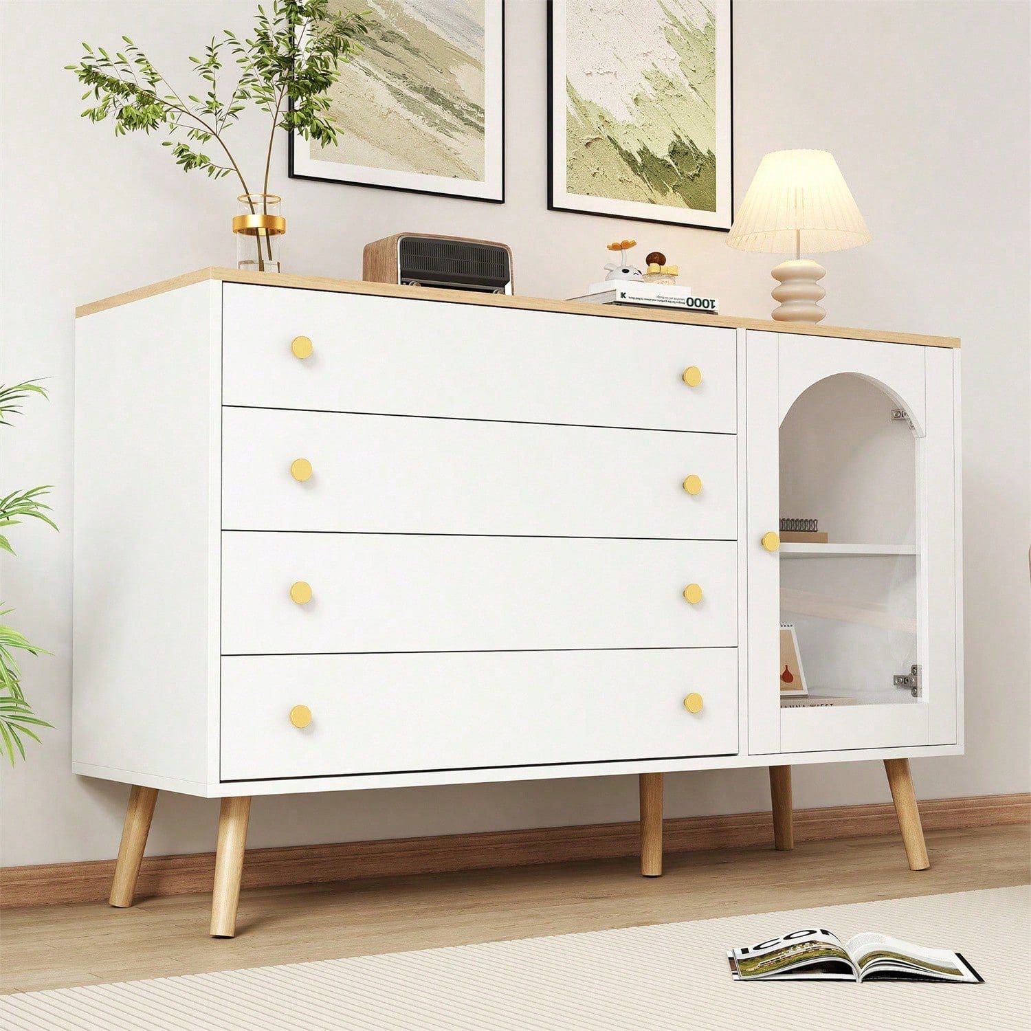 Le grand plateau en bois peut accueillir divers objets du quotidien tels que réveils, lampes de table, cadres photo, vases, etc. Les quatre grands tiroirs permettent de ranger divers articles tels que sous-vêtements, chaussettes, manteaux, etc. Les quatre tiroirs blancs sont fabriqués en panneaux de particules de haute qualité, durables et offrent une grande capacité de charge. Leur design blanc épuré convient à toutes les occasions. Ce buffet d'entrée est doté d'une poignée ronde dorée, élégante et facile à ouvrir, et d'un dispositif anti-basculement à l'arrière pour éviter tout risque de basculement et de blessure. Cela rend la commode blanche plus sûre, plus durable et protège vos enfants et les membres de votre famille. Pour vous aider à résoudre ce problème, nous vous fournissons des pièces numérotées et une notice illustrée. Ce produit est livré en deux colis. Veuillez vous assurer de les recevoir avant le montage. Spécifications Dimensions : 40 x 120 x 77,5 cm Couleur : Bois + Blanc Matériau : Panneau de particules Poids : 50 kg Poids brut/net : 39,8 kg/36 kg Nombre de tiroirs : 3 Utilisations : Salon, salle à manger, entrée, chambre, bureau, dressing