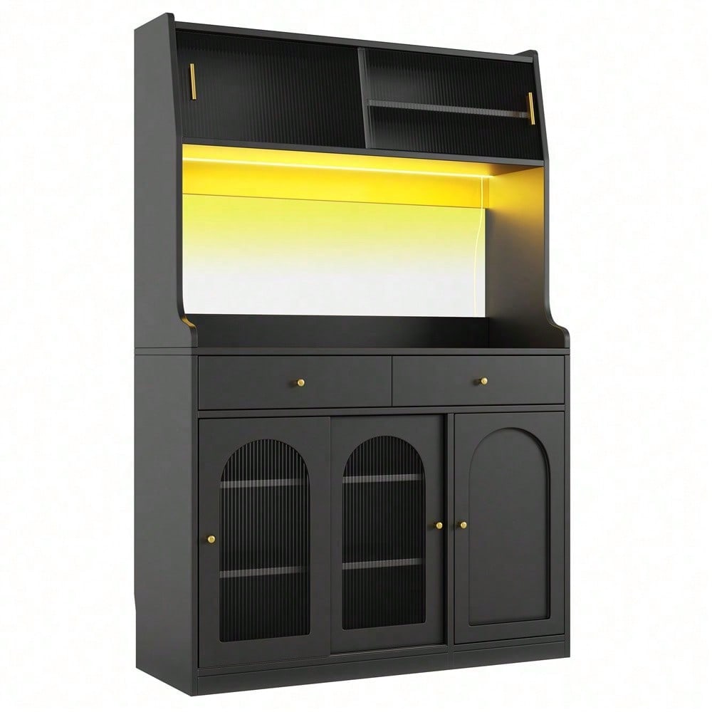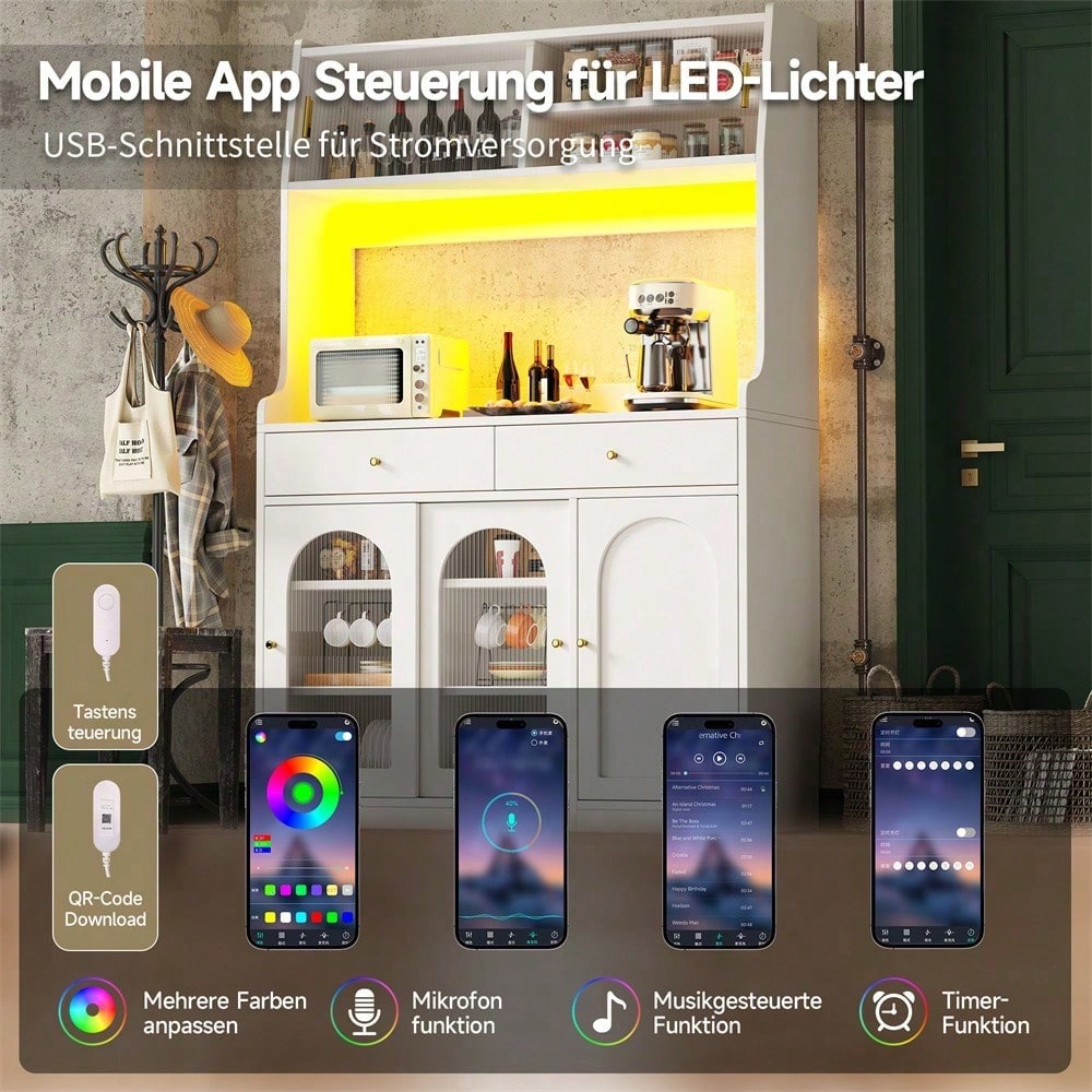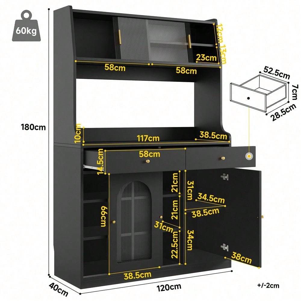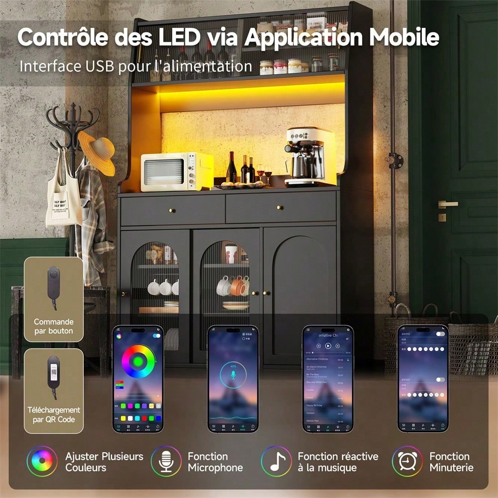 Spécifications Informations produit Code article : N620P2969899091S Type de produit : Article combiné Nom du produit : Armoire de cuisine, armoire haute, vitrine, buffet avec étagères réglables, armoire de salle à manger avec 2 tiroirs, buffet avec éclairage LED, couleurs d'éclairage variables, noir Couleur principale : Noir Matériau principal : MDF, panneau de particules Dimensions du produit Longueur assemblée (cm) : 120,00 Largeur assemblée (cm) : 40,00 Hauteur assemblée (cm) : 180,00 Poids du produit (kg) : 66,00 Dimensions du colis Sous-article 1 : N620P296991S Quantité par colis : 1 89,99 * 46,48 * 19,48 cm 23,05 kg Sous-article 2 : N620P296990S Quantité par colis : 1 132,99 * 47,98 x 15,98 cm, 24,65 kg Sous-article 3 : N620P296989S Quantité par paquet : 1 132,99 x 47,98 x 12,5 cm, 24,3 kg Caractéristiques du produit 1. Design raffiné et matériaux de haute qualité : Fabriqué en panneaux MDF et PB de haute qualité, avec d'élégantes portes coulissantes en verre et des poignées en aluminium, ses détails soignés s'intègrent parfaitement aux espaces de vie modernes. 2. Contrôle multifonction de l'éclairage LED : Compatible avec une application mobile pour contrôler les lumières LED, vous permettant de changer facilement de couleurs pour créer une ambiance lumineuse et ombragée personnalisée. Scannez et téléchargez l'application fournie pour lire des fichiers musicaux locaux. La lumière peut s'adapter en temps réel à l'intensité et au rythme de la musique, garantissant une synchronisation parfaite entre la lumière et la musique, offrant une expérience audiovisuelle immersive. 3. Espace de rangement pratique : Ce meuble haut est doté de deux tiroirs de grande capacité et d'étagères réglables, vous permettant de ranger confortablement des objets de différentes tailles. Son large plan de travail offre un espace généreux pour les appareils électroménagers, vous permettant de dire adieu au désordre et d'obtenir facilement un rangement bien organisé. 4. Dispositif anti-basculement : Ce meuble haut est doté de dispositifs anti-basculement professionnels qui offrent une double protection grâce à son support mural renforcé, empêchant efficacement le risque de basculement. Il est particulièrement adapté aux familles avec enfants ou animaux domestiques, vous permettant de rester à la maison sans soucis lorsque vous cuisinez. 5. Meuble polyvalent : Ce meuble polyvalent peut être placé dans différentes pièces de la maison, comme le salon, la chambre, la cuisine, le couloir, l'entrée ou le bureau. Il peut servir de buffet, de meuble de rangement, de bibliothèque, de meuble d'entrée ou de plan de travail de cuisine. Description