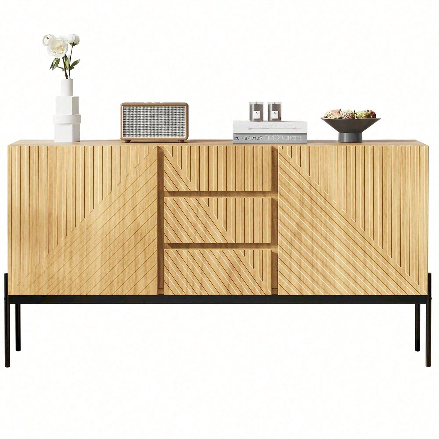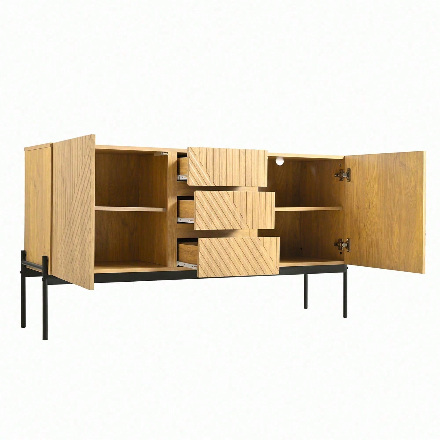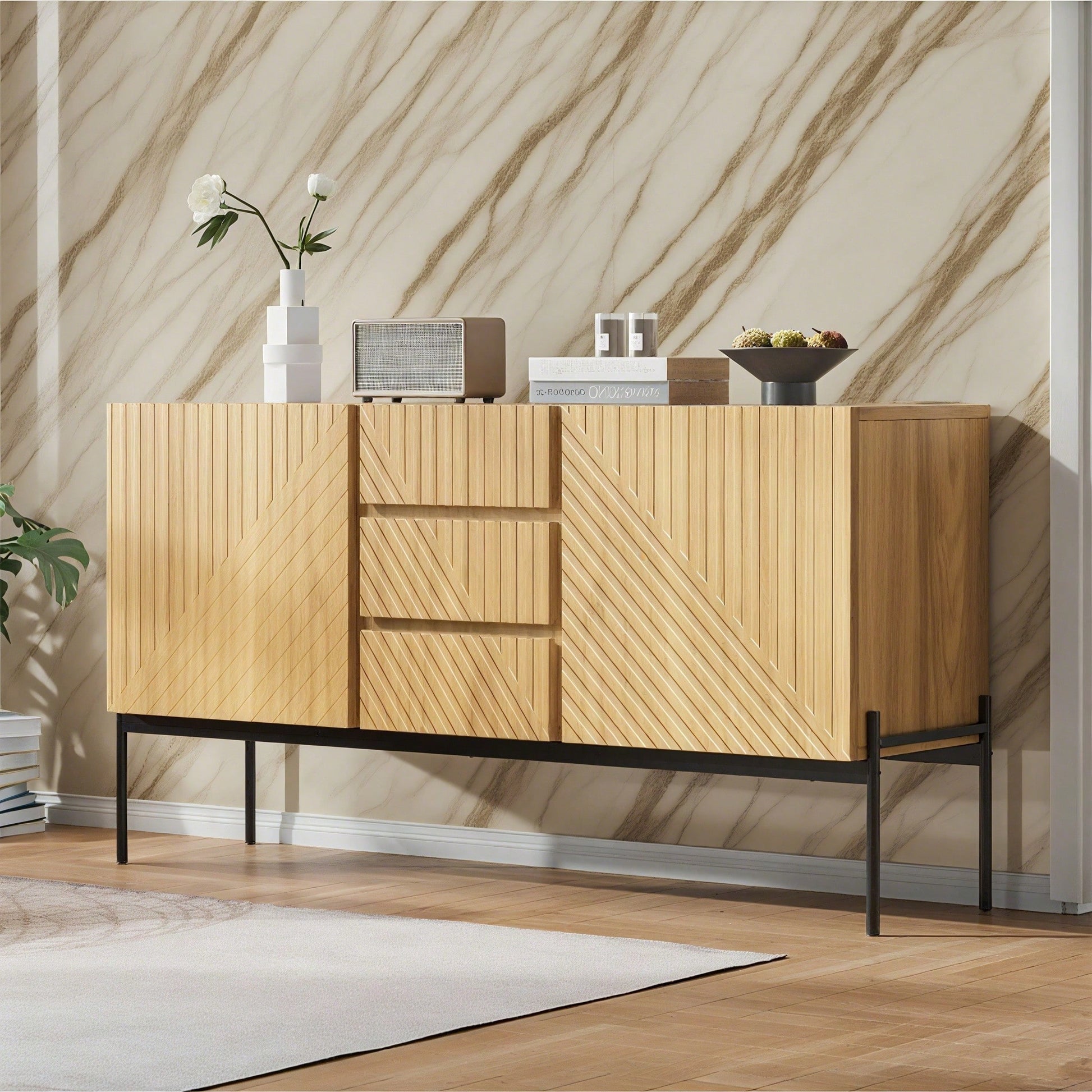 Spécifications Informations produit Code article : N657P28310405N Type de produit : Combo Nom du produit : Buffet 2 portes et 3 tiroirs, pieds en métal, meuble TV, buffet, commode au design linéaire, dimensions : H75 cm / L140 cm / P40 cm Couleur principale : Naturel Matériau principal : Panneau de particules Dimensions du produit Longueur assemblée (cm) : 150,00 Largeur assemblée (cm) : 40,00 Hauteur assemblée (cm) : 75,00 Poids du produit (kg) : 37,65 Dimensions du colis Sous-article 1 : N657P283105N Quantité par colis : 1 155,58 x 51,44 x 10,8 cm 22,05 kg Sous-article 2 : N657P283104N Quantité par colis : 1 64,14 * 59,06 * 17,32 cm 20,6 kg Caractéristiques du produit Design : Ses lignes minimalistes et élégantes dynamisent votre espace de vie et incarnent parfaitement l'essence du design moderne. Structure stable : Doté d'une structure métallique robuste et de panneaux de particules de haute qualité, ce produit offre une stabilité et une résistance exceptionnelles, pour une utilisation longue durée et sans souci. Rangement flexible : La conception des étagères réglables en hauteur (3 niveaux) optimise l'espace : chaque centimètre est optimisé. Les étagères amovibles facilitent le rangement des objets volumineux et contribuent à une ambiance ordonnée. Polyvalence : Ce buffet est un véritable meuble polyvalent, qu'il soit utilisé comme meuble TV avec un grand espace de rangement, comme buffet pratique dans la salle à manger ou comme meuble de rangement élégant pour le petit électroménager et les consommables.
