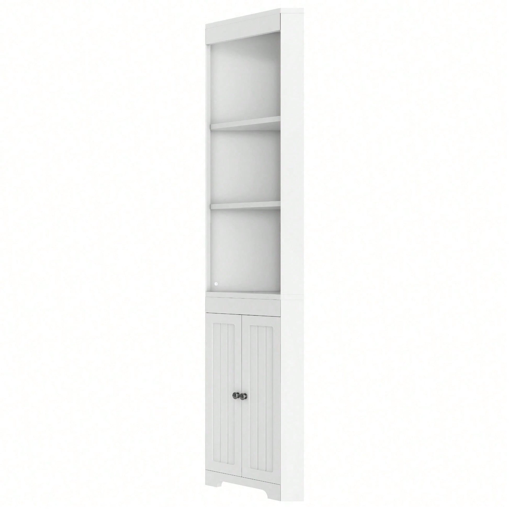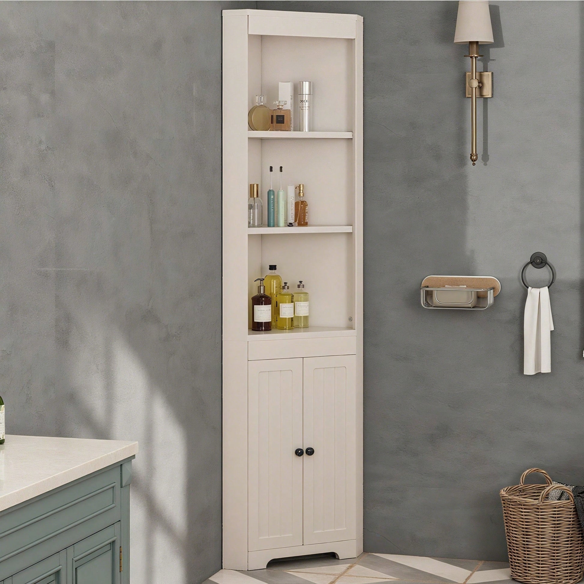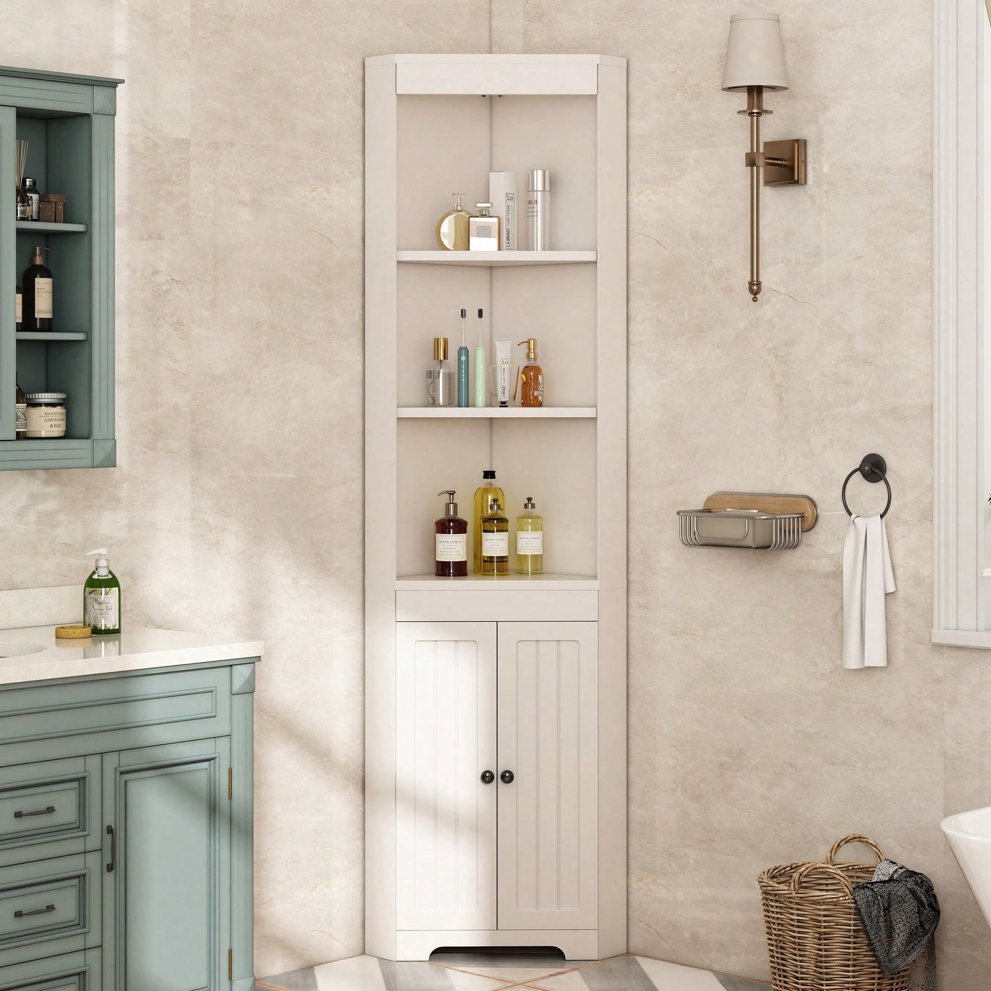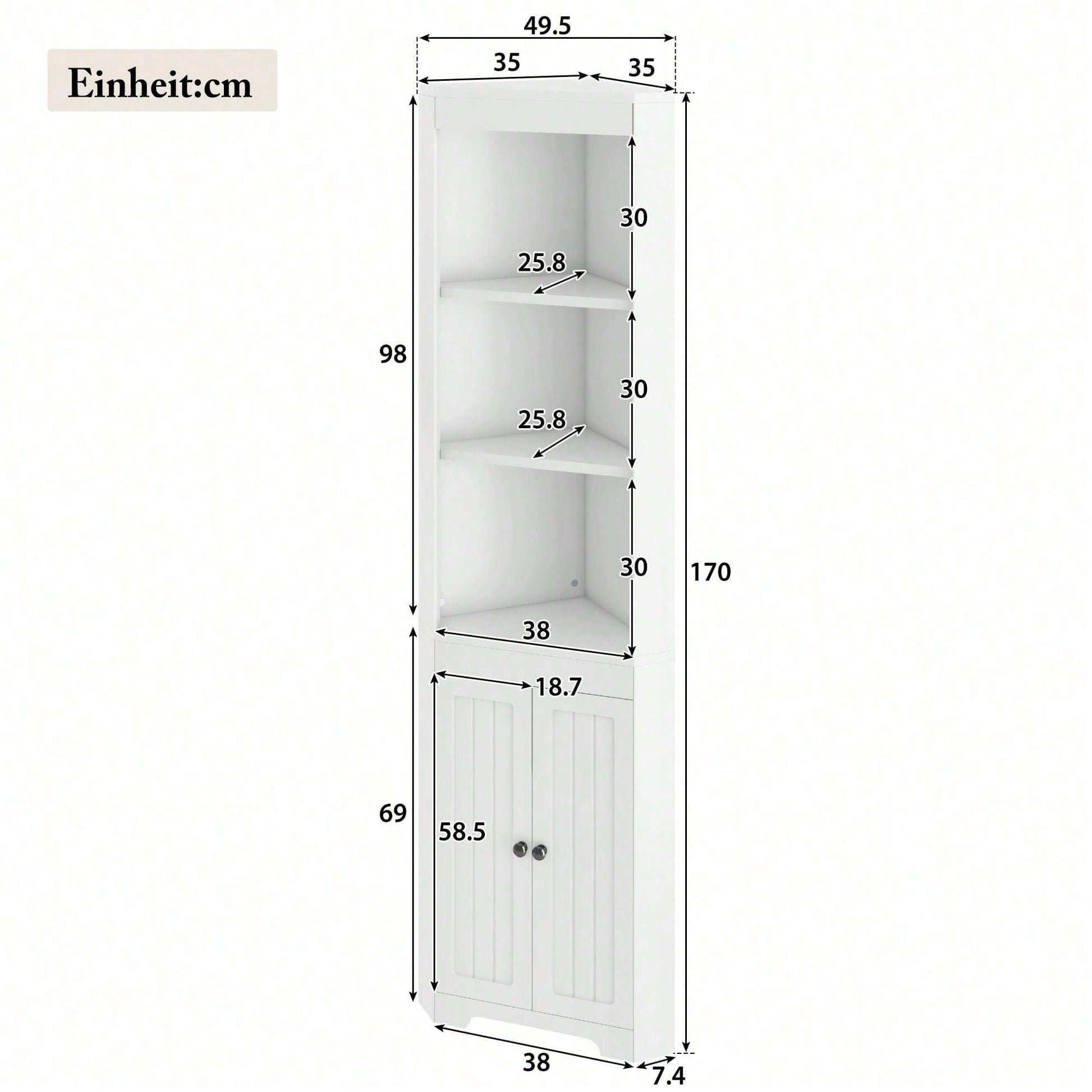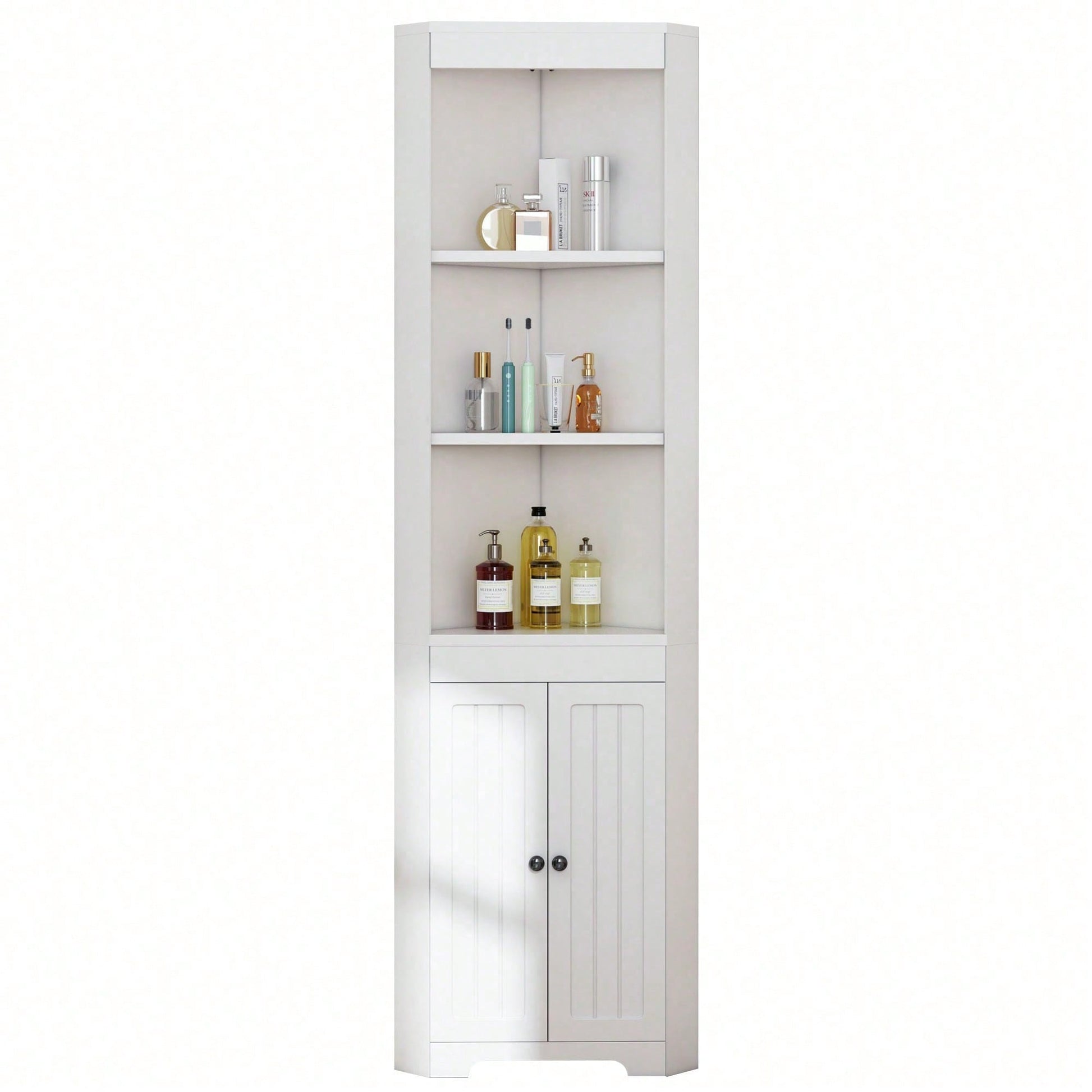 Matériaux de haute qualité : Fabriquée en MDF, cette armoire de salle de bain offre une structure robuste et une excellente capacité de charge. Sa conception robuste permet de supporter le poids de divers articles de toilette et objets du quotidien, ce qui la rend plus durable. Grand espace de rangement : Trois compartiments ouverts en haut accueillent les articles de toilette et les décorations du quotidien ; en dessous, une armoire spacieuse permet de ranger des objets supplémentaires. Les séparateurs sont réglables en hauteur, pour un rangement plus flexible et pratique. Design triangulaire : Grâce à sa conception triangulaire unique, l'armoire de salle de bain s'intègre parfaitement dans un coin de la pièce, économisant ainsi de l'espace tout en étant élégante et raffinée. C'est le choix idéal pour les petites salles de bain. Style minimaliste blanc : Adoptant un style minimaliste blanc avec des lignes douces et naturelles et une coordination harmonieuse des couleurs, elle s'intègre facilement à différents styles d'intérieur et incarne un style de vie élégant. Montage et entretien faciles : L'armoire de salle de bain est conçue avec raffinement et est facile à monter, permettant aux novices de se lancer sans problème. Sa surface lisse et régulière facilite le nettoyage et l'entretien quotidiens. Essuyez-le simplement avec un chiffon humide pour qu'il conserve son aspect neuf longtemps. Meuble haut de salle de bain, trois étagères ouvertes, portes battantes étanches, blanc Ce meuble de salle de bain est sans aucun doute le choix idéal pour votre décoration ! Fabriqué en MDF de haute qualité, il présente une structure robuste et résistante à l'humidité, garantissant sa stabilité même après une utilisation prolongée. Son design allie les trois étagères ouvertes supérieures à l'armoire spacieuse inférieure, offrant un espace de rangement généreux et varié. La hauteur des séparateurs est réglable en continu pour répondre à tous vos besoins de rangement. Son design triangulaire unique est non seulement esthétique, mais optimise également l'espace, créant une salle de bain plus ordonnée et mieux organisée. De plus, son style blanc et minimaliste respire l'élégance et s'intègre facilement à différents styles d'intérieur. De plus, il est facile à assembler et est livré avec une notice détaillée pour une installation simplifiée. Choisissez-le pour embellir votre salle de bain ! Informations produit Couleur : Blanc Matériau : MDF Dimensions : 49,5 x 35 x 170 cm Forme : Triangulaire Style : Moderne Nombre de portes : 2 Étagère réglable : Oui Quincaillerie incluse : Oui Assemblage : Assemblage requis Quantité par paquet : 1 Poids net : 22,4 kg Pays d'origine : Chine