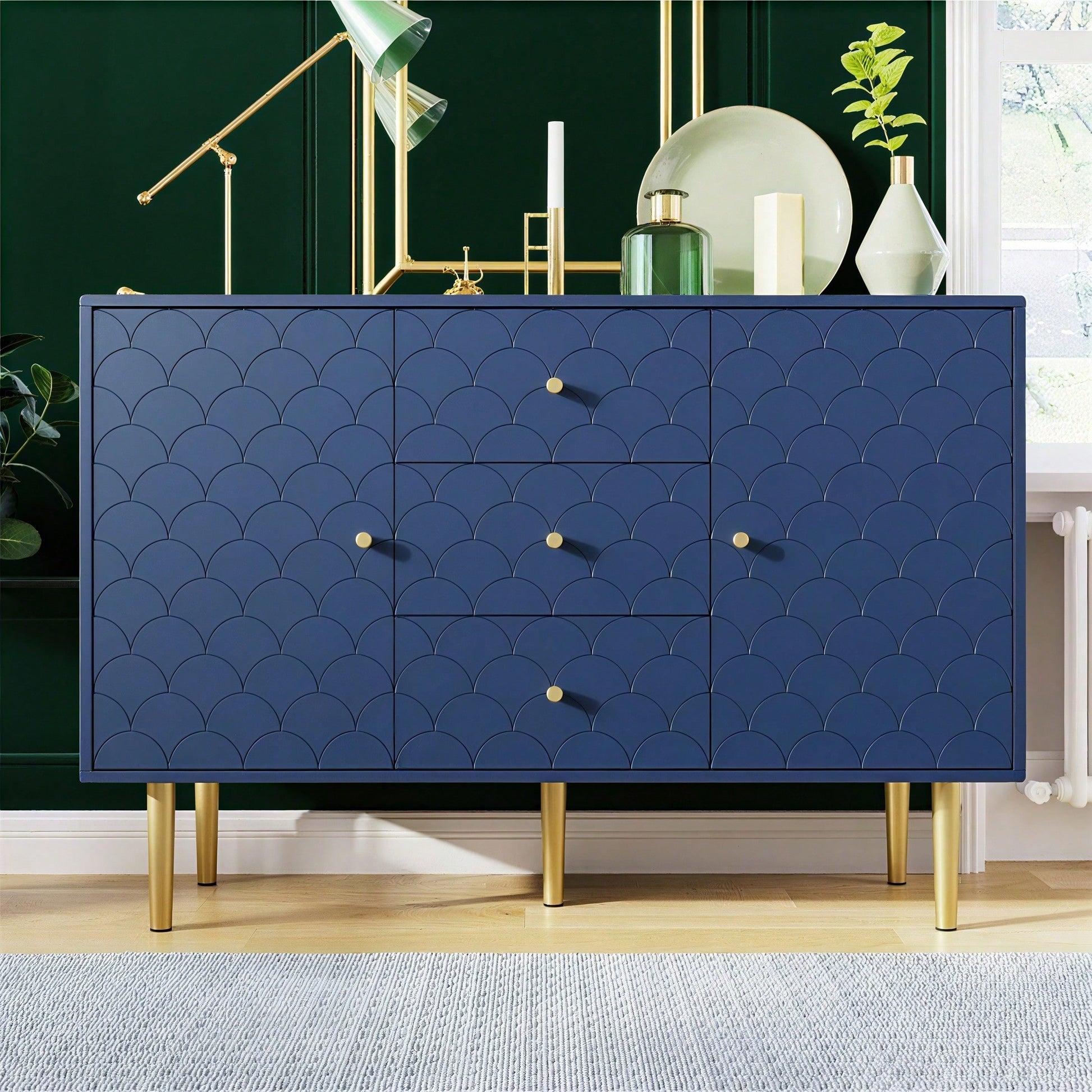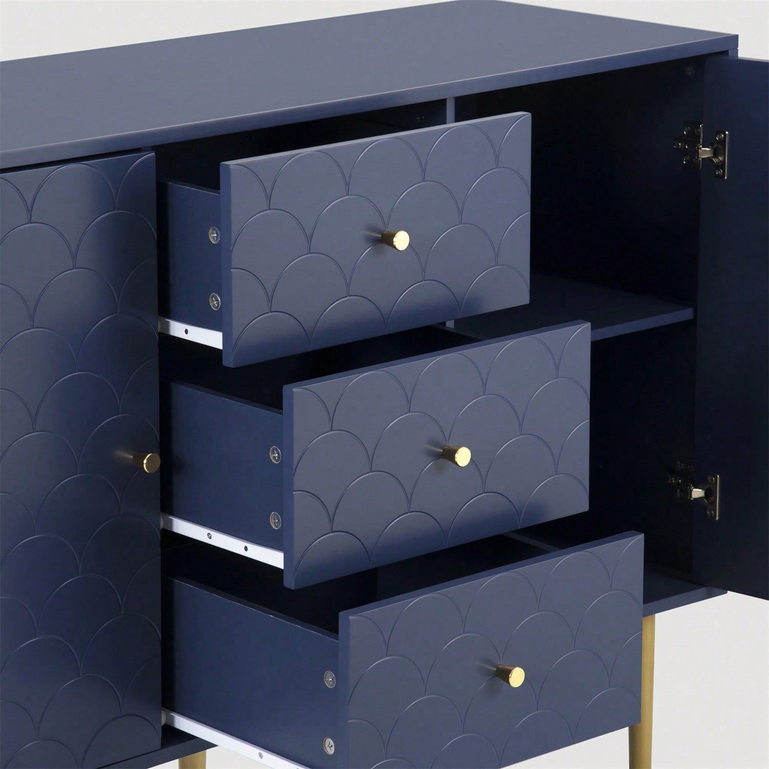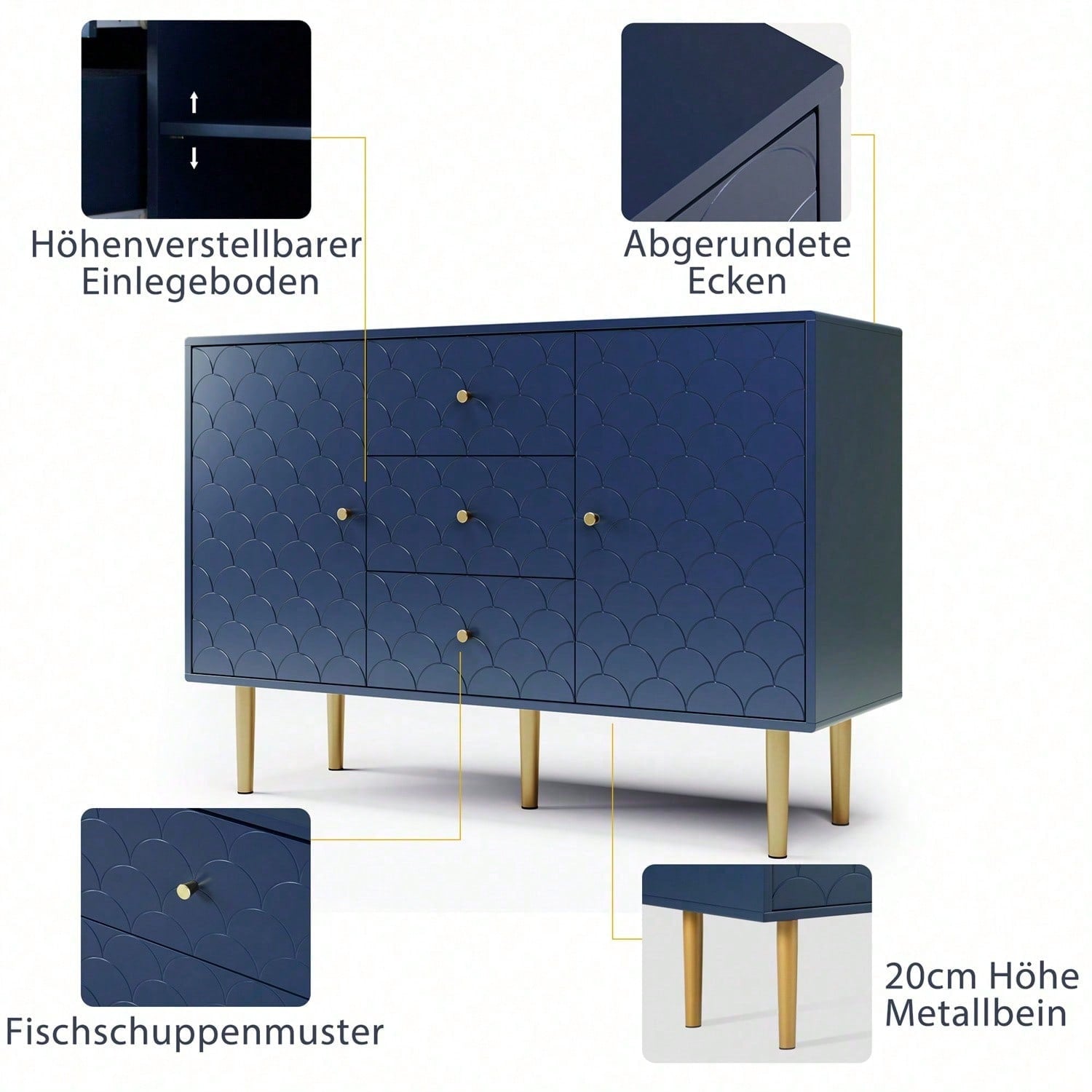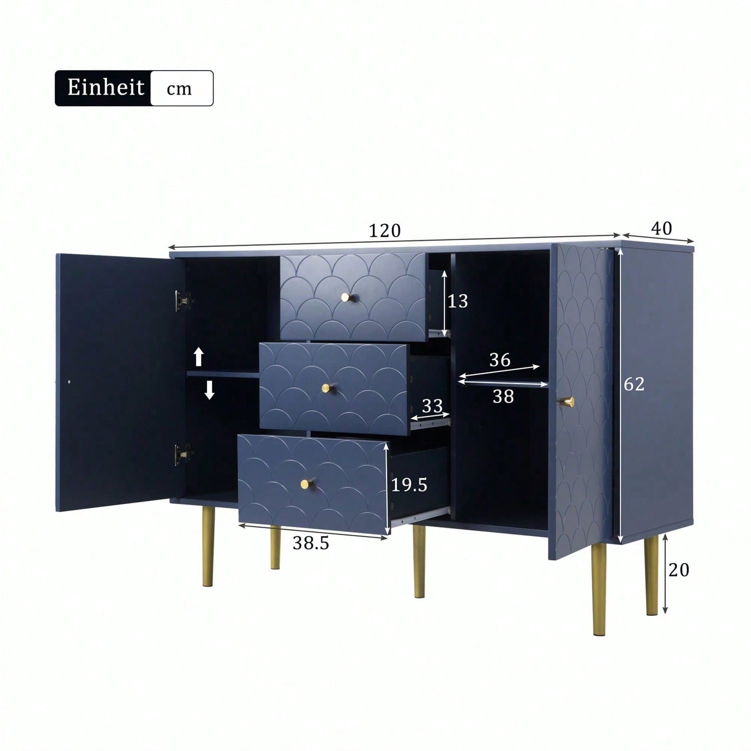 Plateau unique à motif écailles de poisson : Le motif écailles de poisson bleu marine et les pieds en métal couleur champagne confèrent à ce meuble une touche d'élégance dans la chambre et le salon. Il est équipé de charnières métalliques de haute qualité permettant d'ajuster l'espace entre les portes et les tiroirs, conférant aux panneaux un motif écailles de poisson cohérent et esthétique. Matériau haut de gamme : Des matériaux de haute qualité protègent des odeurs chimiques et le produit est prêt à l'emploi immédiatement après assemblage. Bois de haute qualité, rails de qualité : tout est conçu pour une utilisation confortable. Étagère réglable en hauteur : Avec ses trois tiroirs spacieux au milieu et ses portes battantes à gauche et à droite, une étagère réglable en hauteur divise l'espace disponible en deux compartiments variables. Elle offre un grand espace de rangement pour le linge, les bijoux et autres objets. 6 cm entre les réglages supérieur et inférieur. Angles arrondis : Des angles trop tranchants peuvent facilement causer des blessures. C'est pourquoi ce meuble présente des angles arrondis, très pratiques pour les familles avec enfants. Durabilité : Construction robuste, pieds de table robustes, finition peinture de haute qualité et MDF sélectionné. Description 905467AAB Dimensions : H82 x L120 x P40 cm Matériau : Bois massif + panneaux de particules Couleur : Bleu marine Dimensions intérieures des tiroirs : H13 x L32 x P33 cm Capacité de charge du plateau : 91 kg Capacité de charge des tiroirs : 20 kg Garde au sol : 20 cm Quantité par colis : 2 Contenu du colis : Commode + quincaillerie