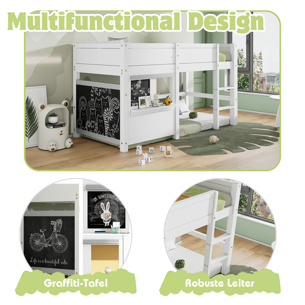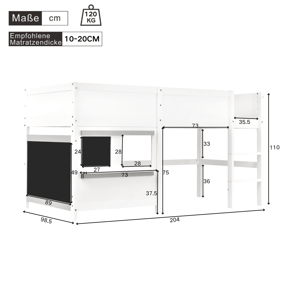 ausbett Kinderbett Spielbett Etagenbett mit zwei Brettern graffitifähig mit kleiner Ablage 90x200 weiß