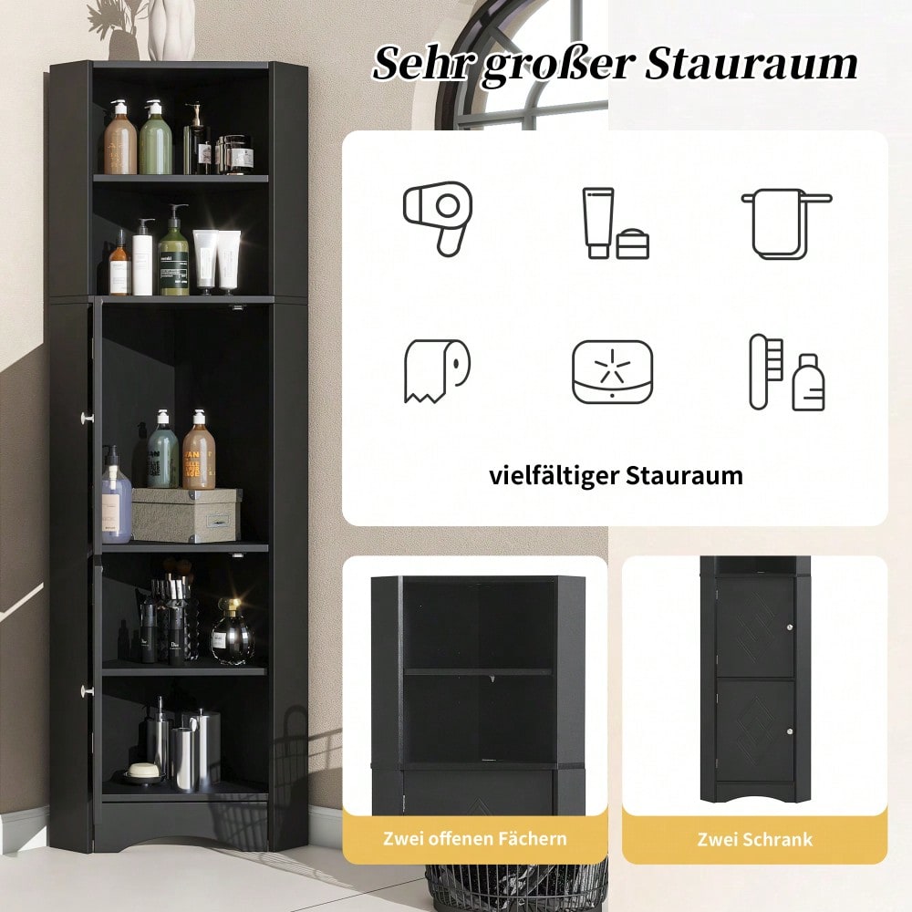 Badezimmer Eckschrank mit 2 Ablagefächern & höhenverstellbarem Einlegeboden, Badmöbel Aufbewahrungsschrank 36,5x36,5x155 cm, schwarz