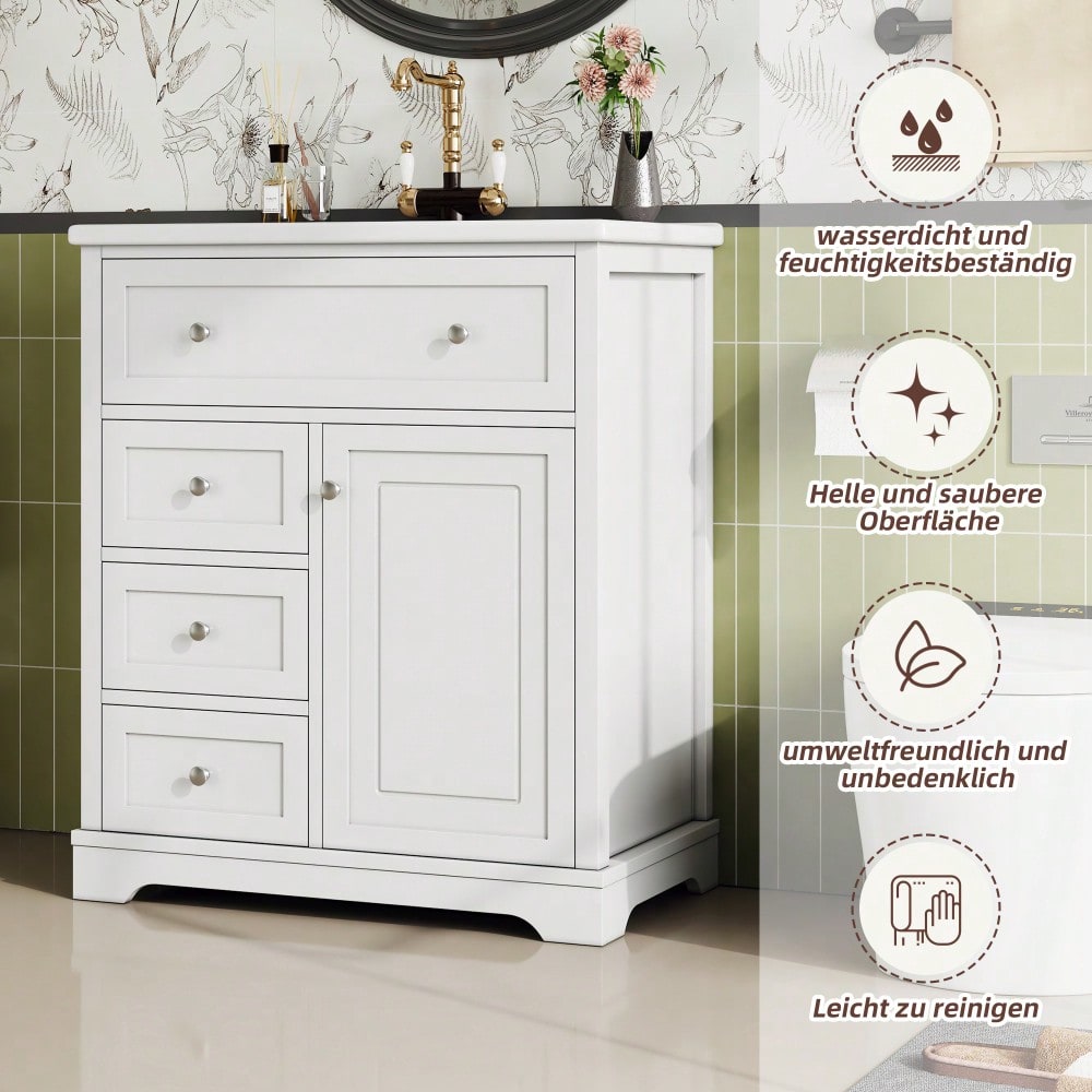 Badezimmer Standschrank mit Keramikwaschbecken, feuchtigkeitsbeständig & geräuscharm, 76x46x87 cm, weiß - inkl. Unterschrank & Klappschublade