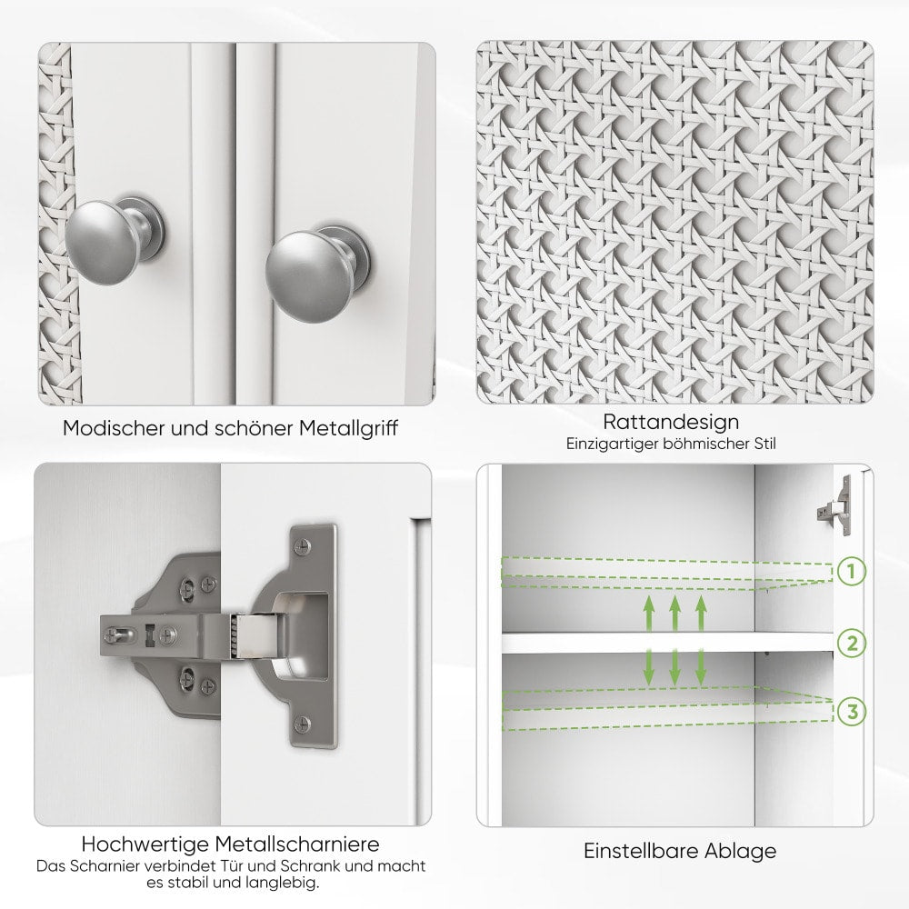 【Böhmisches Design】Kombiniert modernen Stil mit böhmischen Rattanelementen, hat der Badezimmerbodenschrank großen Stauraum und bewegliche Platten im Inneren. Es ist eine gute Wahl in Ihrem Wohnzimmer, Bad und Küche. 【Reben Design】Die Schranktür dieses Badezimmerschranks ist mit Rattanwebelementen entworfen und mit exquisiten Maltechniken abgestimmt. Die Oberseite ist mit verdickter und speziell geformter Handwerkskunst hergestellt, wodurch der gesamte Badezimmerschrank schöner und perfekt in alle Raumstile integriert werden kann. 【Geräumig und einstellbar】Dieser Badezimmerschrank ist mit verstellbaren Regalen im Inneren entworfen, die auf drei Höhen eingestellt werden können, um Ihre großen Aufbewahrungsbedürfnisse zu erfüllen. Die geschlossene Aufbewahrungsbox hinter der Tür hält Ihre Gegenstände sauber und trocken und schützt gleichzeitig Ihre Privatsphäre. 【Hochwertige Materialien】Dieser Aufbewahrungsschrank besteht aus hochwertigen Materialien wie dickem MDF und langlebiger Hardware, die langlebig sind. Es bietet starke Unterstützung für Ihre Artikel und kann dem täglichen Gebrauch standhalten. 【Multifunktionaler Gebrauch】Dieser Badezimmerregal kann nicht nur als Badezimmerorganisator verwendet werden, sondern auch als Wohnzimmer-Vitrine, kleiner Weinschrank oder Lebensmittelschrank, multifunktionaler Schrank und fügt Praktikabilität und Schönheit zu Ihrem Haus hinzu.