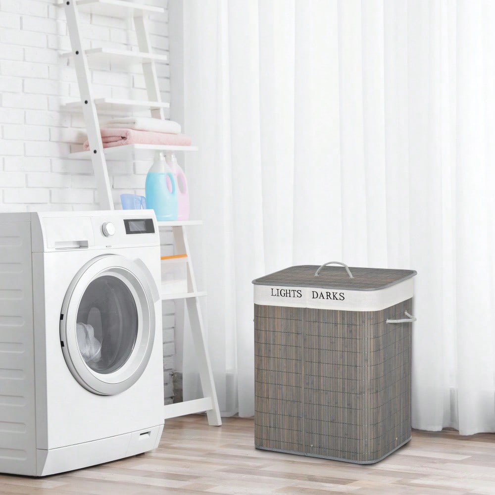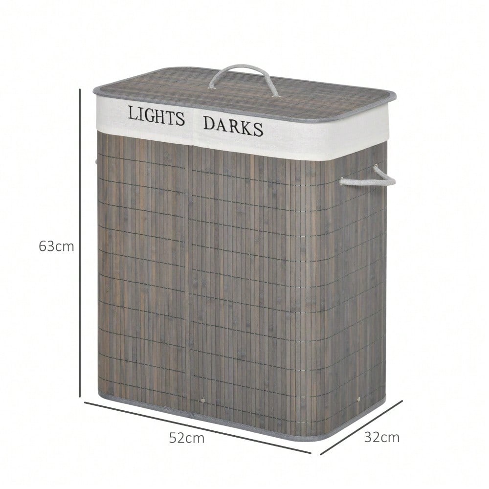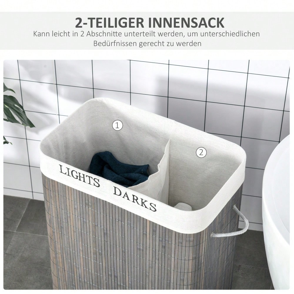 Bambus Wäschekorb 100-Liter mit 2 Fächern & klappbarem Deckel, waschbarer Tragebeutel, platzsparend, grau - von HOMCOM