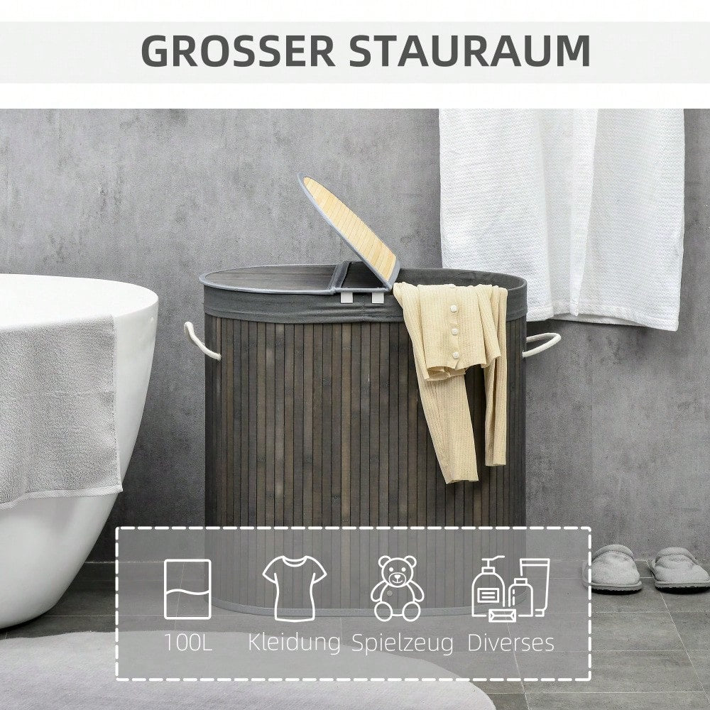 Bambus Wäschekorb 100-Liter mit Deckel & 2 Wäschesäcken, Sortierkorb mit Griffen für Waschküche, Bad & Schlafzimmer, grau - von HOMCOM