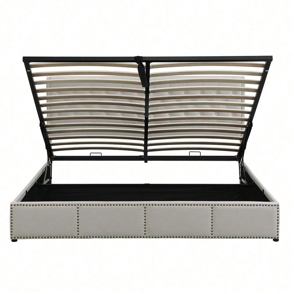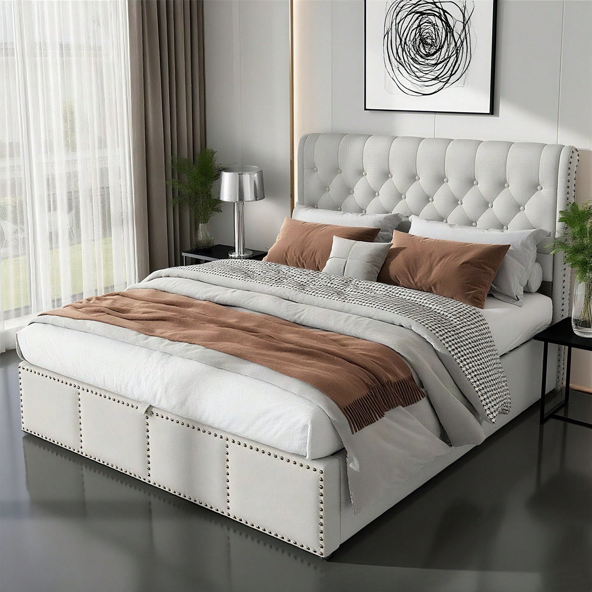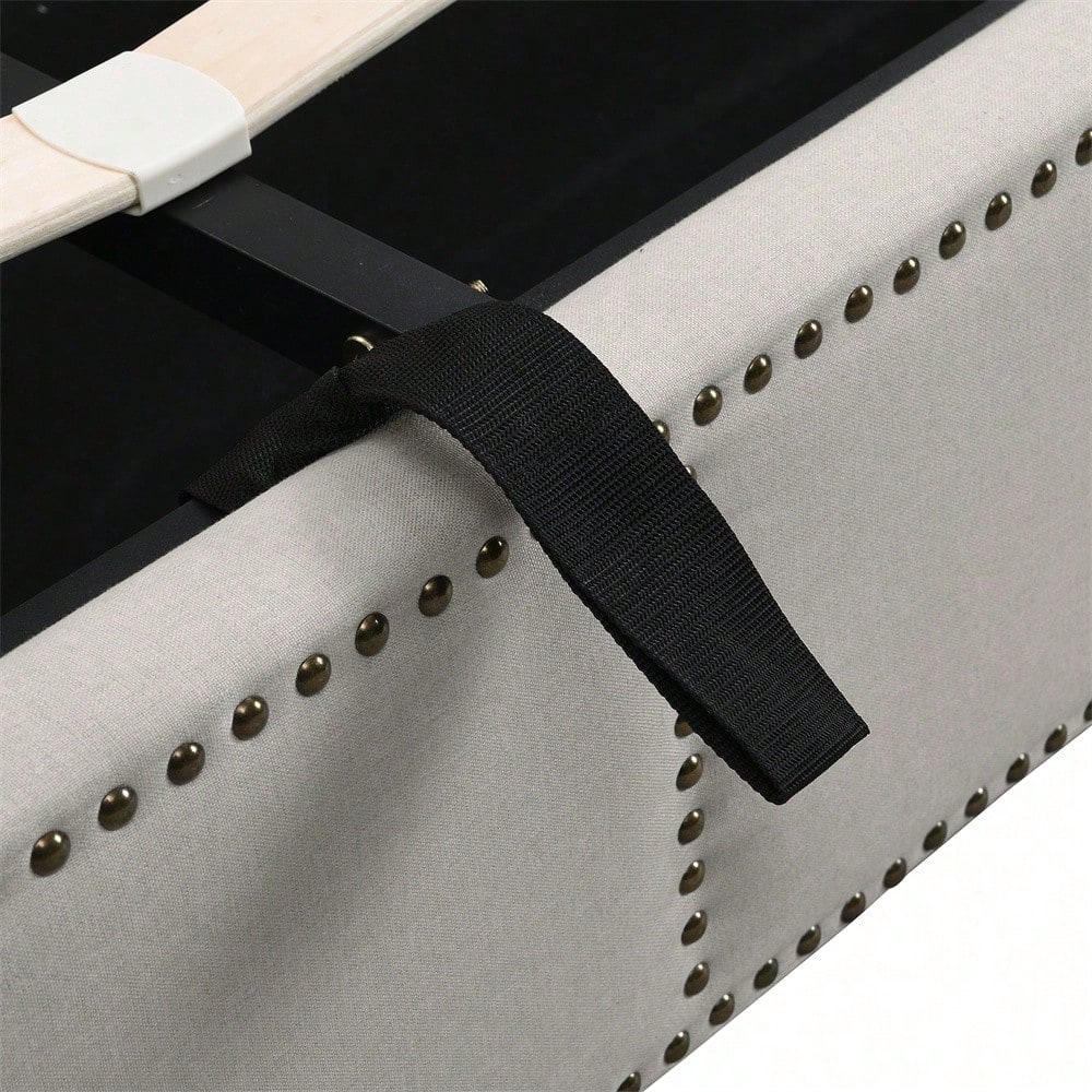 Baumwolle-Leinen Polsterbett, mit Hydraulikhebel, Aufbewahrung von Bettkästen, Nietenverzierung, 140 x 190 cm, ohne Matratze