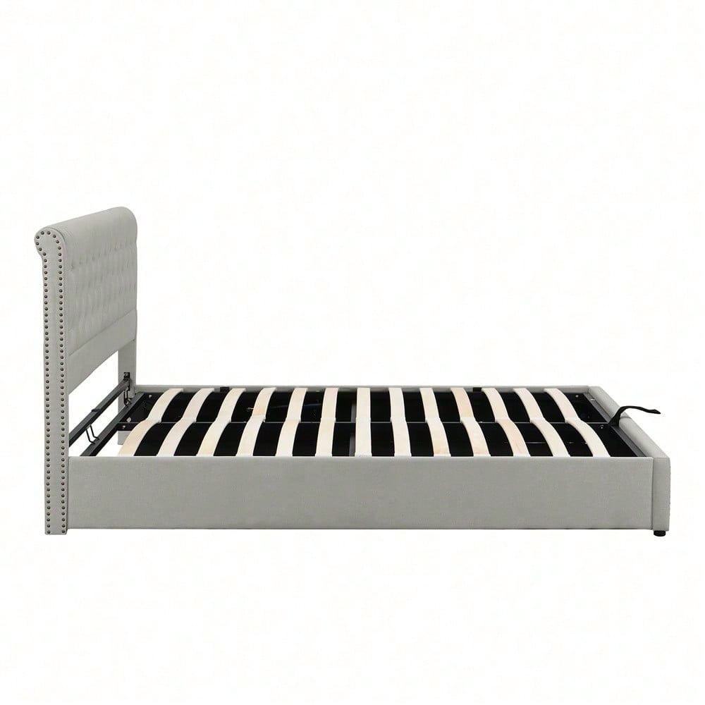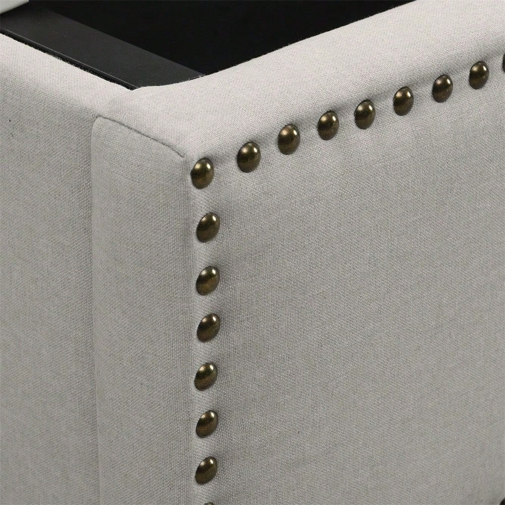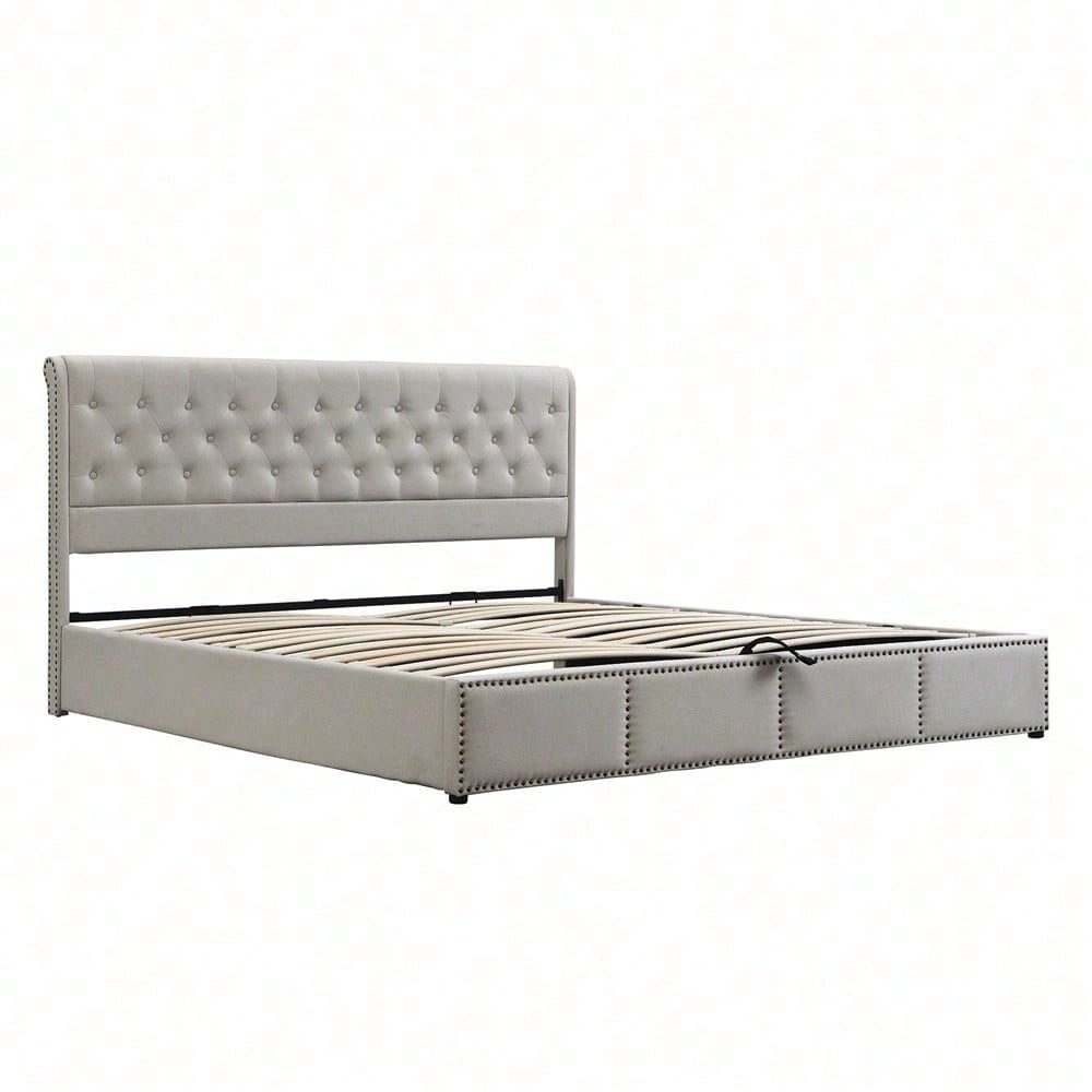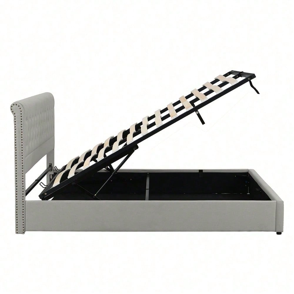 Baumwolle-Leinen Polsterbett, mit Hydraulikhebel, Aufbewahrung von Bettkästen, Nietenverzierung, 140 x 190 cm, ohne Matratze