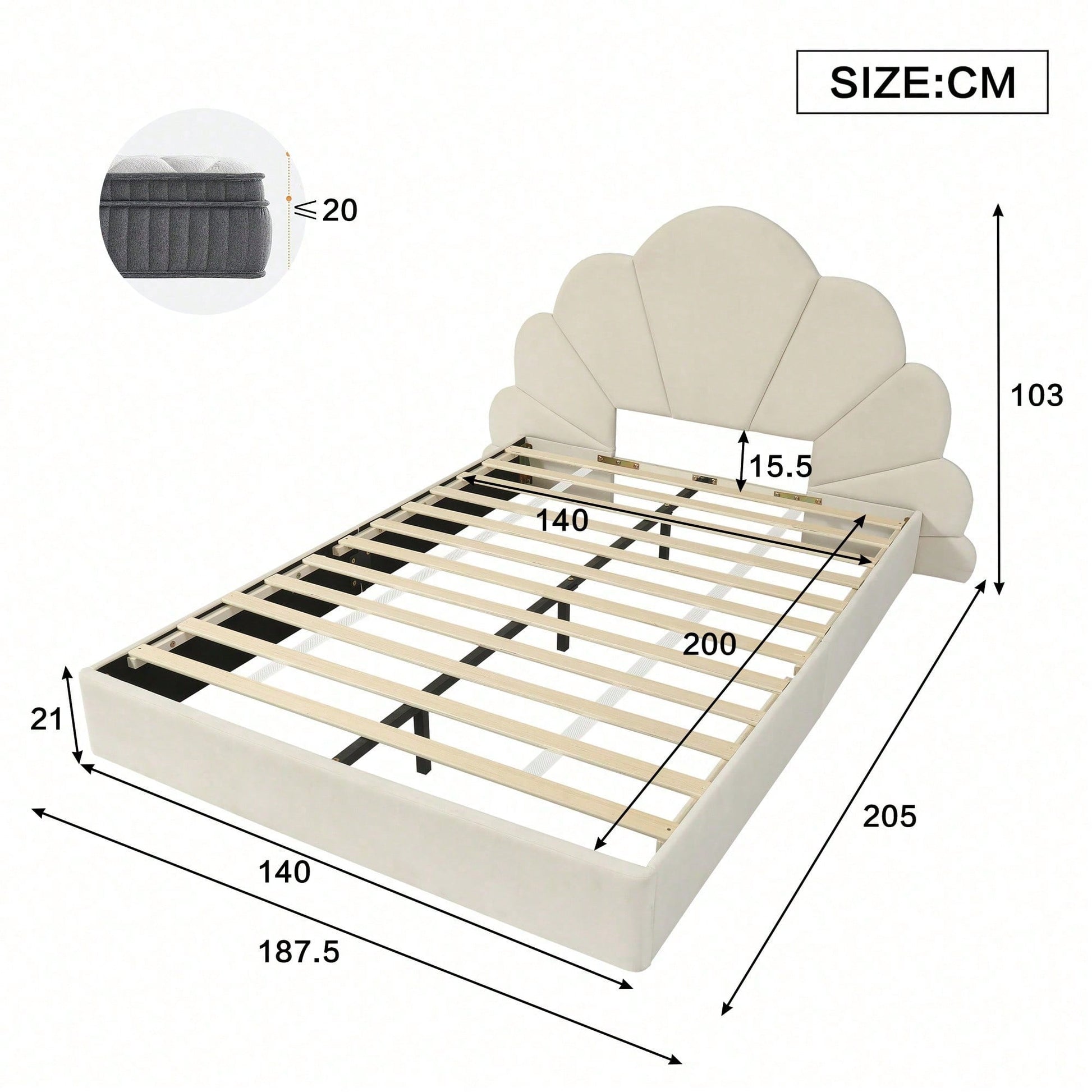 Beiges Samt-Doppelbett mit Blütenblatt-Kopfteil – Modernes Polsterbett 140x200 cm, Elegantes & Bequemes Bettgestell mit Geschwungenem Design