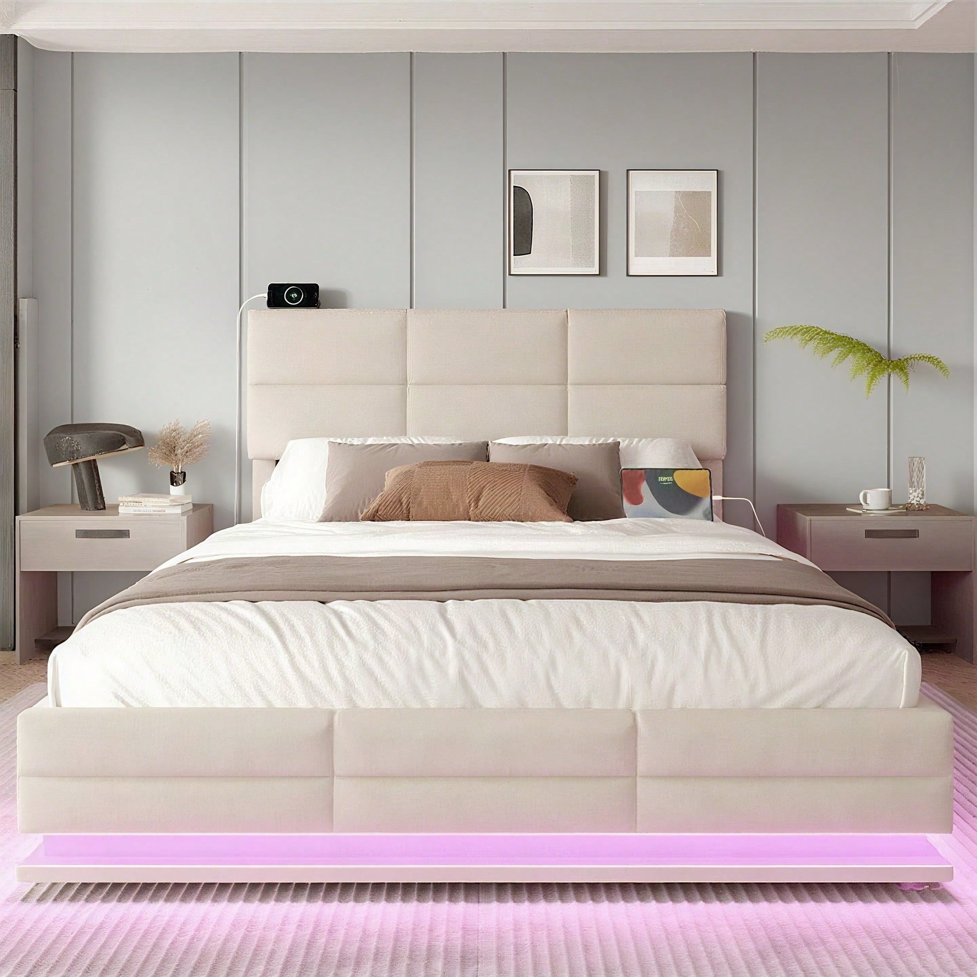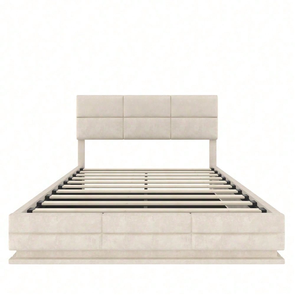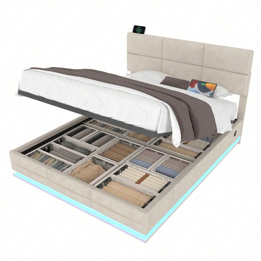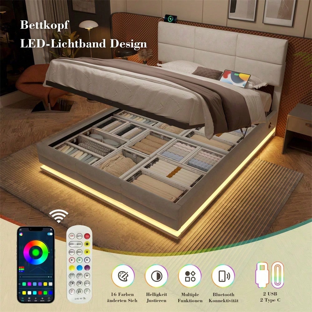 Beiges Velours-Polsterbett 160x200 cm – Höhenverstellbares Kopfteil mit LED-Beleuchtung, USB-C, hydraulischem Lift & XXL-Stauraum