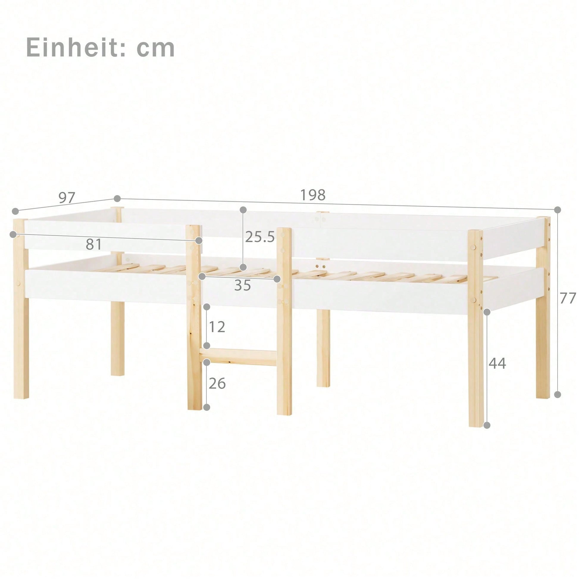 Gesamtabmessung 97x198x77(BxLxH) Plattenmaterial Kiefer-Massivholz+MDF Anwendbare Matratze(Matratze nicht dabei) 90 x 190 cm Max. Benutzergewicht 120KG/264 LBS Stauraum unter dem Bett 44cm Boxspring erforderlich keine Montage erforderlich Ja Inhalt des Pakets Bettgestell+Lattenrost Menge der Paket 1 Einzigartiges Design Halbhohes Bett Breite des Einstiegs 35 cm