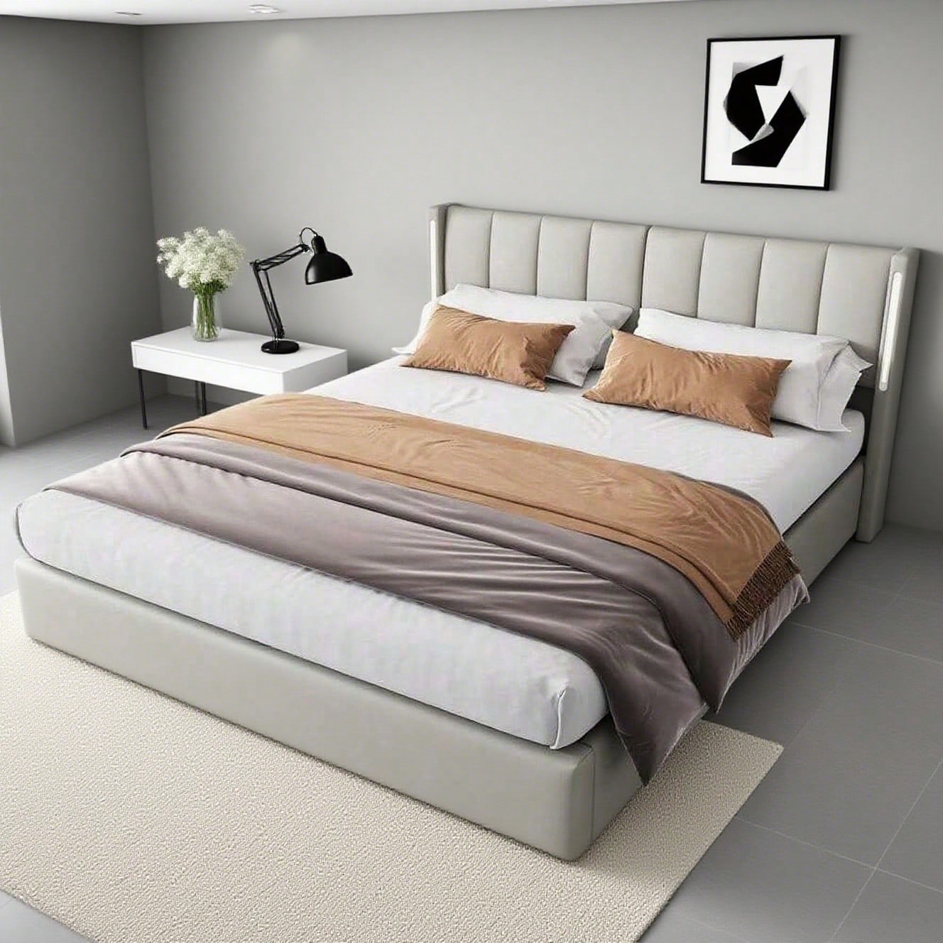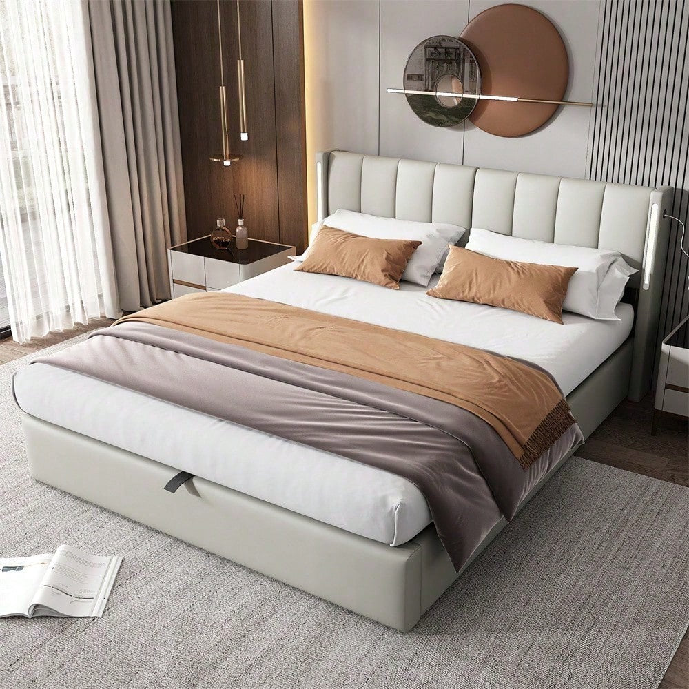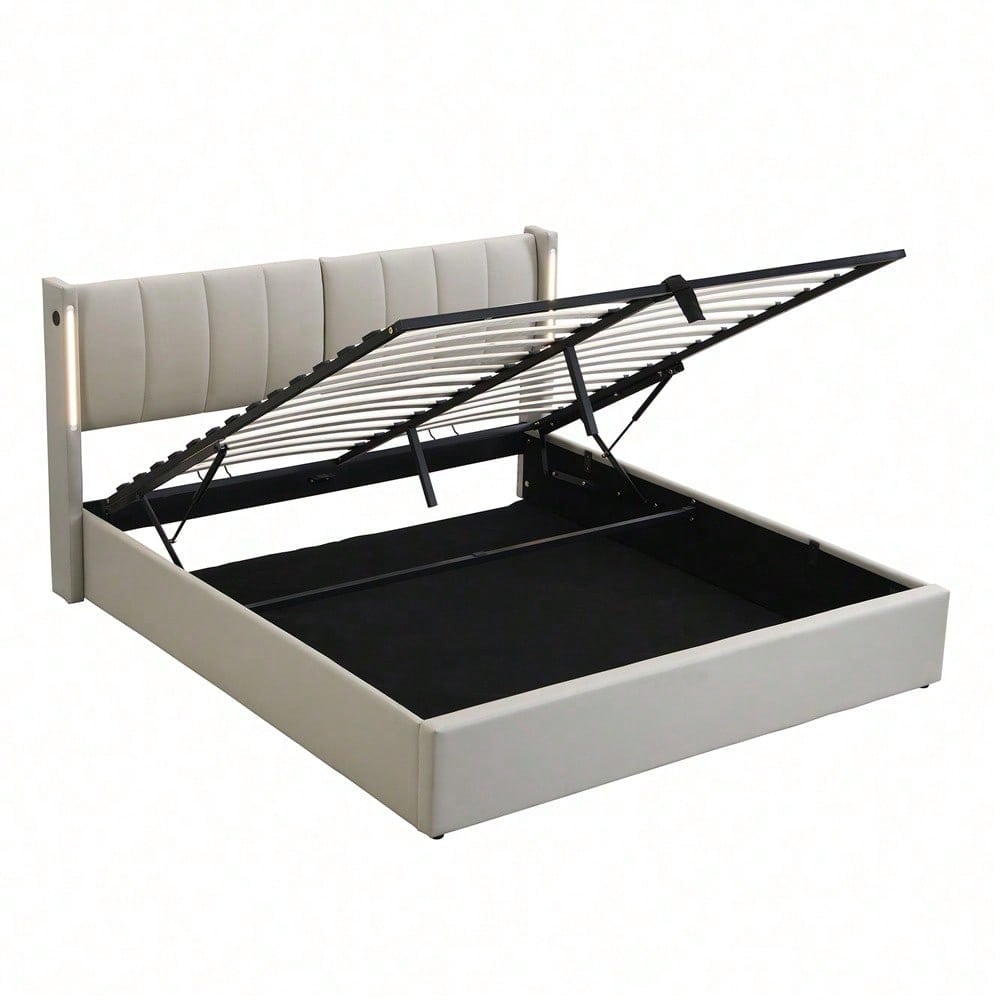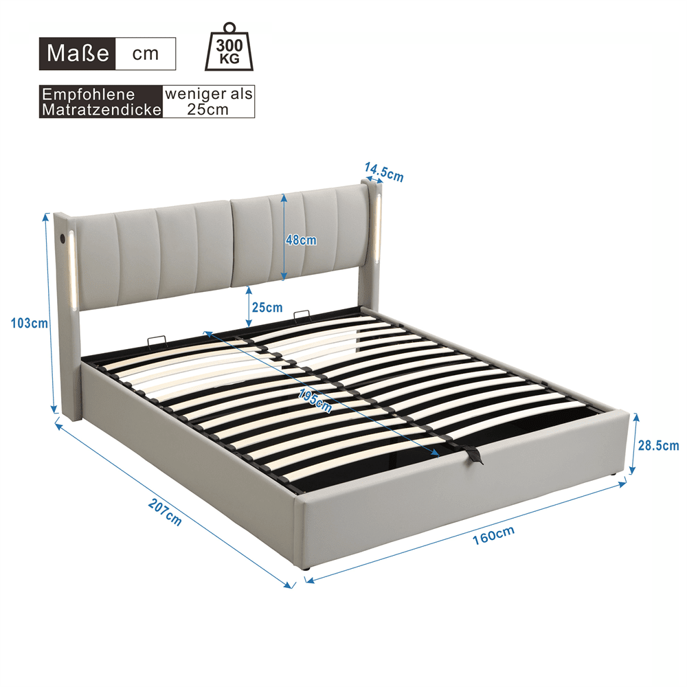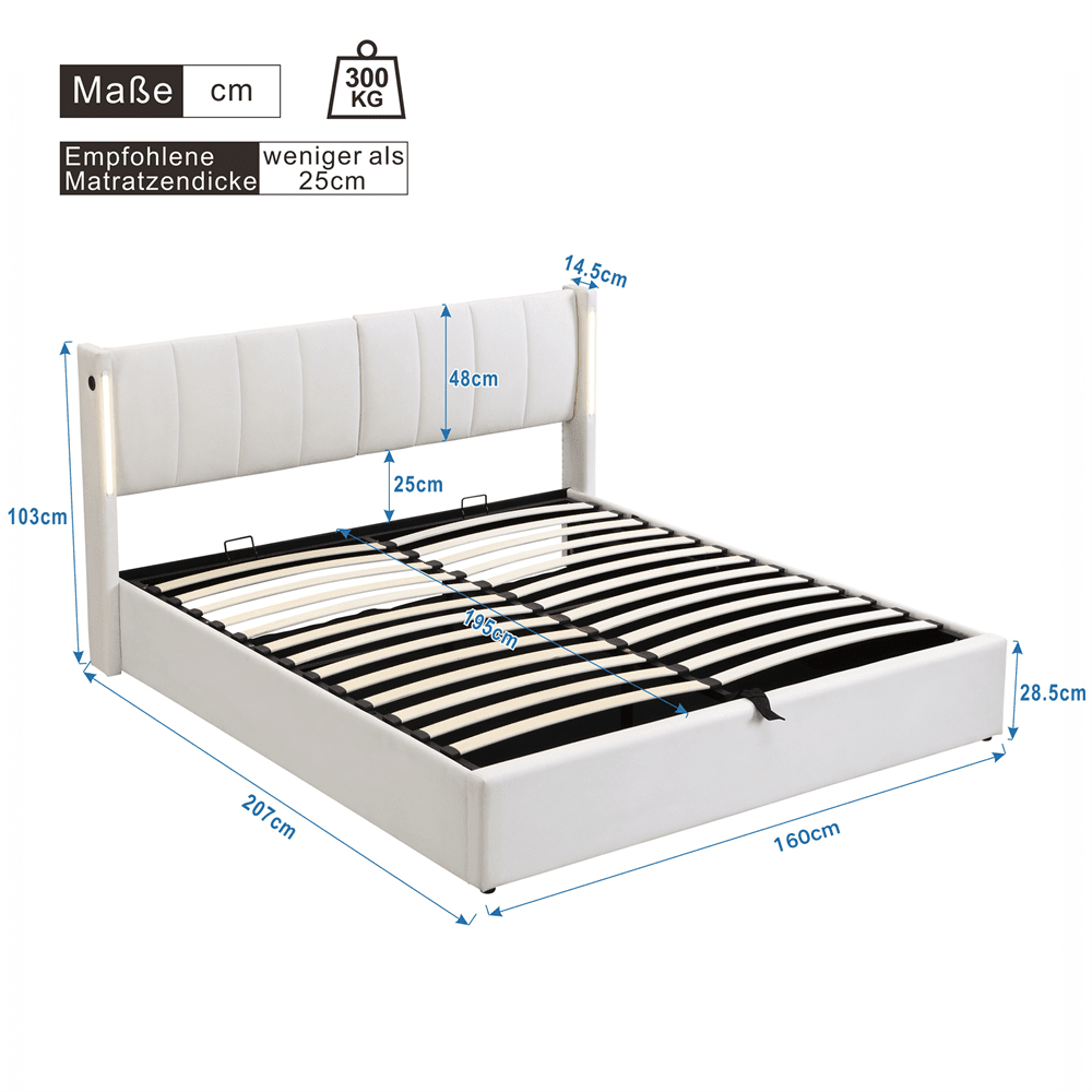 Design multifonction : Cette lampe de chevet offre de multiples fonctions, notamment un port USB rechargeable, un éclairage LED et un réglage de l'angle sur trois niveaux. Elle rend le lit plus pratique et répond aux différents besoins des utilisateurs, comme charger, lire ou regarder des films. Contrôle intelligent : La lampe de chevet LED est équipée d'une télécommande permettant de régler facilement la luminosité et la fréquence de clignotement. Grâce à ce contrôle intelligent, vous pouvez adapter l'éclairage à vos préférences et besoins, créant ainsi un environnement de sommeil confortable ou la lumière idéale pour lire. Matériau imperméable : La surface du lit est en PU imperméable, ce qui lui confère une plus grande durabilité et facilite son nettoyage et son entretien. Cette caractéristique est particulièrement adaptée aux éclaboussures d'eau ou aux déversements accidentels du quotidien. Apparence moderne : Cette lampe de chevet présente une finition blanche simple et élégante, parfaitement adaptée à un intérieur moderne. Le design du lit, doté d'interfaces Type-C et LED, est non seulement puissant, mais ajoute également une touche de modernité et de technologie, rendant le lit plus attrayant. Confortable et pratique : L'épaisseur recommandée du matelas est inférieure à 28 cm (ne pas dépasser cette épaisseur, car cela bloquerait le lit et empêcherait le réglage de l'inclinaison), la puissance de l'éclairage LED est de 4 W et la capacité de charge est de 300 kg. L'angle de réglage du lit est de 0 à 30 °. Description Détails du produit Largeur de l'espace séjour : 160 cm Longueur de l'espace séjour : 200 cm Type de sommier à lattes : Un sommier à lattes est inclus. Type de matelas : Matelas non inclus Détails : Rangement : Sous le lit Longueur : 207 cm Largeur : 160 cm Hauteur : 103 cm Poids : 49 kg Remarque : Dimensions : Toutes les dimensions sont approximatives. Capacité de charge maximale : 300 kg Housse : PU Livraison : Démonté, en 2 colis (Ce produit sera divisé en 2 colis pour la livraison. Ils pourraient ne pas arriver simultanément. Merci de votre patience.)