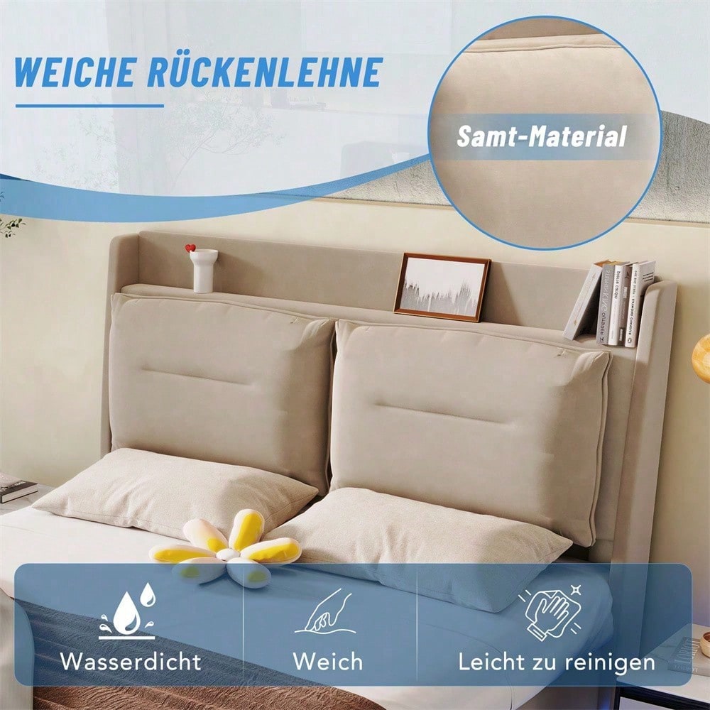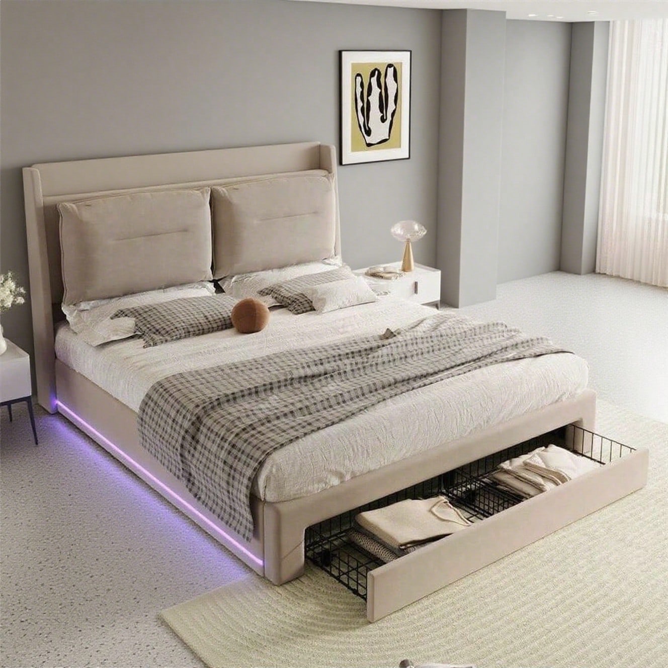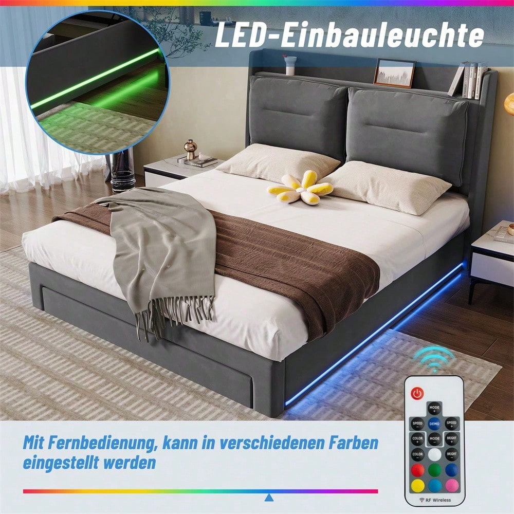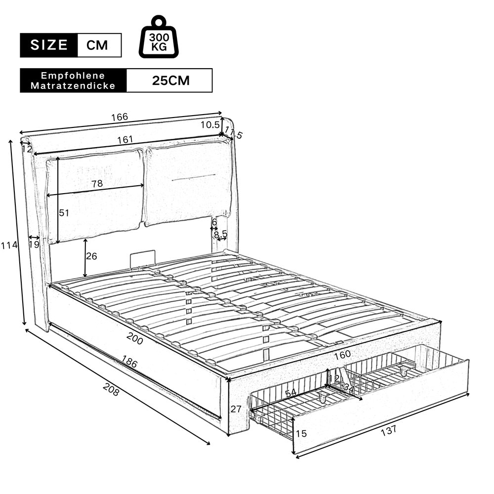 RANGEMENT MULTIFONCTIONNEL : Ce lit offre de nombreux rangements, dont un lit de rangement hydraulique, un tiroir de rangement 2 en 1 au pied du lit et une tête de lit. Ces rangements pratiques vous permettent d'optimiser l'espace et de garder votre chambre bien rangée et organisée. DOSSIER CONFORTABLE : Le lit est équipé de deux dossiers rembourrés qui le rendent plus confortable et offrent soutien et confort pour lire, se détendre ou regarder la télévision au lit. BARRE LUMINEUSE LED RÉGLABLE : La barre lumineuse LED intégrée de chaque côté du lit offre non seulement un éclairage doux, mais peut également être réglée sur différentes couleurs pour créer différentes ambiances et rendre votre chambre plus chaleureuse et romantique. Conception stable : Le lit est équipé de deux pieds réglables à la tête et au pied du lit, soit quatre au total. Cette conception assure la stabilité du lit et s'adapte à différents types de sol, garantissant stabilité et . MATÉRIAU DE QUALITÉ : Le cadre de lit est en velours, doux et confortable, mais aussi durable et résistant à l'usure. De plus, le sommier à lattes offre un bon soutien, prolongeant ainsi la durée de vie du matelas et garantissant un sommeil de qualité. Description Détails du produit Dimensions : Voir l'image ci-dessus. Dimensions : Voir l'image ci-dessus. Remarque : Toutes les dimensions sont approximatives. Matière principale : Velours Capacité de charge maximale : 300 kg Pays d'origine : Chine Dimensions du matelas : 160 x 200 cm Poids net : 55,1 kg
