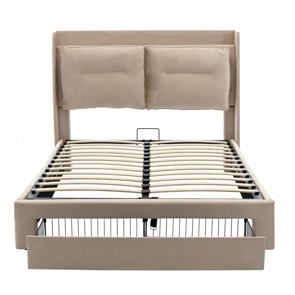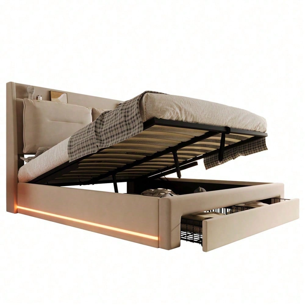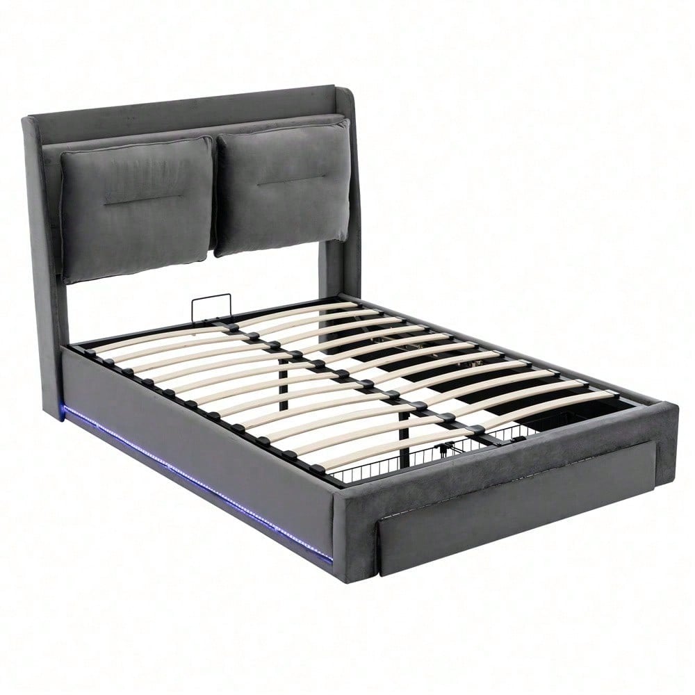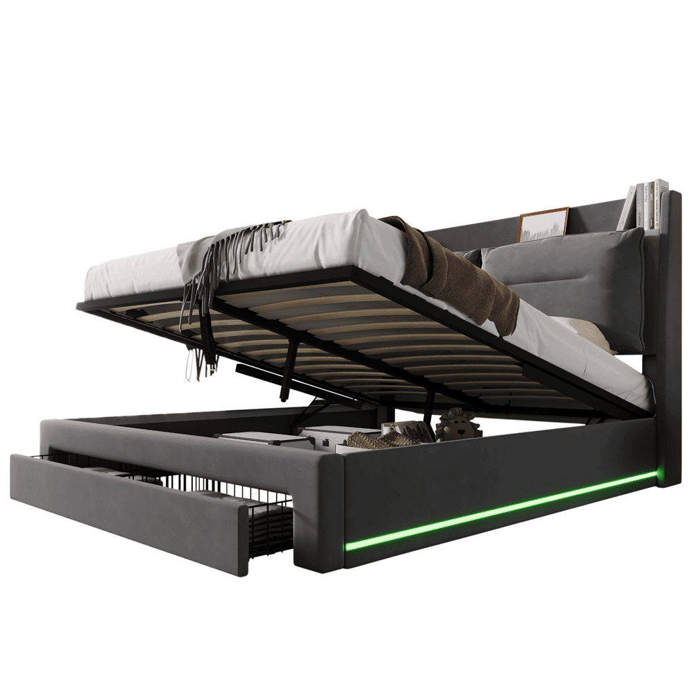 RANGEMENT MULTIFONCTIONNEL : Ce lit offre de nombreux rangements, dont un lit de rangement hydraulique, un tiroir de rangement 2 en 1 au pied du lit et une tête de lit. Ces rangements pratiques vous permettent d'optimiser l'espace et de garder votre chambre bien rangée et organisée. DOSSIER CONFORTABLE : Le lit est équipé de deux dossiers rembourrés qui le rendent plus confortable et offrent soutien et confort pour lire, se détendre ou regarder la télévision au lit. BARRE LUMINEUSE LED RÉGLABLE : La barre lumineuse LED intégrée de chaque côté du lit offre non seulement un éclairage doux, mais peut également être réglée sur différentes couleurs pour créer différentes ambiances et rendre votre chambre plus chaleureuse et romantique. Conception stable : Le lit est équipé de deux pieds réglables à la tête et au pied du lit, soit quatre au total. Cette conception assure la stabilité du lit et s'adapte à différents types de sol, garantissant stabilité et . MATÉRIAU DE QUALITÉ : Le cadre de lit est en velours, doux et confortable, mais aussi durable et résistant à l'usure. De plus, le sommier à lattes offre un bon soutien, prolongeant ainsi la durée de vie du matelas et garantissant un sommeil de qualité. Description Détails du produit Dimensions : Voir l'image ci-dessus. Dimensions : Voir l'image ci-dessus. Remarque : Toutes les dimensions sont approximatives. Matière principale : Velours Capacité de charge maximale : 300 kg Pays d'origine : Chine Dimensions du matelas : 160 x 200 cm Poids net : 55,1 kg