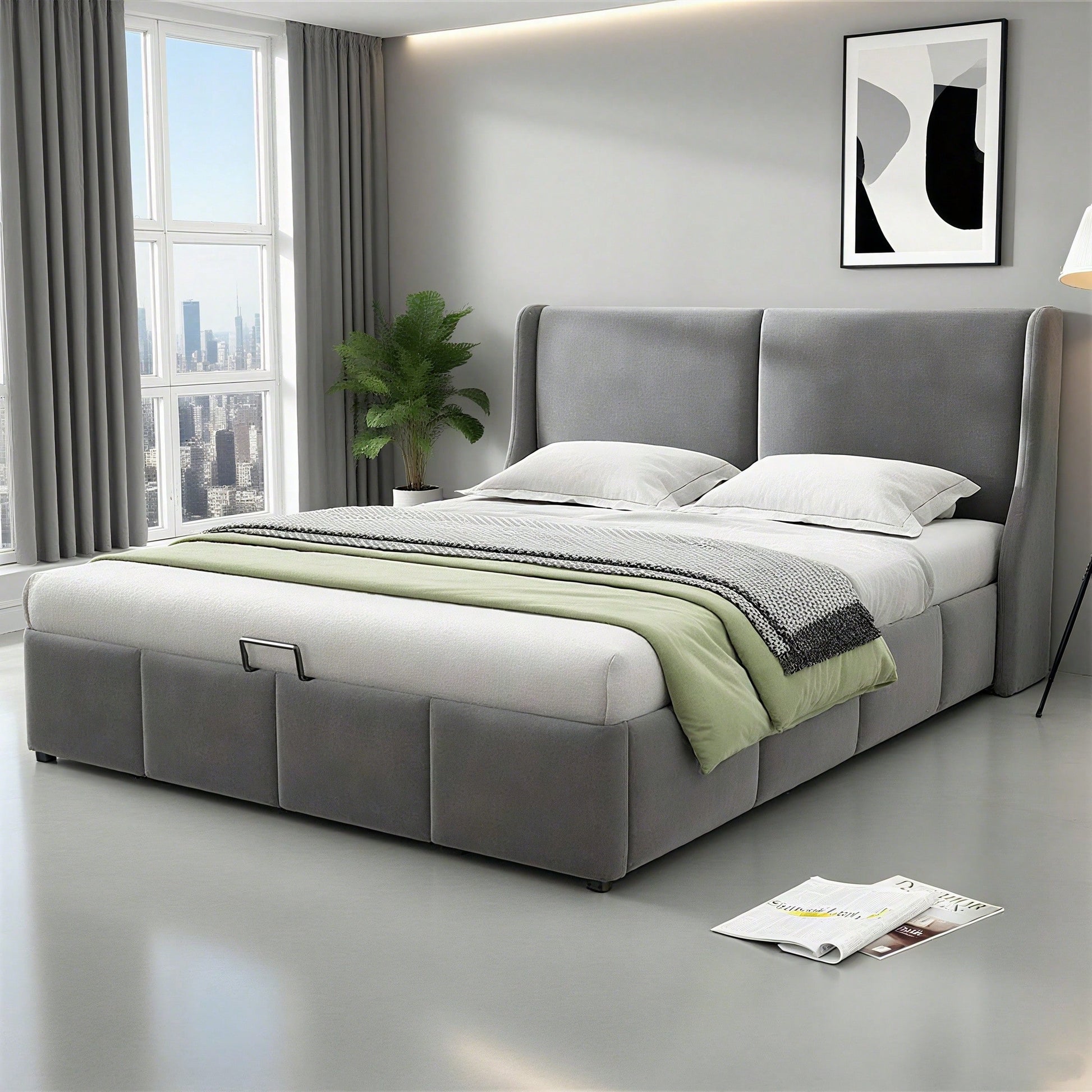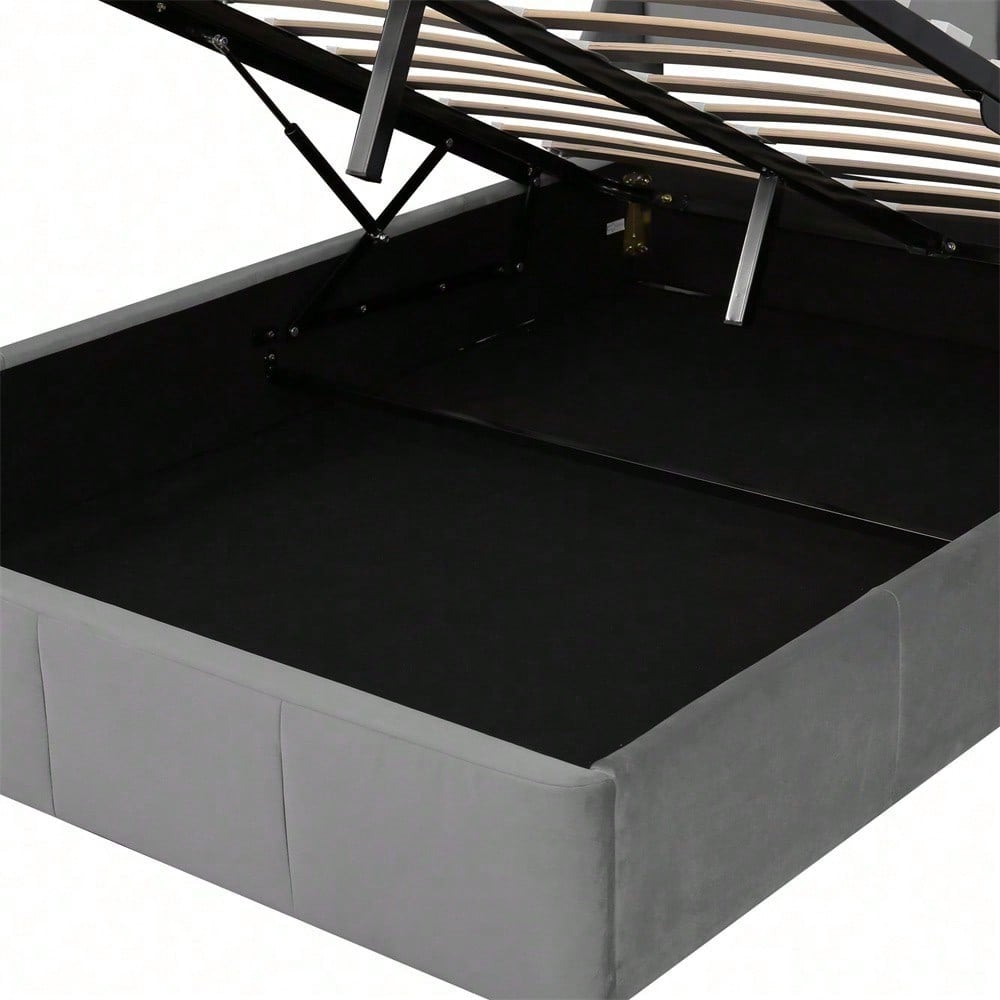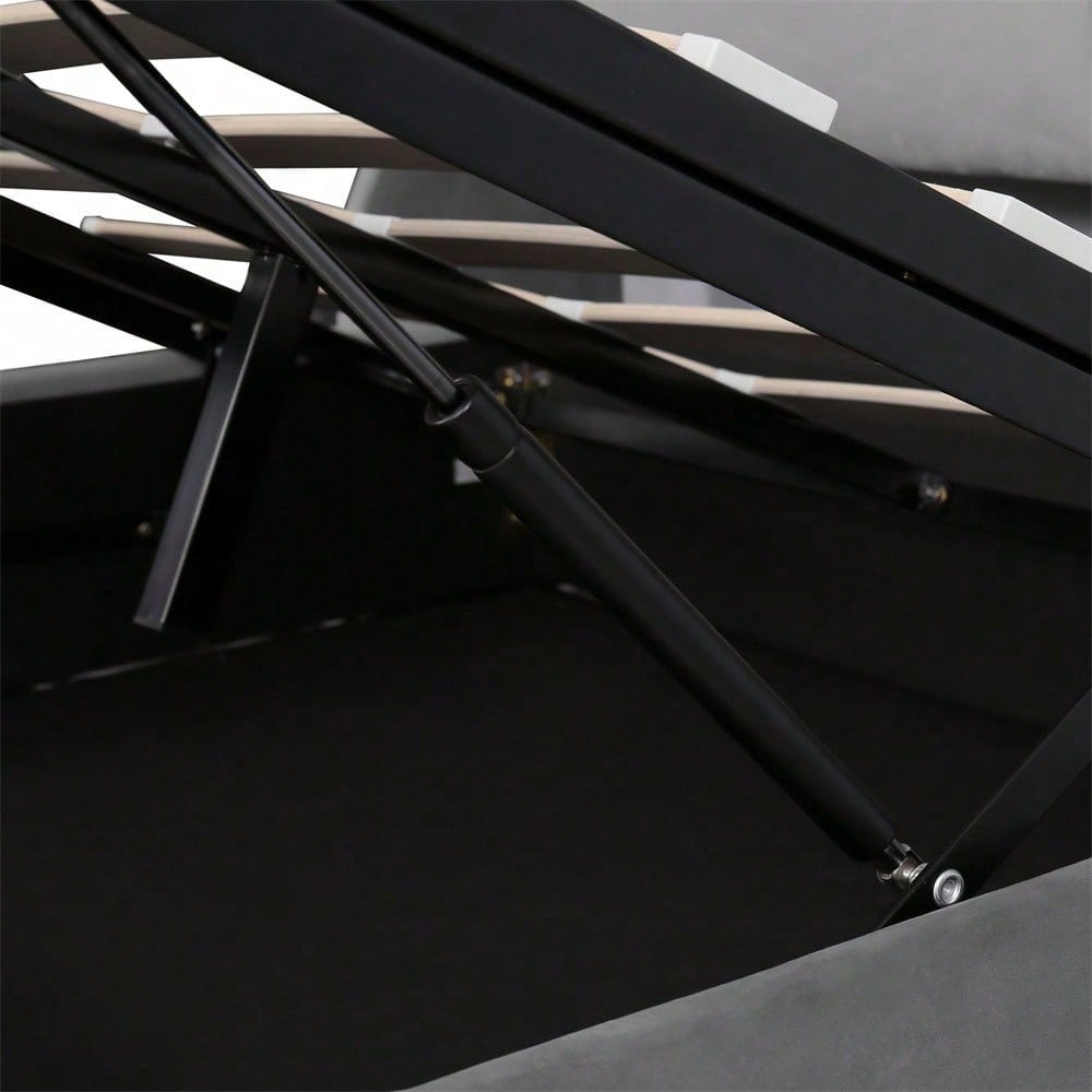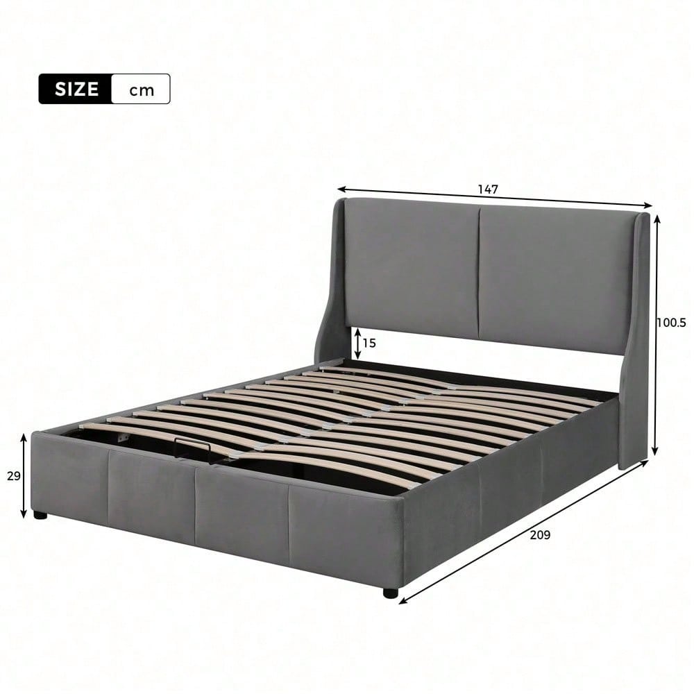 Caractéristiques du produit Sommeil confortable : Élégant lit rembourré au design épuré et doté d'une surface de couchage de 140 x 200 cm pour un sommeil réparateur, il est idéal pour votre chambre ou votre chambre d'amis. Espace de rangement : Des leviers hydrauliques sous le matelas permettent d'ouvrir le matelas pour ranger facilement vêtements et autres objets. Optimiser le rangement permet de garder une chambre propre et bien rangée, améliorant ainsi votre confort. Agréable au toucher : Le lit est recouvert de velours doux, doux et confortable, très agréable au toucher. Facile à installer : Le cadre de lit avec sommier à lattes est facile à assembler grâce à la notice de montage fournie. Le cadre de lit et le sommier à lattes enroulable sont inclus. Description Spécifications Type : Sommier à lattes. Un sommier à lattes est inclus. Détails Espaces de rangement Espace de rangement sous le lit Largeur du lit : 140 cm Longueur du lit : 200 cm Poids : 47 kg Largeur : 147 cm Longueur : 209 cm Largeur de la tête de lit : 147 cm Hauteur de la tête de lit : 100,5 cm Hauteur du chevet : 29 cm Remarque : Dimensions : Toutes les dimensions sont approximatives. Charge maximale : 300 kg Housse : Velours Couleur : Gris Matelas non inclus Livré démonté, en 2 colis (Ce produit sera livré en 2 colis. Ils pourraient ne pas arriver simultanément. Merci de patienter.)