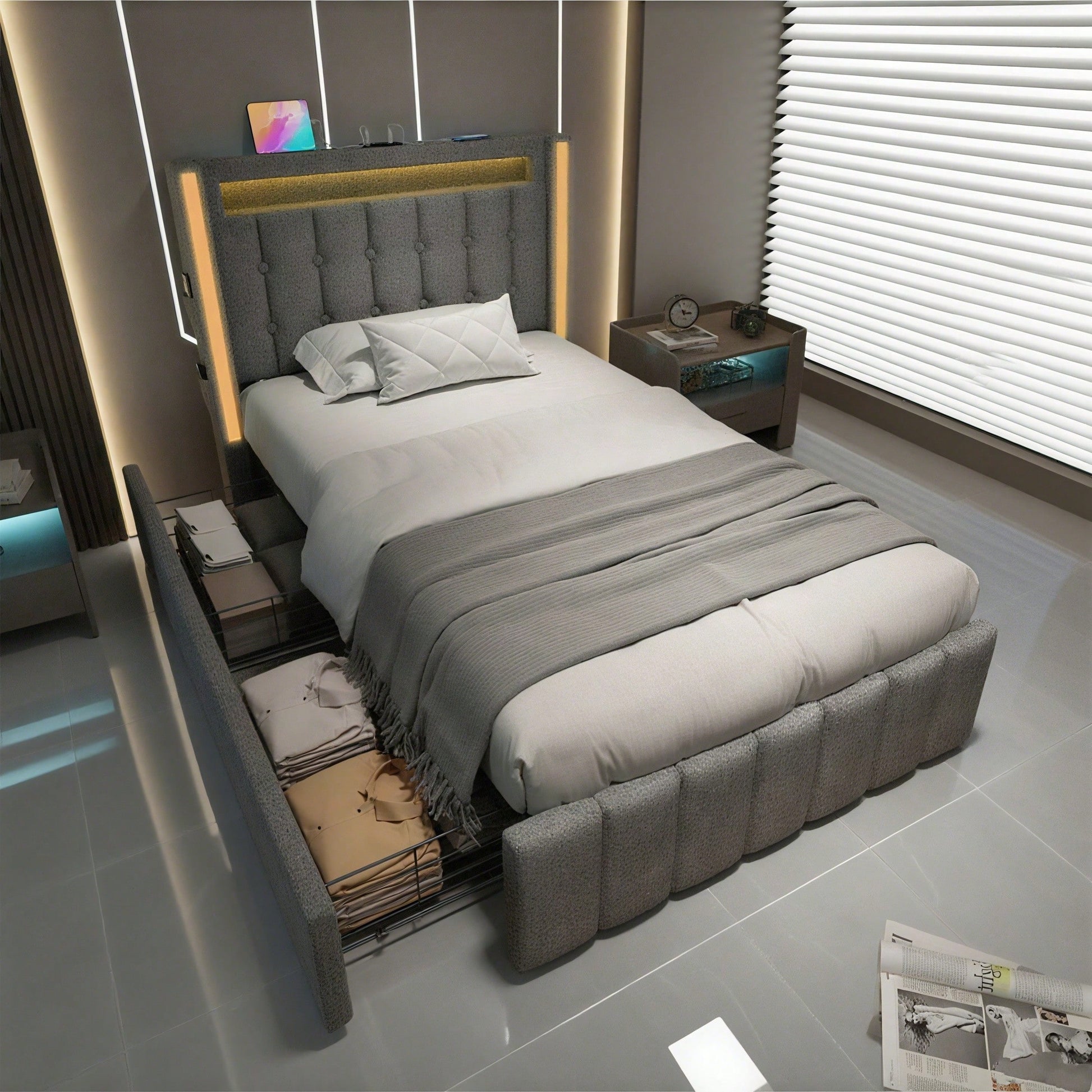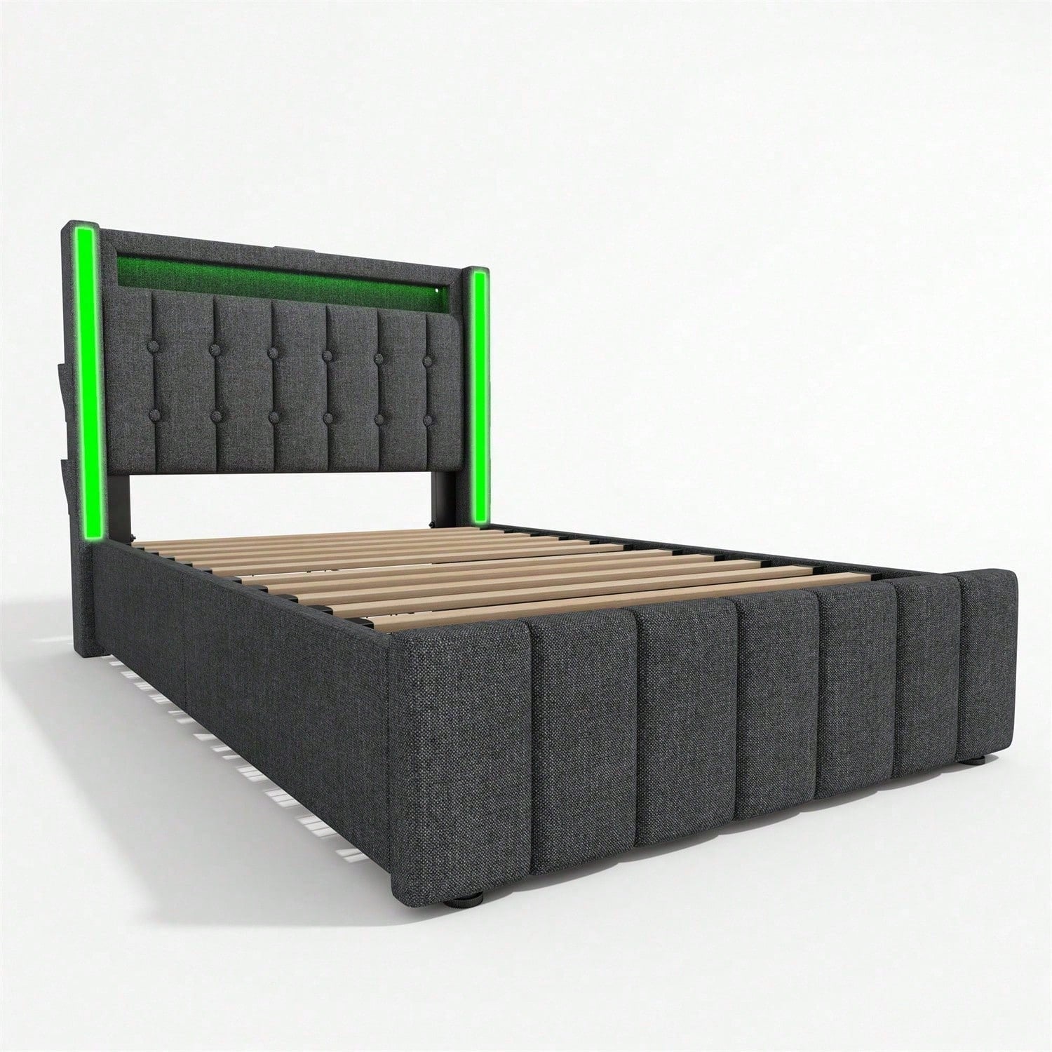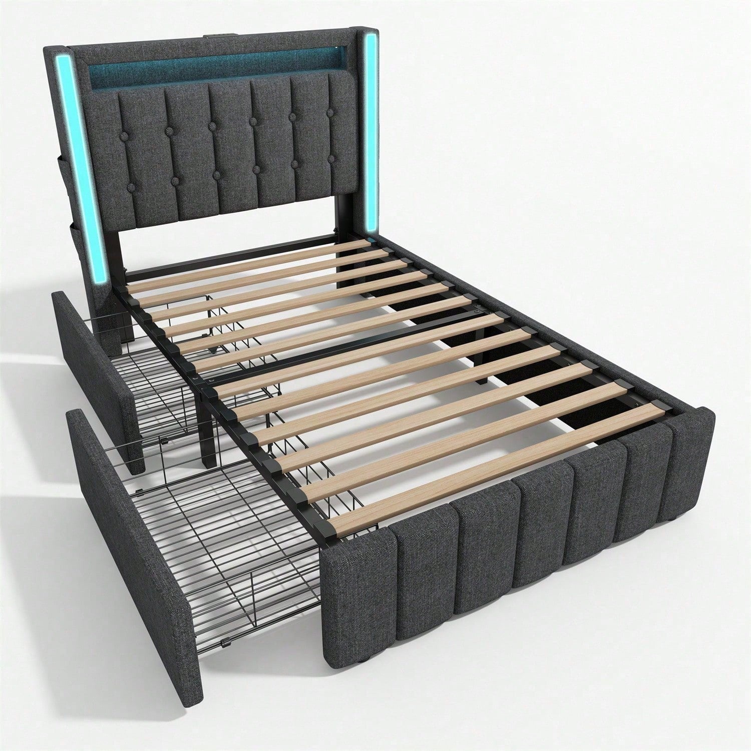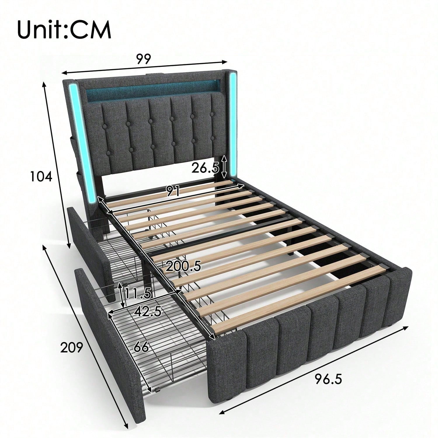 Le matelas est composé de 406 ressorts et de deux couches de mousse, à la fois moelleuses, offrant soutien et confort. Nous utilisons des textiles non toxiques, testés selon la norme Oeko-Tex Standard 100, sûrs et hypoallergéniques ! Fonction de charge intégrée : La tête de lit est dotée d'un port USB intégré et de deux poches de rangement multicouches à côté. Rechargez facilement vos appareils et gardez vos petits objets comme vos téléphones, vos lunettes et vos livres à portée de main. Les ports de charge, trois USB et un port Type-C, vous permettent de charger jusqu'à quatre appareils simultanément. Structure de lit LED intelligente : De nombreuses couleurs au choix, comme la luminosité, le mode flash, la minuterie, etc., sont facilement réglables grâce à la télécommande incluse ou à l'application mobile. Et ajoutez de la couleur à votre intérieur. Des bandes lumineuses LED de chaque côté du lit, avec plusieurs modes LED, créent une ambiance nocturne unique. Incroyable ! Design de rangement : Le lit simple est équipé de deux tiroirs qui peuvent être placés à gauche ou à droite selon la disposition de votre chambre. Couvre-lits et housses de couette peuvent y être facilement rangés. Qualité durable : Des bandes antidérapantes sont fixées aux joints des lattes pour éviter tout glissement du matelas. Les matériaux souples du sommier offrent non seulement un confort optimal, mais réduisent également efficacement les dommages causés par les angles et les arêtes vives que vous ou votre famille pourriez rencontrer lors de l'utilisation. Montage rapide et facile : Pour réduire les risques de dommages, ce cadre de lit est livré en trois cartons, dont les livraisons peuvent varier. Les bricoleurs n'ont pas à s'inquiéter : sa conception innovante facilite le montage, notamment grâce aux instructions claires et complètes fournies avec chaque achat et également disponibles en ligne. Description AB20340203G 90*200 WF323402AAG+WF323403AAG Dimensions hors tout : 99 x 209 x 104 cm (l x L x H) Matériau du panneau : Lin Couleur : Gris Charge max. Poids de l'utilisateur : 120 kg/264 lb Distance de la tête de lit : 26,5 cm Type de charge : 3 USB + 1 Type C Sommier requis : Non Assemblage requis : Oui Contenu : Cadre de lit, fonction de charge et tiroirs Matelas compatible (matelas non inclus) : 90 x 200 cm Quantité : 2 Dimensions intérieures des tiroirs : 66 x 42,5 x 11,5 cm Poids brut/net (kg) : 36,5 kg/31 kg WF280397AAA 90 x 200 cm Largeur : 90 cm Longueur : 200 cm Hauteur : 25 cm Construction : Matelas en mousse froide 7 zones Nombre de zones de couchage : 7 Niveau de couchage : H3 Poids jusqu'à 120 kg Nombre de ressorts : 406 pièces Positions de couchage : Sur le ventre, sur le côté, sur le dos Dormeur Informations allergènes : Convient aux personnes allergiques à la poussière Contrôle climatique : Excellente ventilation Caractéristiques : Le matelas peut être utilisé comme matelas réversible Caractéristiques : Housse : 100 % polyester (200 g/m²) Garnissage : Housse : Tissu double, 100 % polyester Âme : Ressorts ensachés + mousse ondulée Conseils d'entretien / Nombre de pièces : 1 pièce Livré enroulé