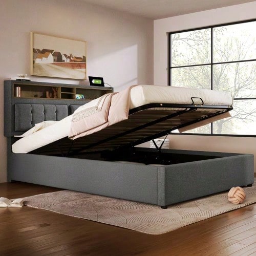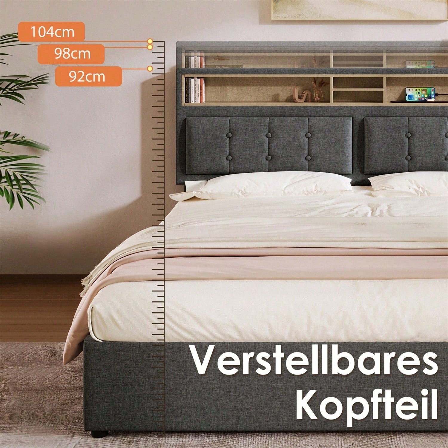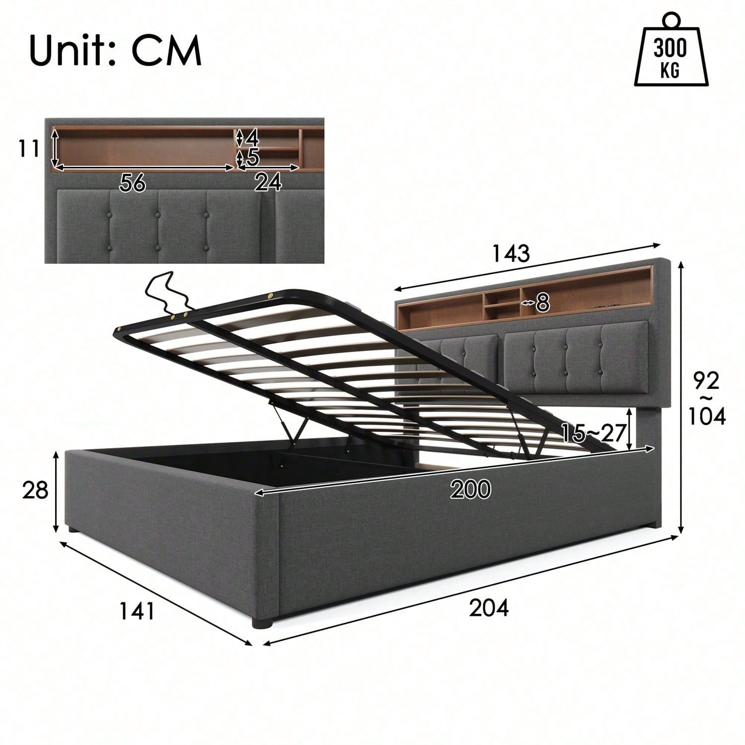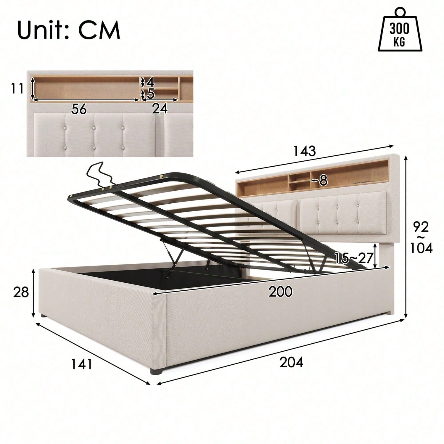 Tête de lit réglable : La tête de lit rembourrée est garnie d'une éponge épaisse et haute densité, vous permettant de vous détendre confortablement en vous adossant. La hauteur de la tête de lit est réglable sur environ 12 cm. Chaque personne, quelle que soit sa taille, peut trouver le confort optimal. Station de charge avec prises et ports USB : La prise intégrée à la tête de lit est un atout pratique : elle vous permet de recharger votre téléphone et votre tablette avant de vous coucher. Des ports USB/Type-C et des prises européennes sont également disponibles à la tête de lit. Rangement flexible et spacieux : La tête de lit de 50 cm de hauteur est dotée d'un design de rangement avec quatre compartiments spacieux. Un grand espace de rangement sous le sommier à lattes offre un espace suffisant pour ranger couvertures, oreillers ou linge de lit. Le sommier à lattes se replie facilement grâce à un vérin de levage. Un tissu Oxford est fixé sous le lit pour le protéger de la poussière. Détails bien pensés : Les sommiers à lattes sont fabriqués en bois massif et en métal, offrant une grande capacité de charge et un confort de couchage optimal. Les matériaux souples du lit offrent non seulement un toucher agréable, mais réduisent également efficacement les dommages causés par les angles et les arêtes vives que vous ou votre famille pourriez subir pendant l'utilisation. Informations détaillées : Pour réduire les risques de dommages, ce sommier est expédié en deux colis, dont la livraison peut être effectuée à des dates différentes. Si les deux colis sont arrivés mais qu'il manque des pièces, veuillez contacter le service client. Pour déplacer le lit, soulevez-le plutôt que de le traîner par terre. ***Veuillez noter que les couleurs du produit peuvent varier selon la luminosité.**** Description 042930AAB/042930AAG Lit rembourré 140 x 200 cm Dimensions hors tout : 143 x 204 x 92-104 cm (l x L x H) Matériau du panneau : Lin Couleur : Beige clair/Gris Poids maximal de l'utilisateur : 300 kg Distance de la tête de lit : 15-27 cm Tête de lit réglable ±12 cm Type de charge : 1 USB + 2 prises secteur + 1 type C Sommier requis : Non Assemblage requis : Oui Contenu du colis : Cadre de lit + prises secteur Matelas compatible (matelas non inclus) : 140 x 200 cm Poids brut/net (kg) : 48,5/44 Quantité : 2