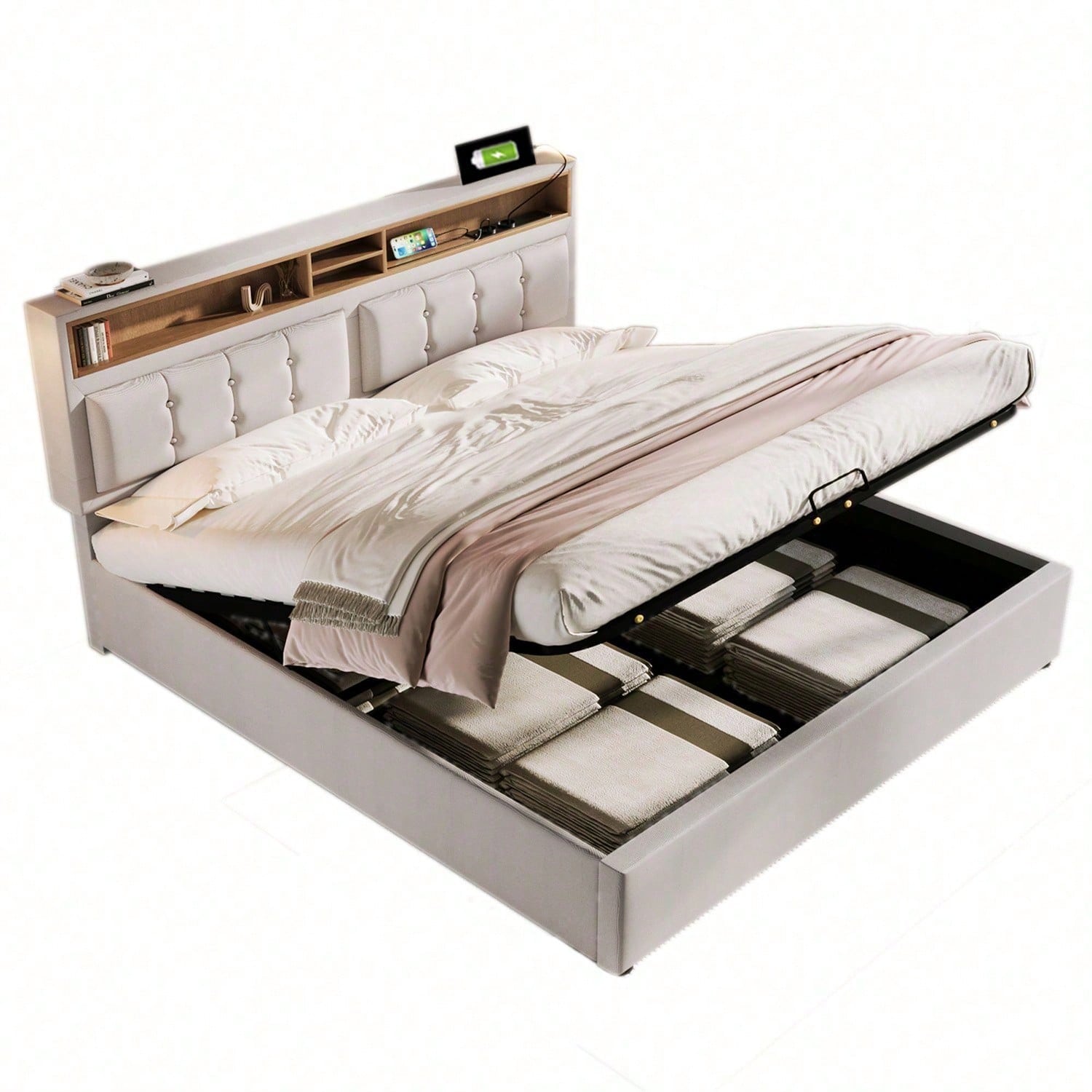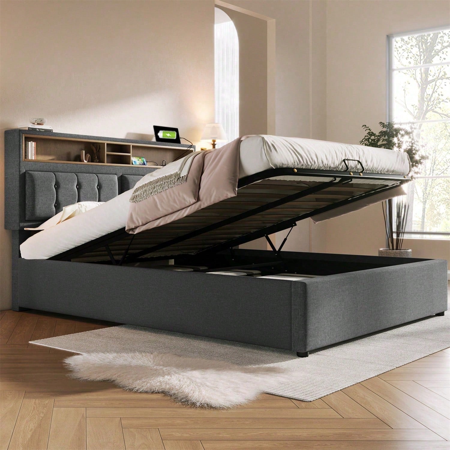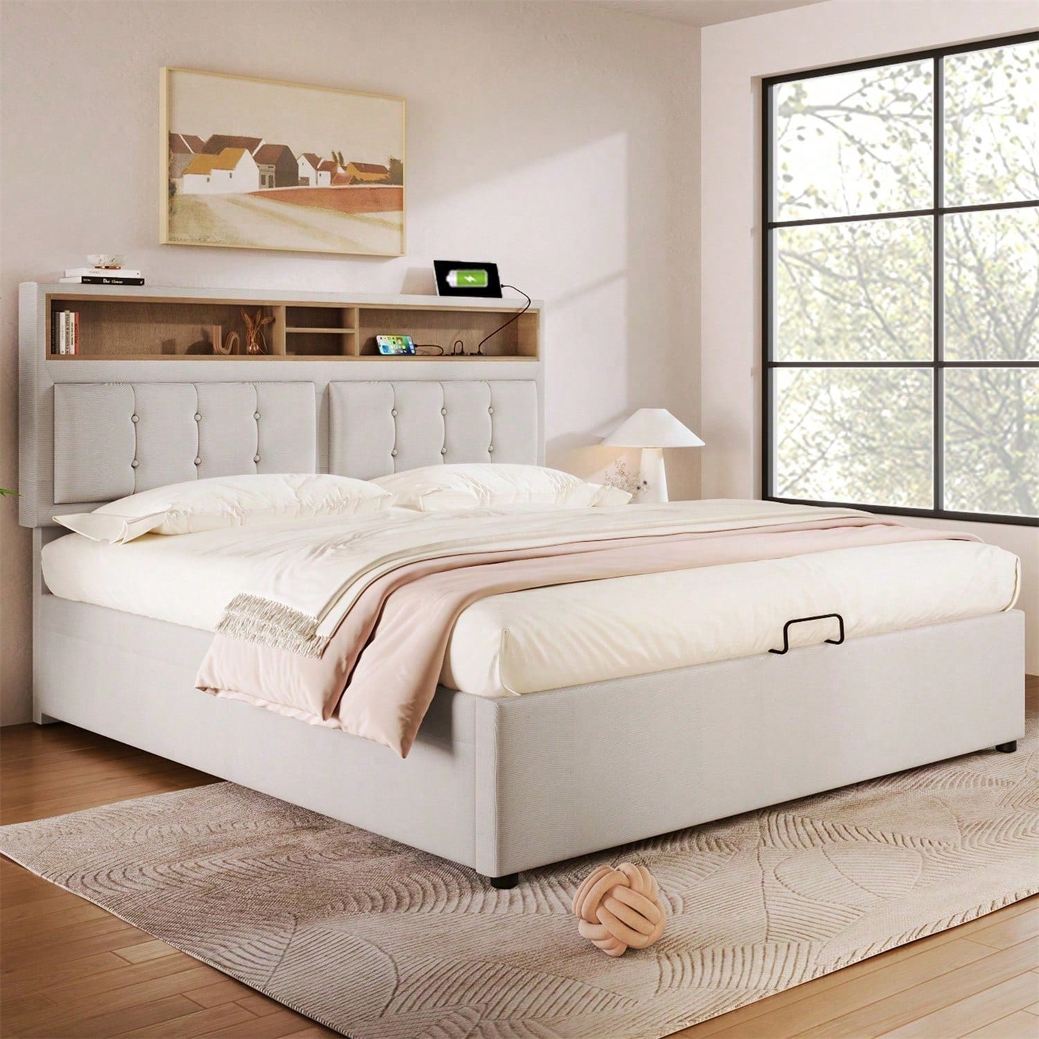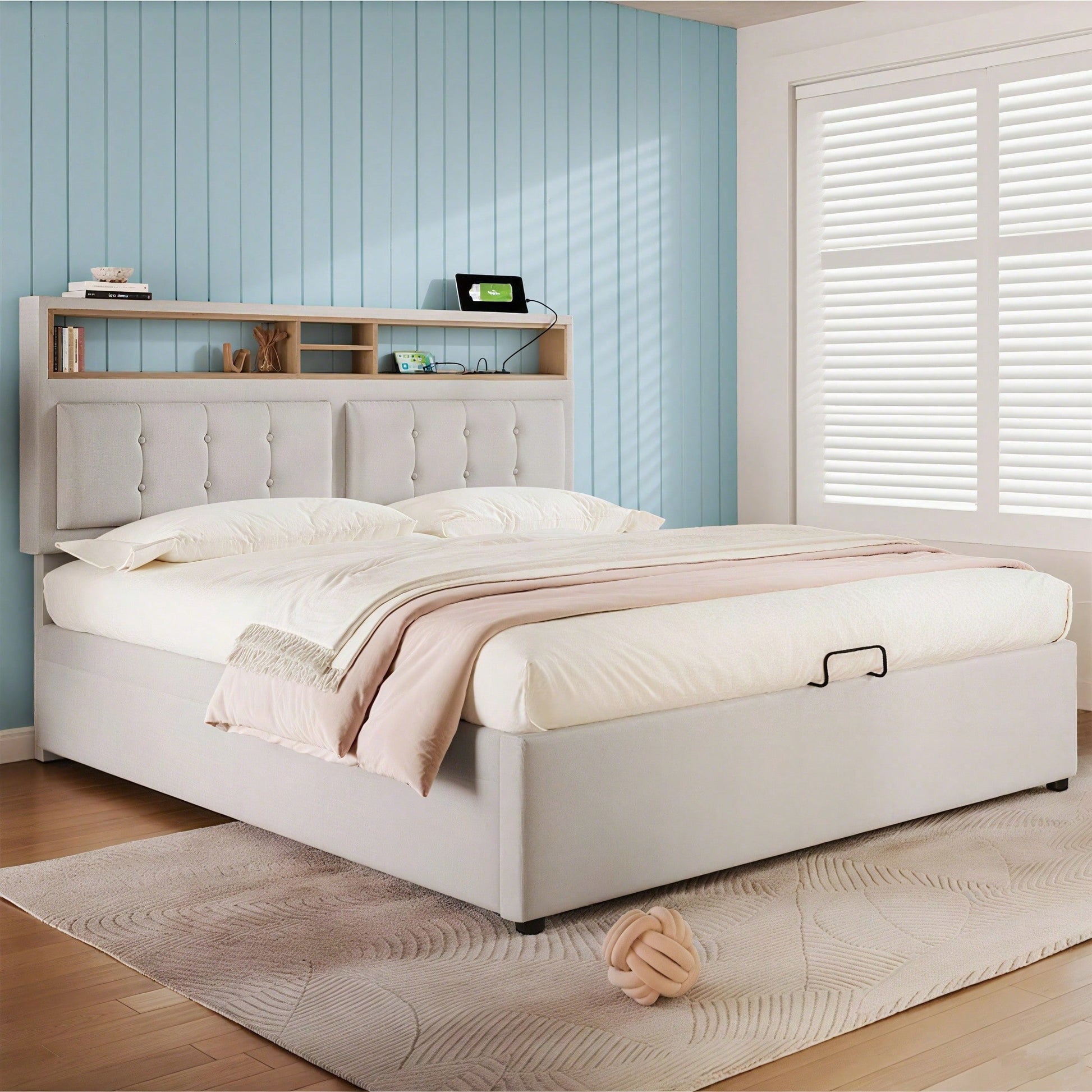 Tête de lit réglable : La tête de lit rembourrée est garnie d'une éponge épaisse et haute densité, vous permettant de vous détendre confortablement en vous adossant. La hauteur de la tête de lit est réglable sur environ 12 cm. Chaque personne, quelle que soit sa taille, peut trouver le confort optimal. Station de charge avec prises et ports USB : La prise intégrée à la tête de lit est un atout pratique : elle vous permet de recharger votre téléphone et votre tablette avant de vous coucher. Des ports USB/Type-C et des prises européennes sont également disponibles à la tête de lit. Rangement flexible et spacieux : La tête de lit de 50 cm de hauteur est dotée d'un design de rangement avec quatre compartiments spacieux. Un grand espace de rangement sous le sommier à lattes offre un espace suffisant pour ranger couvertures, oreillers ou linge de lit. Le sommier à lattes se replie facilement grâce à un vérin de levage. Un tissu Oxford est fixé sous le lit pour le protéger de la poussière. Détails bien pensés : Les sommiers à lattes sont fabriqués en bois massif et en métal, offrant une grande capacité de charge et un confort de couchage optimal. Les matériaux souples du lit offrent non seulement un toucher agréable, mais réduisent également efficacement les dommages causés par les angles et les arêtes vives que vous ou votre famille pourriez subir pendant l'utilisation. Informations détaillées : Pour réduire les risques de dommages, ce sommier est expédié en deux colis, dont la livraison peut être effectuée à des dates différentes. Si les deux colis sont arrivés mais qu'il manque des pièces, veuillez contacter le service client. Pour déplacer le lit, soulevez-le plutôt que de le traîner par terre. ***Veuillez noter que les couleurs du produit peuvent varier selon la luminosité.**** Description 042930AAB/042930AAG Lit rembourré 140 x 200 cm Dimensions hors tout : 143 x 204 x 92-104 cm (l x L x H) Matériau du panneau : Lin Couleur : Beige clair/Gris Poids maximal de l'utilisateur : 300 kg Distance de la tête de lit : 15-27 cm Tête de lit réglable ±12 cm Type de charge : 1 USB + 2 prises secteur + 1 type C Sommier requis : Non Assemblage requis : Oui Contenu du colis : Cadre de lit + prises secteur Matelas compatible (matelas non inclus) : 140 x 200 cm Poids brut/net (kg) : 48,5/44 Quantité : 2