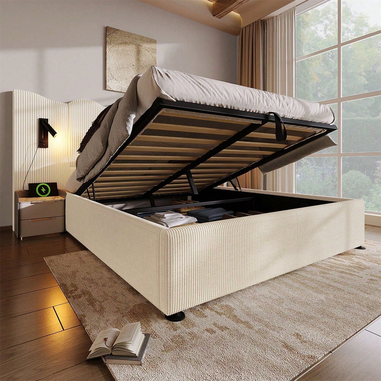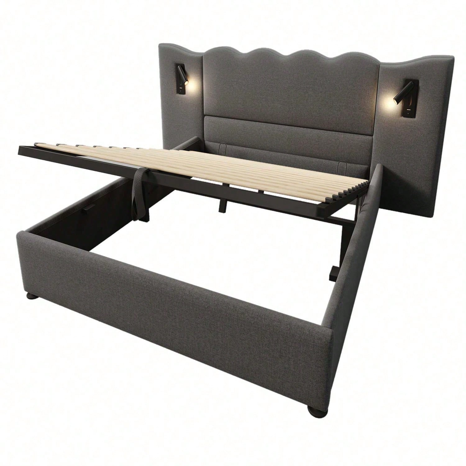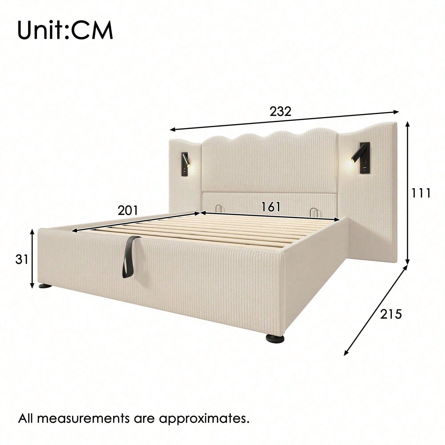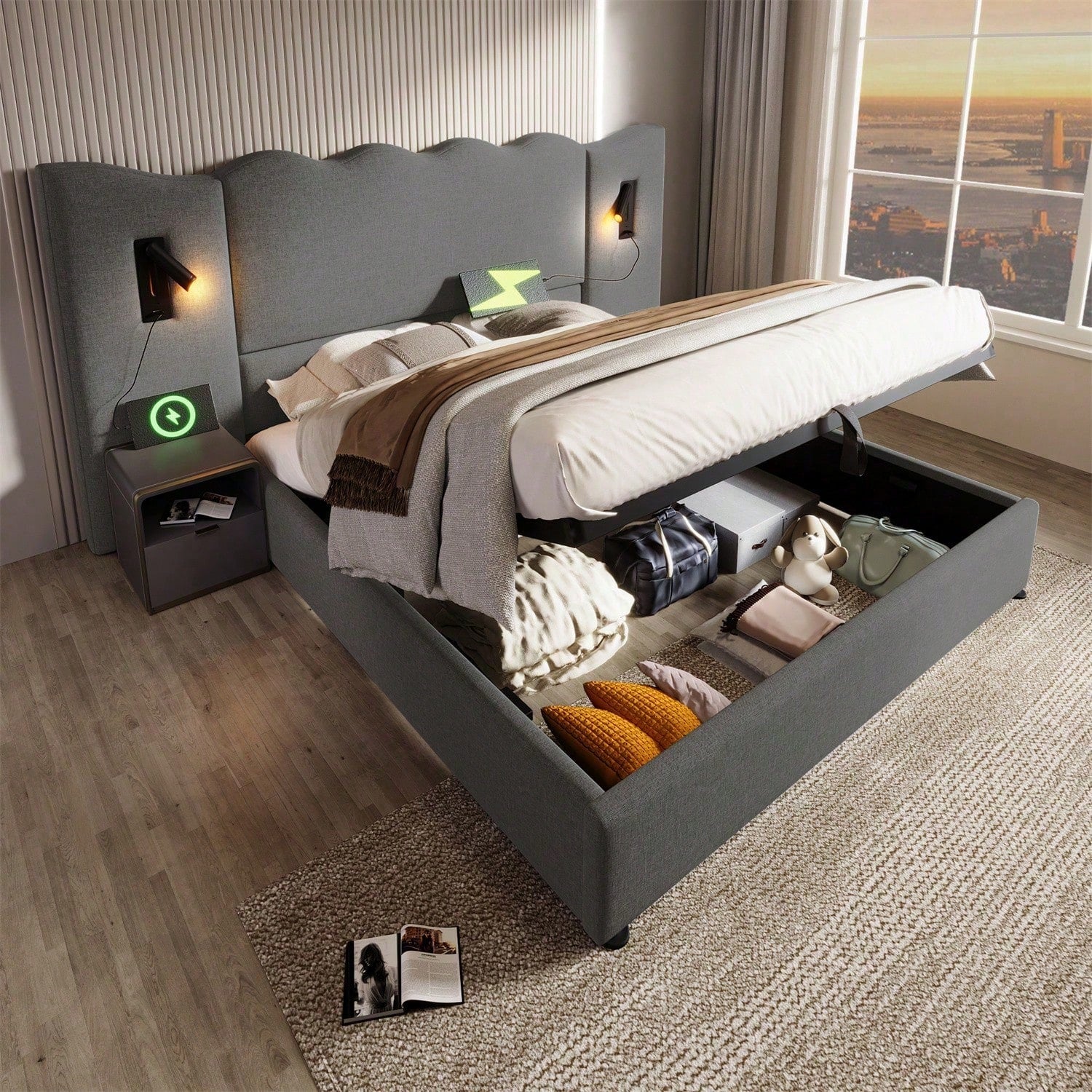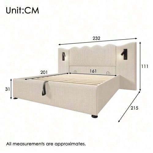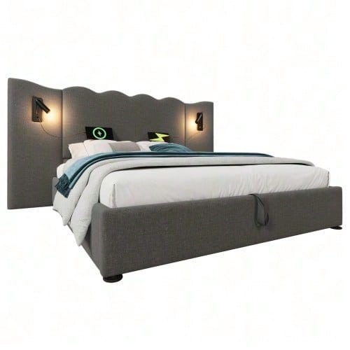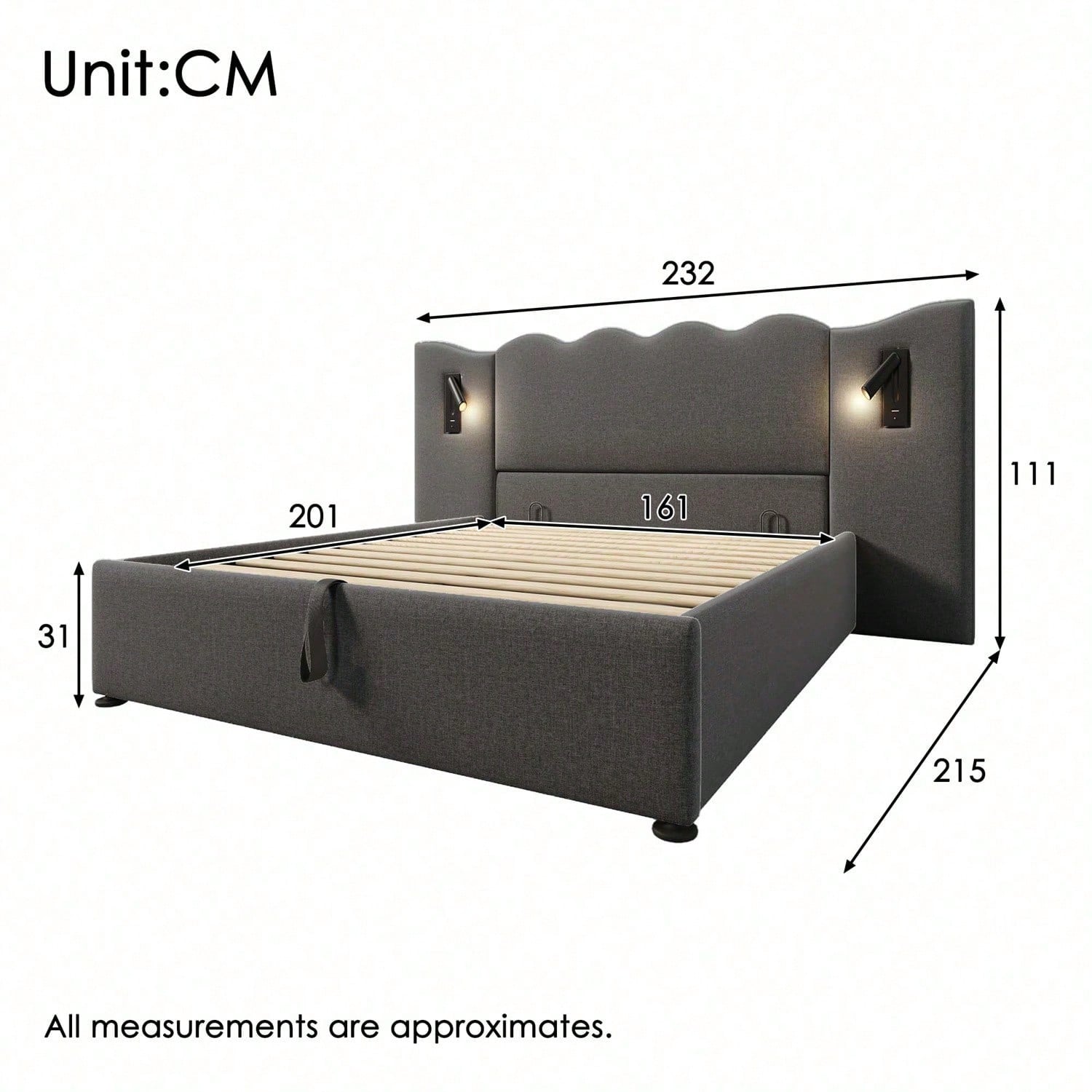 Le matelas est composé de 720 ressorts et de deux couches de mousse, à la fois moelleuses, offrant soutien et confort. Nous utilisons des textiles non toxiques, testés selon la norme Oeko-Tex Standard 100, sûrs et hypoallergéniques ! Tête de lit en lin et forme ondulée : Son motif ondulé, élégant et moderne, crée une ambiance élégante et sublime n'importe quelle chambre. Le lin sélectionné allie respirabilité et durabilité, pour un confort optimal et une expérience de sommeil agréable. Liseuse rotative : La tête de lit est équipée d'une liseuse pratique, pivotante à 360 degrés. Aucun interrupteur n'est nécessaire : il suffit de la soulever pour l'allumer et de la baisser pour l'éteindre. Fonction de charge USB-C : La liseuse est équipée de ports USB et Type-C modernes, permettant de recharger facilement et efficacement divers appareils. Smartphone, tablette ou autres appareils électroniques : grâce à ces ports, vous disposez toujours d'une solution de charge pratique à proximité de votre lit. Lit coffre hydraulique : Le cadre de lit est équipé de vérins hydrauliques de haute qualité et d'une sangle au pied pour une montée et une descente faciles. Le grand espace de rangement sous le lit offre un espace généreux pour ranger couvertures, oreillers et autres objets, optimisant ainsi l'espace disponible. Un espace d'environ 33 cm près de la tête de lit peut accueillir une table de chevet, offrant un espace de rangement supplémentaire et des fonctions pratiques. Structure stable : Le cadre de lit est composé d'une structure métallique et de lattes en bois massif. Le sommier est équipé de pieds de support métalliques, ce qui renforce sa stabilité. La conception encastrée et les lattes métalliques empêchent le matelas de glisser, garantissant une utilisation stable et confortable. Remarque : En raison des différences d'éclairage ambiant, la couleur réelle peut différer de l'image. Afin de réduire les risques de dommages, le cadre de lit est expédié en quatre colis et peut arriver à des dates différentes. Si les quatre colis arrivent mais que des articles sont manquants, veuillez contacter le service client. Description AB30747890G:N616P227478G/N616P227479G/N616P227480G Dimensions hors tout : 232 x 215 x 111 cm (l x L x H) Matériau du panneau : Métal + Lin + Bois massif Couleur : Gris Capacité max. Poids de l'utilisateur : 200 kg/440 lb Sommier requis : Non Assemblage requis : Oui Chargement : USB Type 2 + Type C Contenu : Cadre de lit + chargeur + lampe de lecture Matelas compatible (matelas non inclus) : 160 x 200 cm Poids brut/net (kg) : 63,4/55,5 Quantité : 3 WF307675AAA Matelas à ressorts 160 x 200 cm Dimensions hors tout : 160 x 200 x 25 cm (l x L x H) Construction : Matelas en mousse froide 7 zones Nombre de zones de couchage : 7 Niveau de confort : H3 Poids corporel jusqu'à 200 kg Nombre de ressorts : 720 pièces Position de couchage : sur le ventre, sur le côté ou sur le dos Informations allergènes : Convient aux personnes allergiques à la poussière Climatisation : Excellente ventilation Caractéristiques du matelas : Réversible Matelas Caractéristiques de la housse : 100 % polyester (200 g/m²) Garnissage : Housse : Tissu double, 100 % polyester Âme : Ressorts ensachés + mousse ondulée Conseils d'entretien / Nombre de ressorts : 1 pièce Livré enroulé