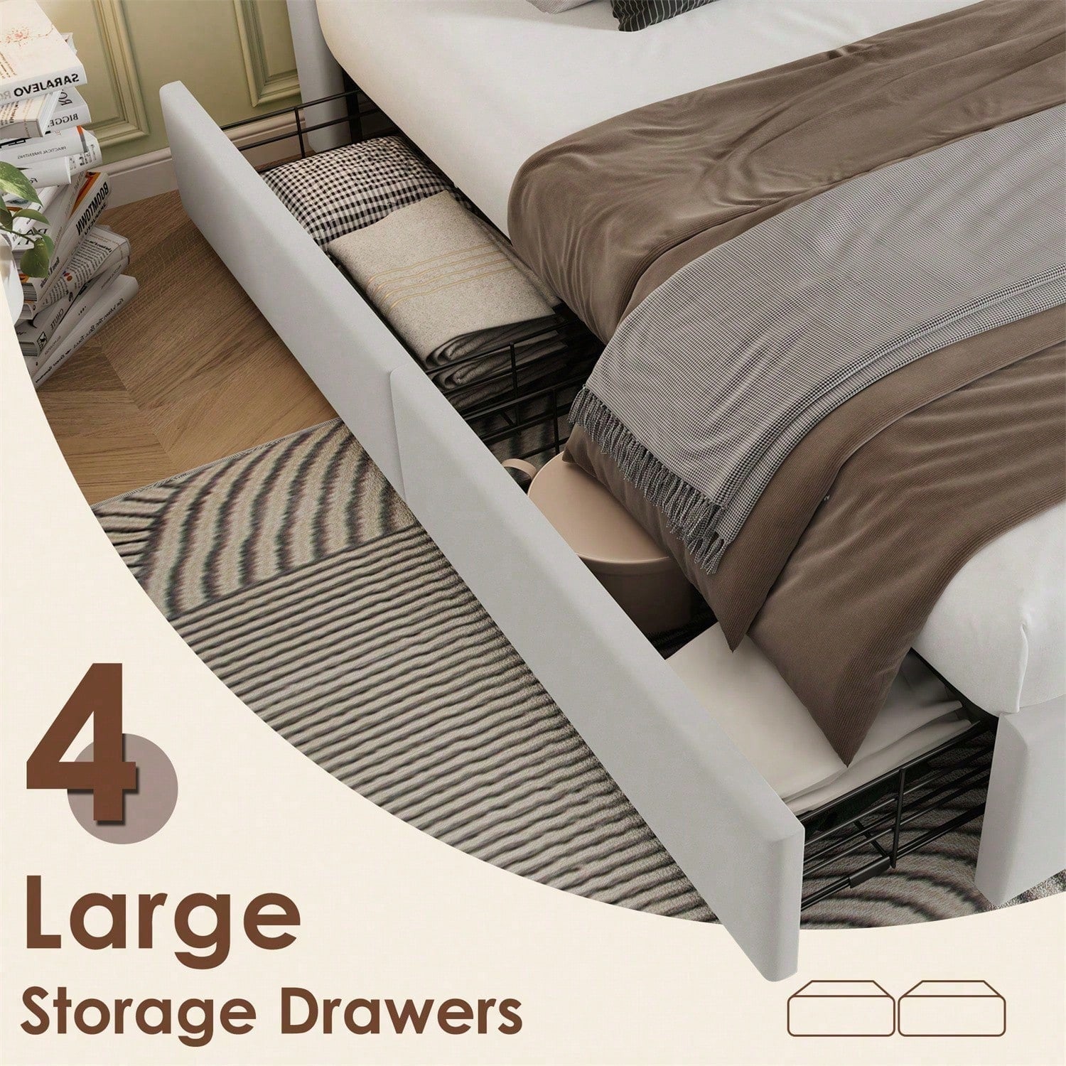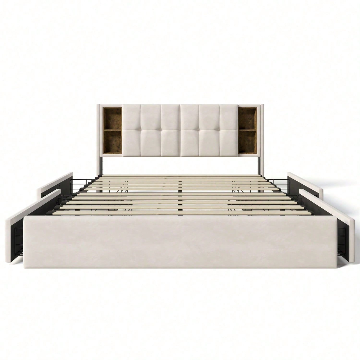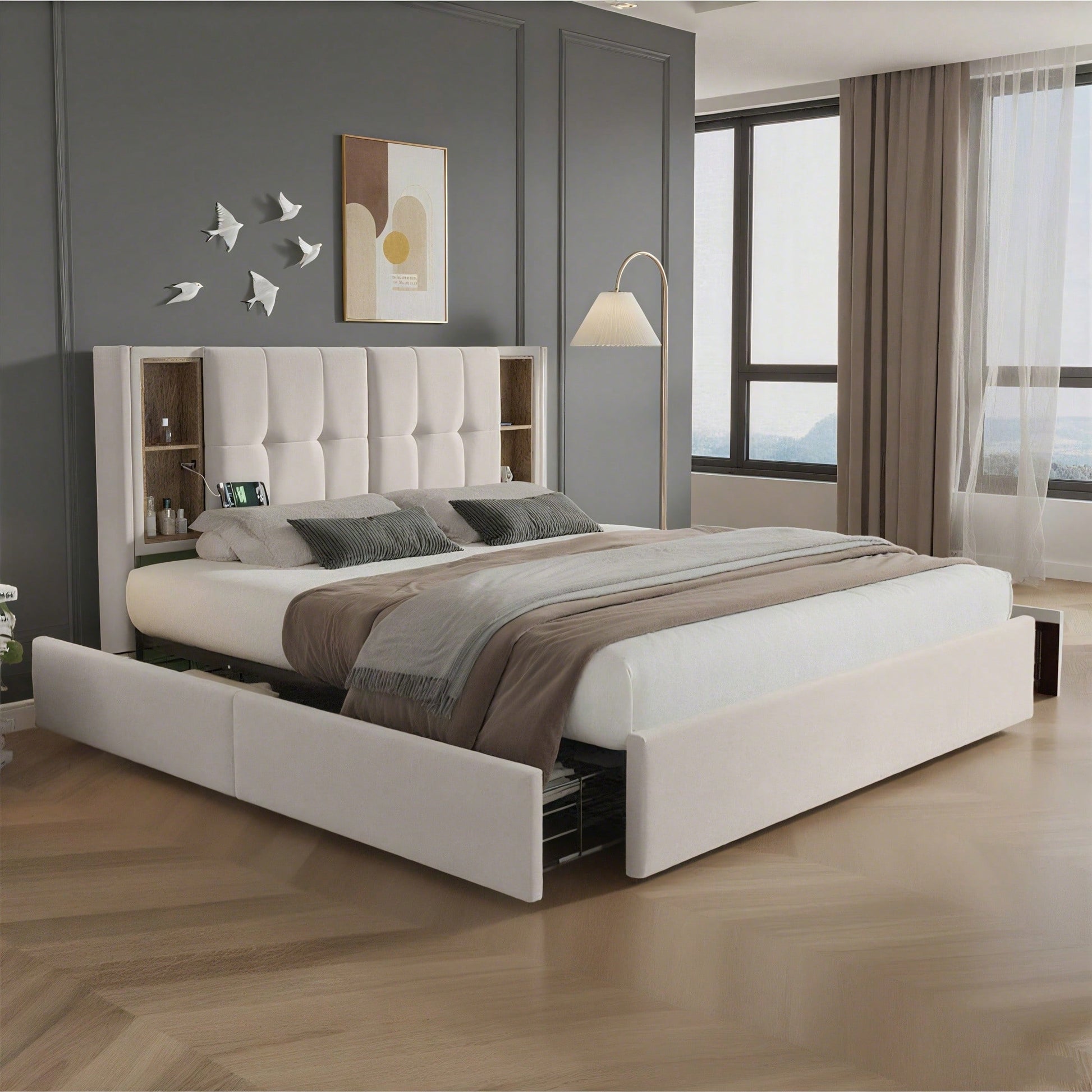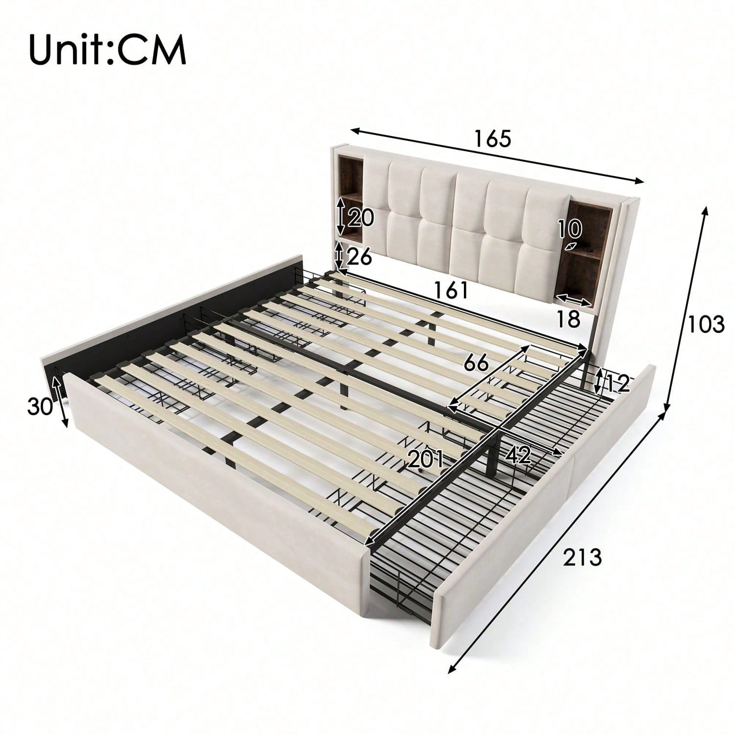 Tête de lit avec recharge sans fil et ports USB : Ce nouveau lit capitonné combine deux fonctions : recharge sans fil et rangement. Avec ses quatre compartiments de rangement ouverts à la tête de lit et ses ports de chargement à gauche et à droite, il convient parfaitement à un foyer de deux personnes, tant en termes de capacité de charge que de design. Recharge sans fil : Posez simplement votre téléphone sur la station de charge et profitez d'une recharge sans fil rapide. Après des tests approfondis et les retours de nos clients, nous utilisons des puces de charge hautes performances et des composants électroniques de pointe pour garantir la qualité de la station de charge. Il faut environ 2 à 4 heures pour recharger complètement votre téléphone. **Veuillez noter que la recharge sans fil est uniquement compatible avec les téléphones portables équipés de cette technologie. Conception du rangement : Le lit est équipé de quatre tiroirs de grande capacité. Deux côtés du lit sont équipés de boucles de fixation pour fixer solidement le tiroir au lit lorsqu'il n'est pas utilisé, pour une chambre bien rangée. Les compartiments de rangement se déploient et se rétractent facilement grâce aux roulettes situées sous le lit. Pratique et design : Ce lit allie habilement design élégant et confort optimal. Des boutons décoratifs rehaussent la tête de lit et lui confèrent une touche moderne. Le cadre de lit, principalement en fer, est durable et peut supporter jusqu'à 200 kg. Les pieds de soutien supplémentaires sur la barre centrale assurent une stabilité optimale. Informations détaillées : Pour réduire les risques de dommages, ce cadre de lit sera expédié en deux colis, dont la livraison peut être effectuée à des dates différentes. Si des pièces manquent dans les deux colis, veuillez contacter le service client. Pour déplacer le lit, soulevez-le plutôt que de le traîner par terre. Description WF321243AAB/WF321244AAB 160 x 200 cm Dimensions hors tout : 165 x 213 x 103 cm (l x L x H) Matériau du panneau : Velours Couleur : Beige Charge max. Poids de l'utilisateur : 200 kg / 440 lb Distance de la tête de lit : 26 cm Type de chargement : Chargement sans fil + USB + Type-C Sommier requis : Non Assemblage requis : Oui Contenu du colis : Cadre de lit + Station de chargement + Tiroirs*4 Conception unique : Station de chargement par induction Matelas compatible (matelas non inclus) : 160 x 200 cm Quantité par colis : 2 Dimensions intérieures des tiroirs : 66 x 42 x 12 cm (l x L x H) Poids brut/net (kg) : 53,4/50 Matelas WF307675AAA Dimensions hors tout : 160 x 200 x 25 cm (l x L x H) Construction : Matelas en mousse froide 7 zones Nombre de zones de couchage : 7 Niveau de couchage : H3 Poids corporel jusqu'à 200 kg Nombre de ressorts : 720 pièces Position de couchage : sur le ventre Dormeur sur le côté/sur le dos Informations allergènes : Convient aux personnes allergiques à la poussière Contrôle de la température : Excellente ventilation Caractéristiques : Housse de matelas : 100 % polyester (200 g/m²) Garnissage : 100 % polyester Âme : Ressorts ensachés + mousse ondulée Conseils d'entretien / Nombre de ressorts : 1 pièce Livré enroulé